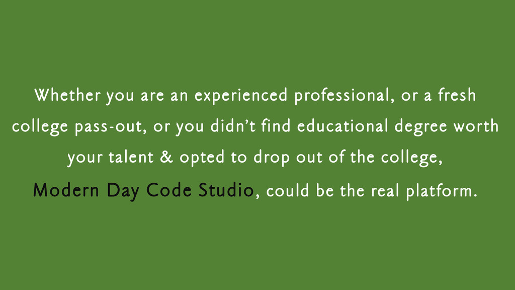 pass-out, or you didn’t find educational degree worth your talent & opted to drop out of the college, Modern Day Code Studio, could be the real platform.