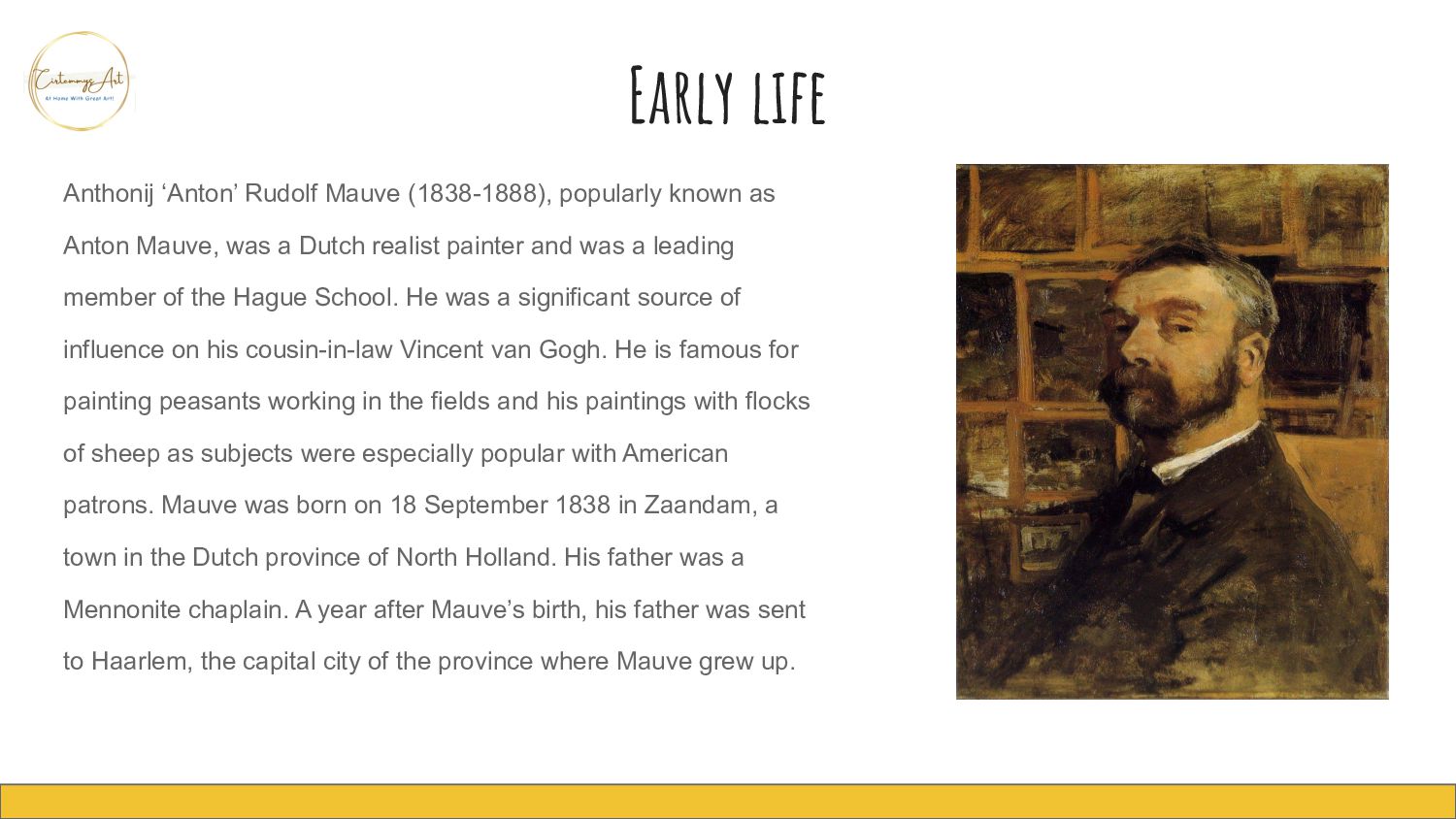 Anton Mauve, was a Dutch realist painter and was a leading member of the Hague School. He was a significant source of influence on his cousin-in-law Vincent van Gogh. He is famous for painting peasants working in the fields and his paintings with flocks of sheep as subjects were especially popular with American patrons. Mauve was born on 18 September 1838 in Zaandam, a town in the Dutch province of North Holland. His father was a Mennonite chaplain. A year after Mauve’s birth, his father was sent to Haarlem, the capital city of the province where Mauve grew up.