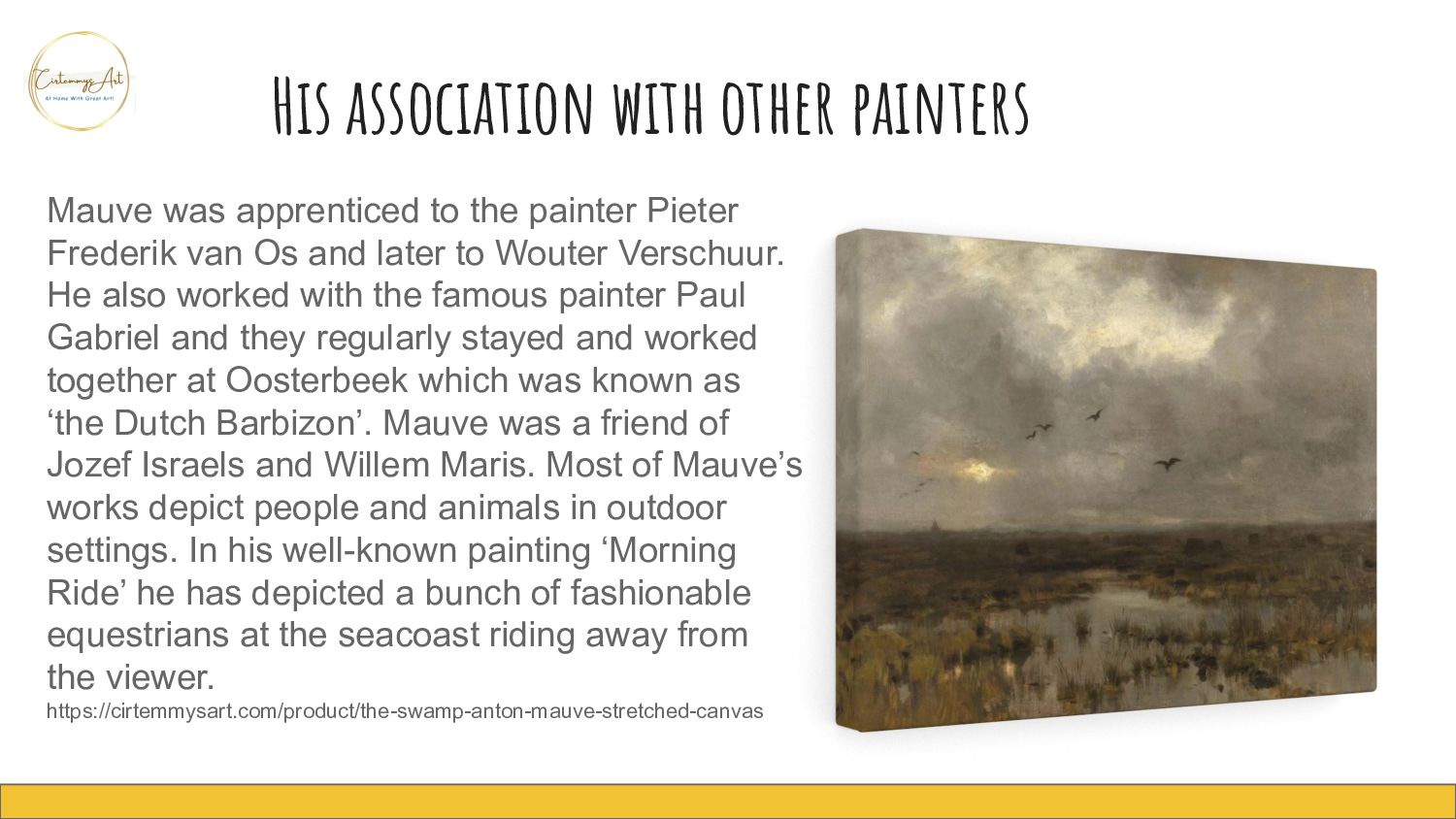 painter Pieter Frederik van Os and later to Wouter Verschuur. He also worked with the famous painter Paul Gabriel and they regularly stayed and worked together at Oosterbeek which was known as ‘the Dutch Barbizon’. Mauve was a friend of Jozef Israels and Willem Maris. Most of Mauve’s works depict people and animals in outdoor settings. In his well-known painting ‘Morning Ride’ he has depicted a bunch of fashionable equestrians at the seacoast riding away from the viewer. https://cirtemmysart.com/product/the-swamp-anton-mauve-stretched-canvas