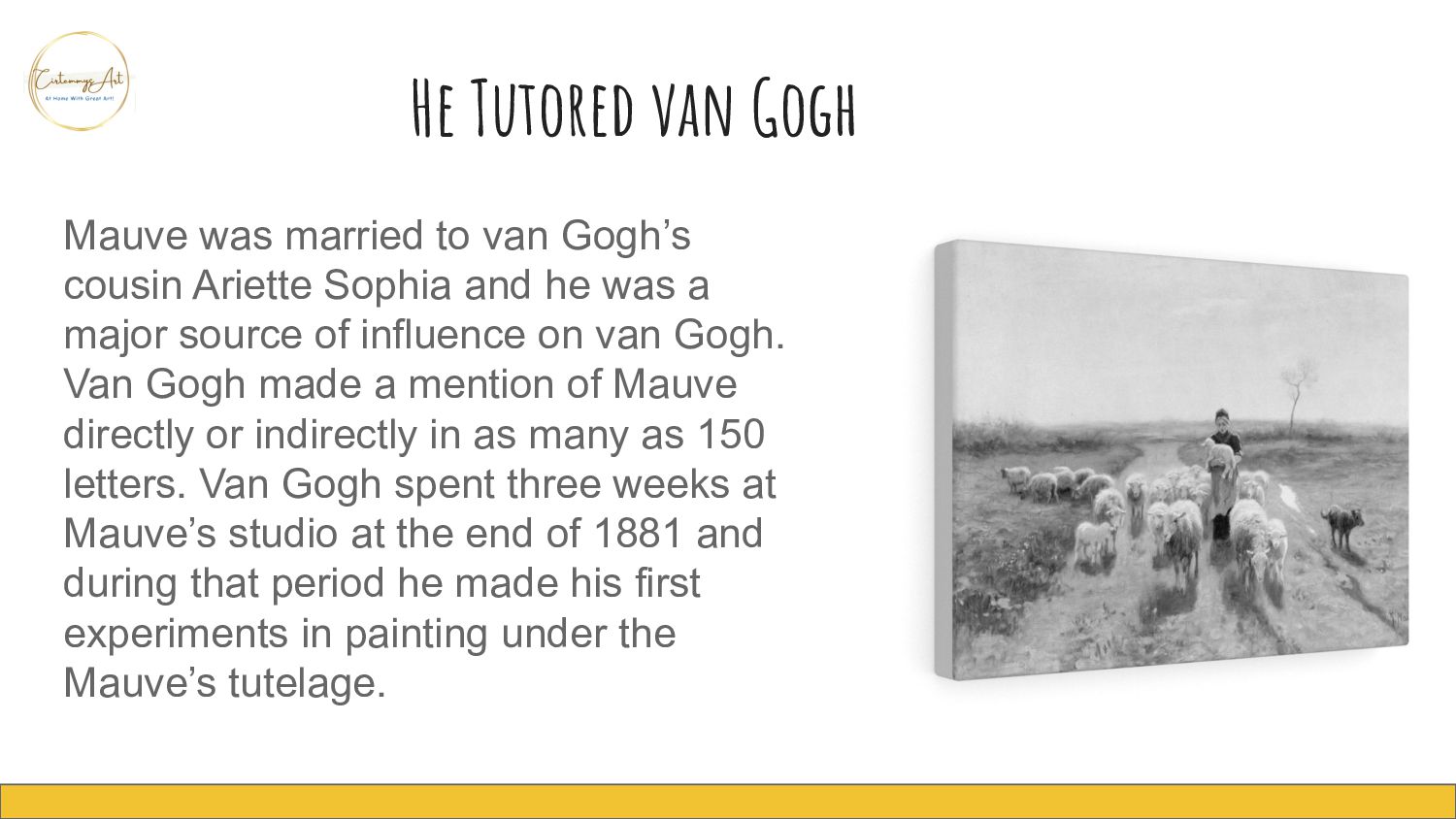 cousin Ariette Sophia and he was a major source of influence on van Gogh. Van Gogh made a mention of Mauve directly or indirectly in as many as 150 letters. Van Gogh spent three weeks at Mauve’s studio at the end of 1881 and during that period he made his first experiments in painting under the Mauve’s tutelage.