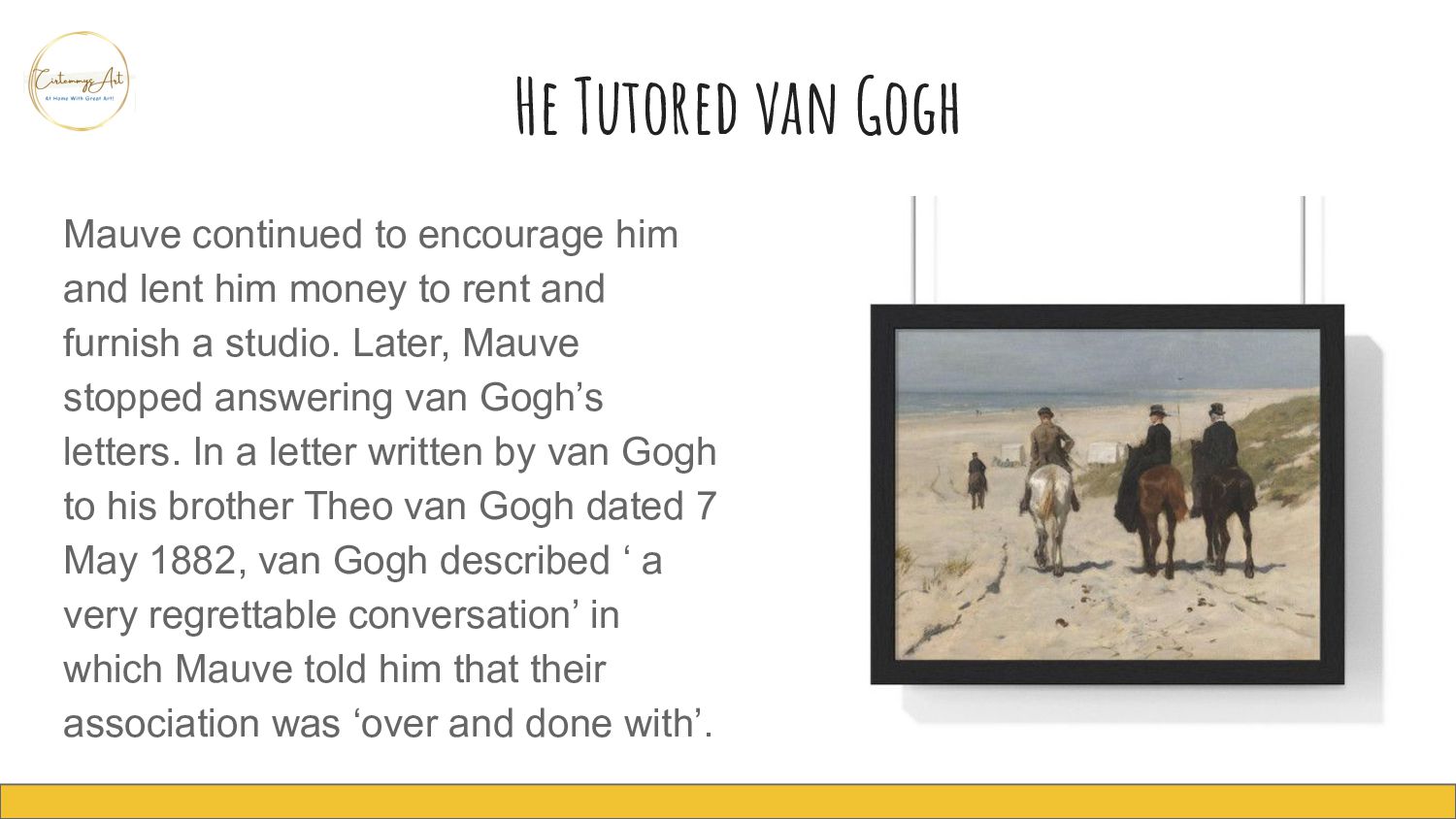 lent him money to rent and furnish a studio. Later, Mauve stopped answering van Gogh’s letters. In a letter written by van Gogh to his brother Theo van Gogh dated 7 May 1882, van Gogh described ‘ a very regrettable conversation’ in which Mauve told him that their association was ‘over and done with’.