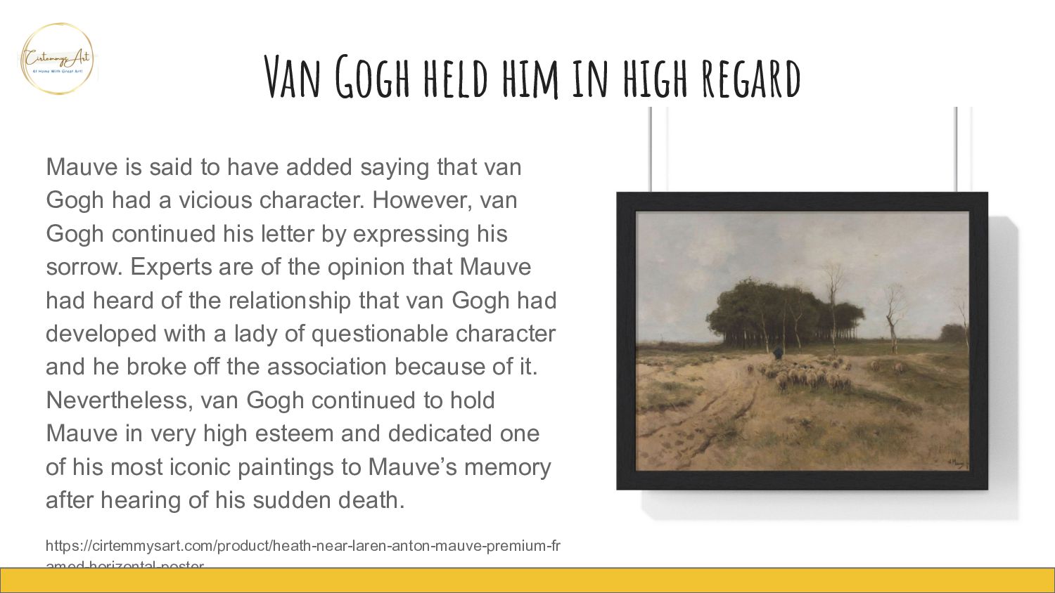 to have added saying that van Gogh had a vicious character. However, van Gogh continued his letter by expressing his sorrow. Experts are of the opinion that Mauve had heard of the relationship that van Gogh had developed with a lady of questionable character and he broke off the association because of it. Nevertheless, van Gogh continued to hold Mauve in very high esteem and dedicated one of his most iconic paintings to Mauve’s memory after hearing of his sudden death. https://cirtemmysart.com/product/heath-near-laren-anton-mauve-premium-fr amed-horizontal-poster