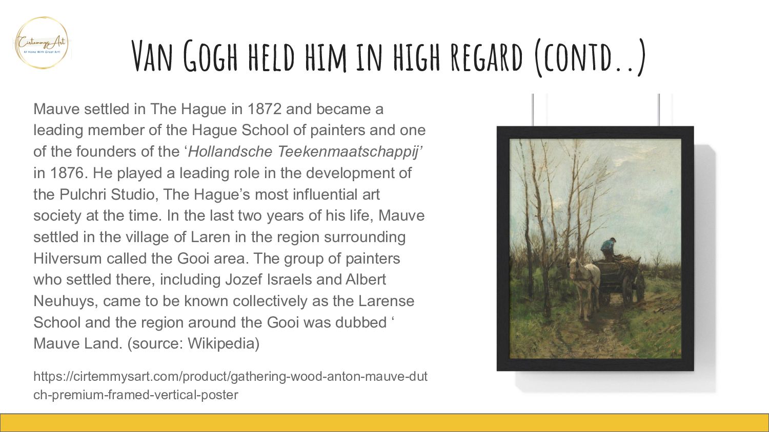 in The Hague in 1872 and became a leading member of the Hague School of painters and one of the founders of the ‘Hollandsche Teekenmaatschappij’ in 1876. He played a leading role in the development of the Pulchri Studio, The Hague’s most influential art society at the time. In the last two years of his life, Mauve settled in the village of Laren in the region surrounding Hilversum called the Gooi area. The group of painters who settled there, including Jozef Israels and Albert Neuhuys, came to be known collectively as the Larense School and the region around the Gooi was dubbed ‘ Mauve Land. (source: Wikipedia) https://cirtemmysart.com/product/gathering-wood-anton-mauve-dut ch-premium-framed-vertical-poster