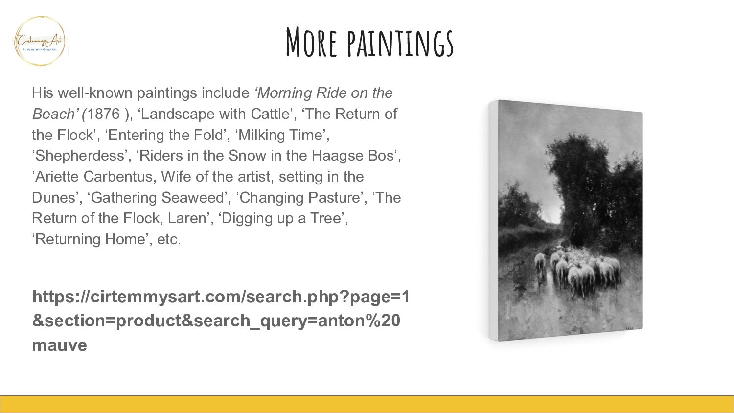 Beach’ (1876 ), ‘Landscape with Cattle’, ‘The Return of the Flock’, ‘Entering the Fold’, ‘Milking Time’, ‘Shepherdess’, ‘Riders in the Snow in the Haagse Bos’, ‘Ariette Carbentus, Wife of the artist, setting in the Dunes’, ‘Gathering Seaweed’, ‘Changing Pasture’, ‘The Return of the Flock, Laren’, ‘Digging up a Tree’, ‘Returning Home’, etc. https://cirtemmysart.com/search.php?page=1 §ion=product&search_query=anton%20 mauve
