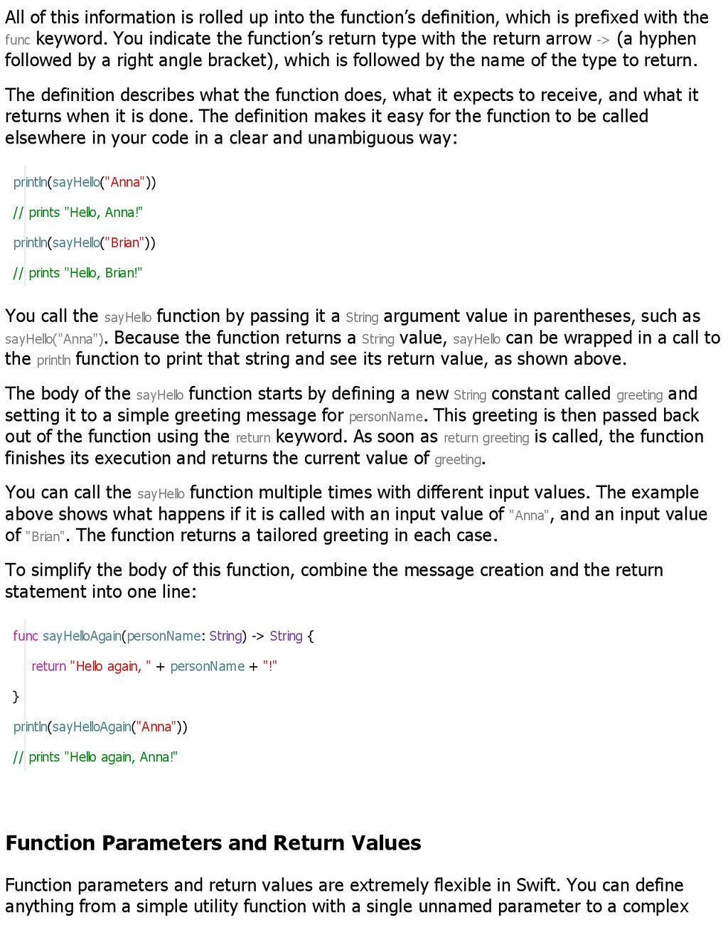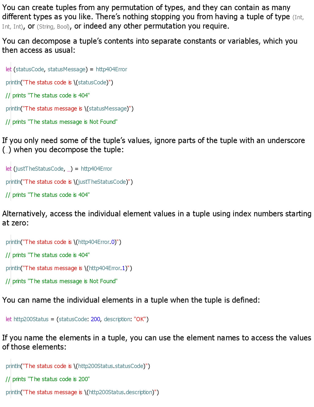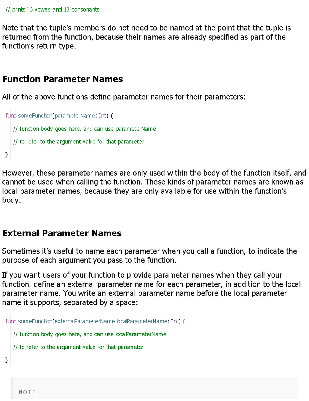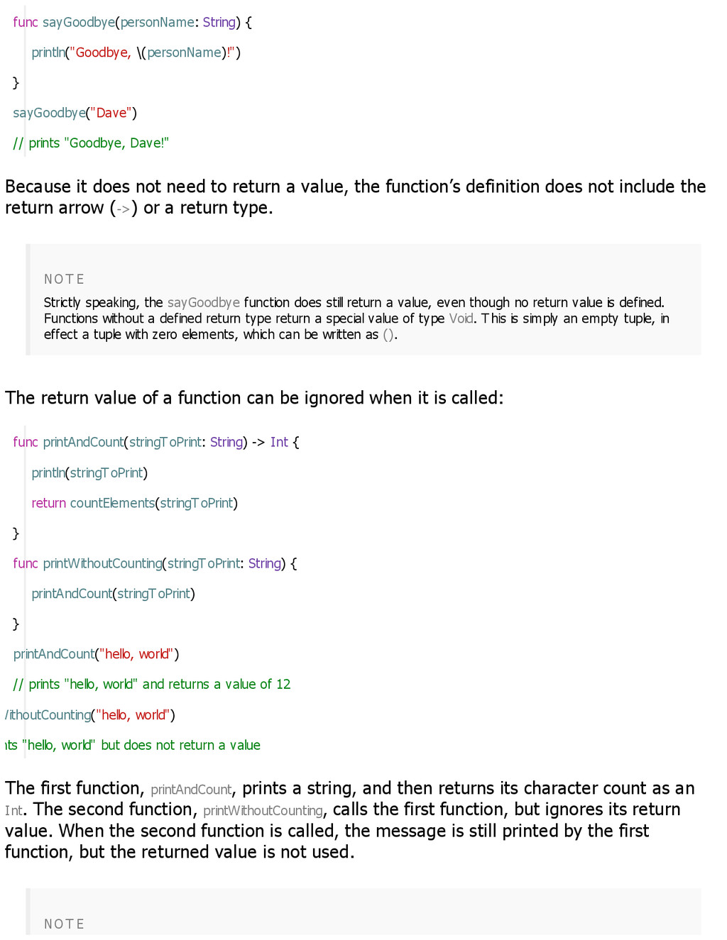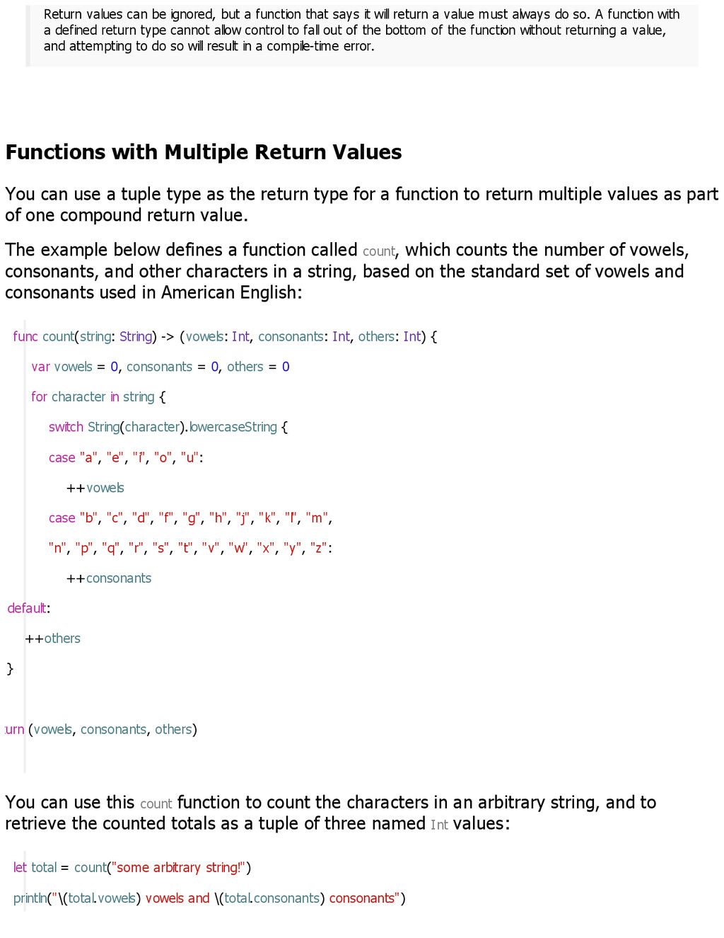 it will return a value must always do so. A function with a defined return type cannot allow control to fall out of the bottom of the function without returning a value, and attempting to do so will result in a compile-time error. Functions with Multiple Return Values You can use a tuple type as the return type for a function to return multiple values as part of one compound return value. The example below defines a function called count, which counts the number of vowels, consonants, and other characters in a string, based on the standard set of vowels and consonants used in American English: func count(string: String) -> (vowels: Int, consonants: Int, others: Int) { var vowels = 0, consonants = 0, others = 0 for character in string { switch String(character).lowercaseString { case "a", "e", "i", "o", "u": ++vowels case "b", "c", "d", "f", "g", "h", "j", "k", "l", "m", "n", "p", "q", "r", "s", "t", "v", "w", "x", "y", "z": ++consonants default: ++others } eturn (vowels, consonants, others) You can use this count function to count the characters in an arbitrary string, and to retrieve the counted totals as a tuple of three named Int values: let total = count("some arbitrary string!") println("\(total.vowels) vowels and \(total.consonants) consonants")