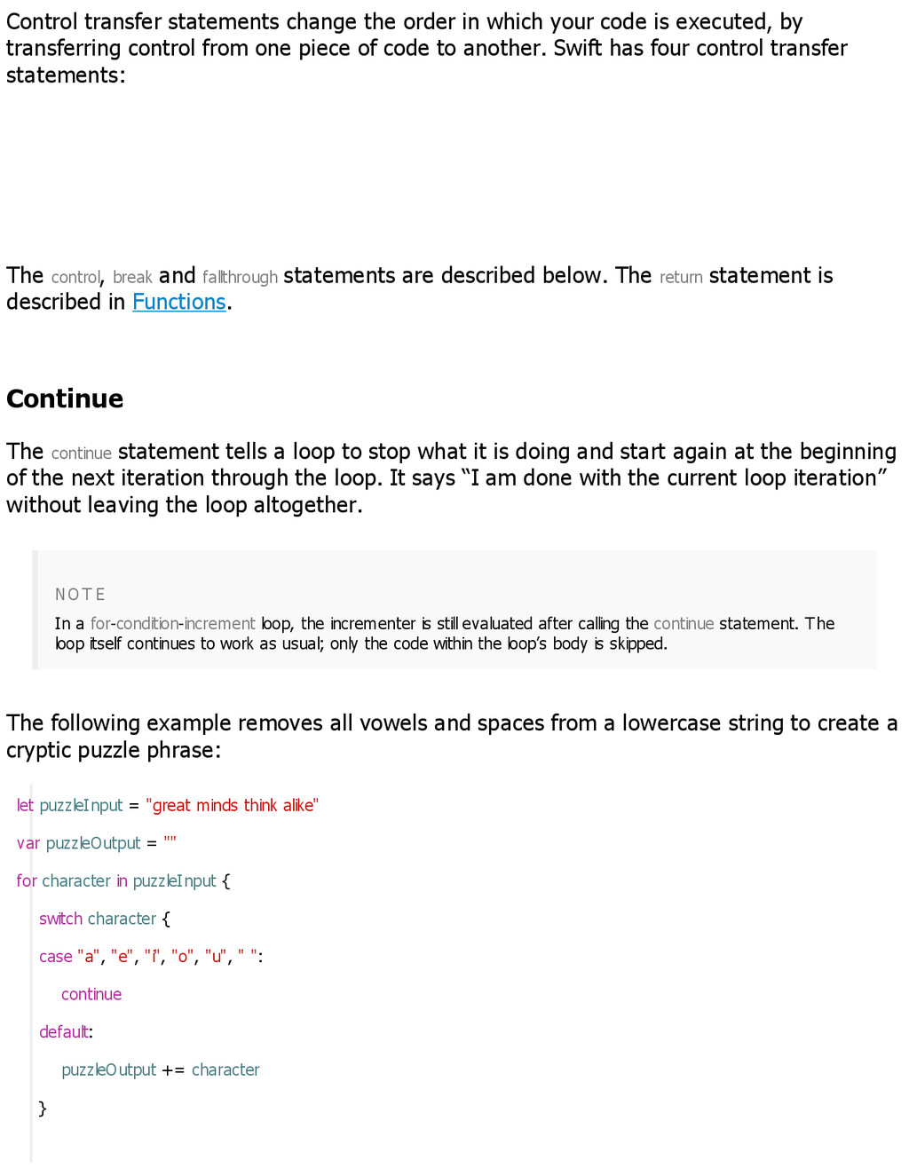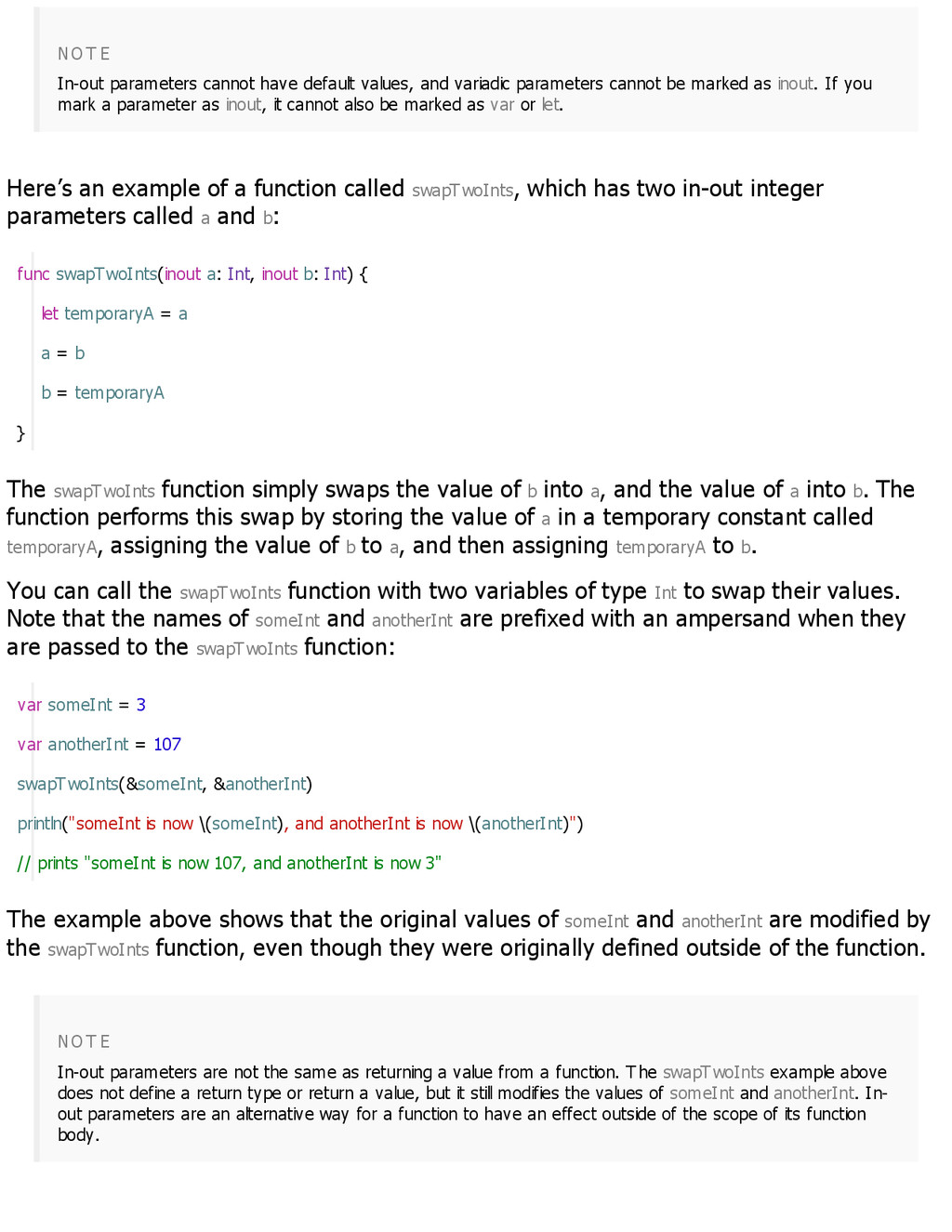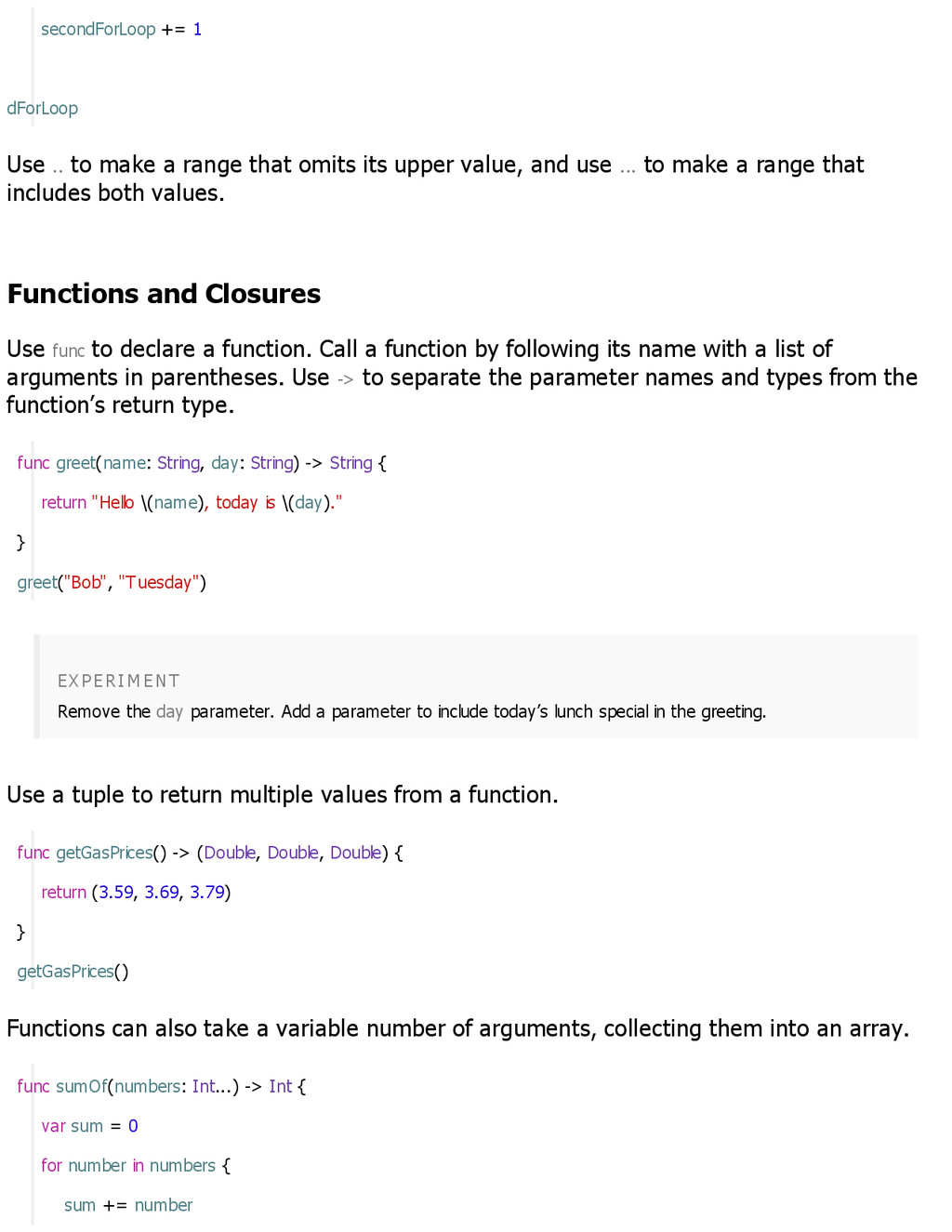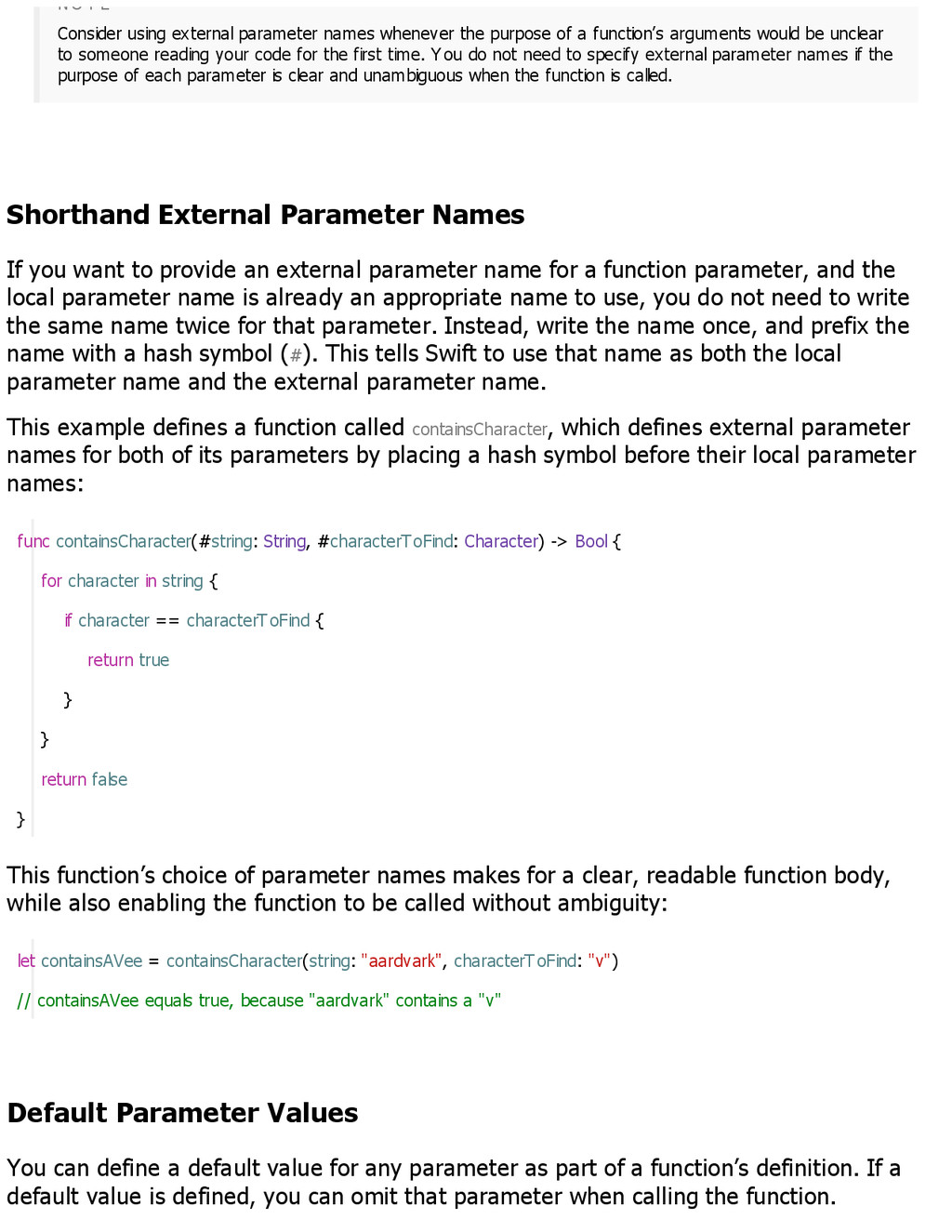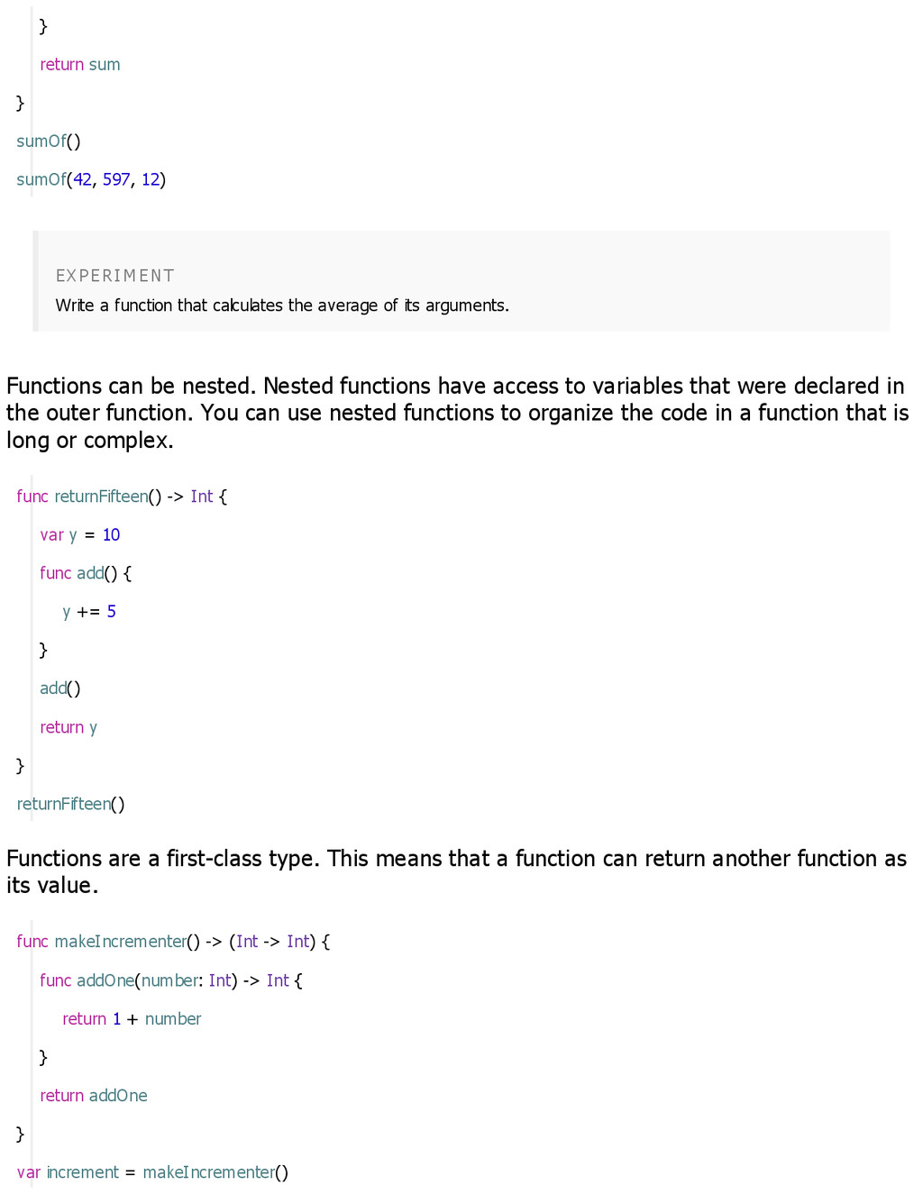 it will return a value must always do so. A function with a defined return type cannot allow control to fall out of the bottom of the function without returning a value, and attempting to do so will result in a compile-time error. Functions with Multiple Return Values You can use a tuple type as the return type for a function to return multiple values as part of one compound return value. The example below defines a function called count, which counts the number of vowels, consonants, and other characters in a string, based on the standard set of vowels and consonants used in American English: func count(string: String) -> (vowels: Int, consonants: Int, others: Int) { var vowels = 0, consonants = 0, others = 0 for character in string { switch String(character).lowercaseString { case "a", "e", "i", "o", "u": ++vowels case "b", "c", "d", "f", "g", "h", "j", "k", "l", "m", "n", "p", "q", "r", "s", "t", "v", "w", "x", "y", "z": ++consonants default: ++others } eturn (vowels, consonants, others) You can use this count function to count the characters in an arbitrary string, and to retrieve the counted totals as a tuple of three named Int values: let total = count("some arbitrary string!") println("\(total.vowels) vowels and \(total.consonants) consonants")