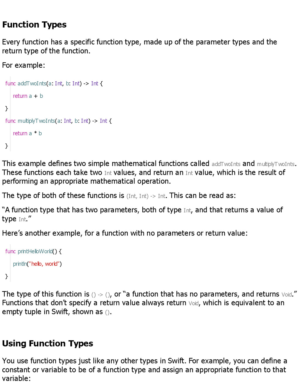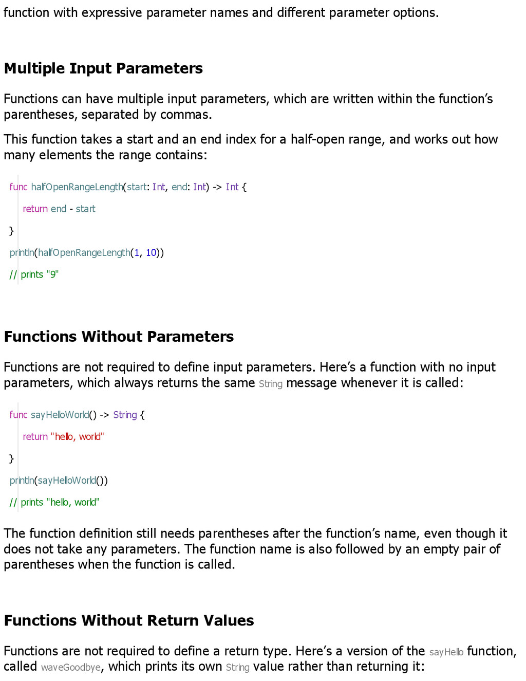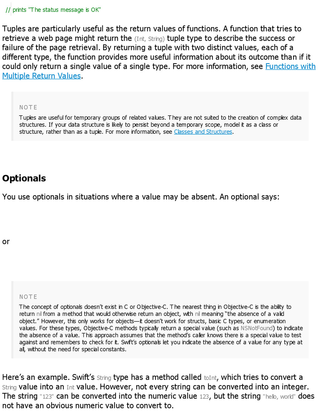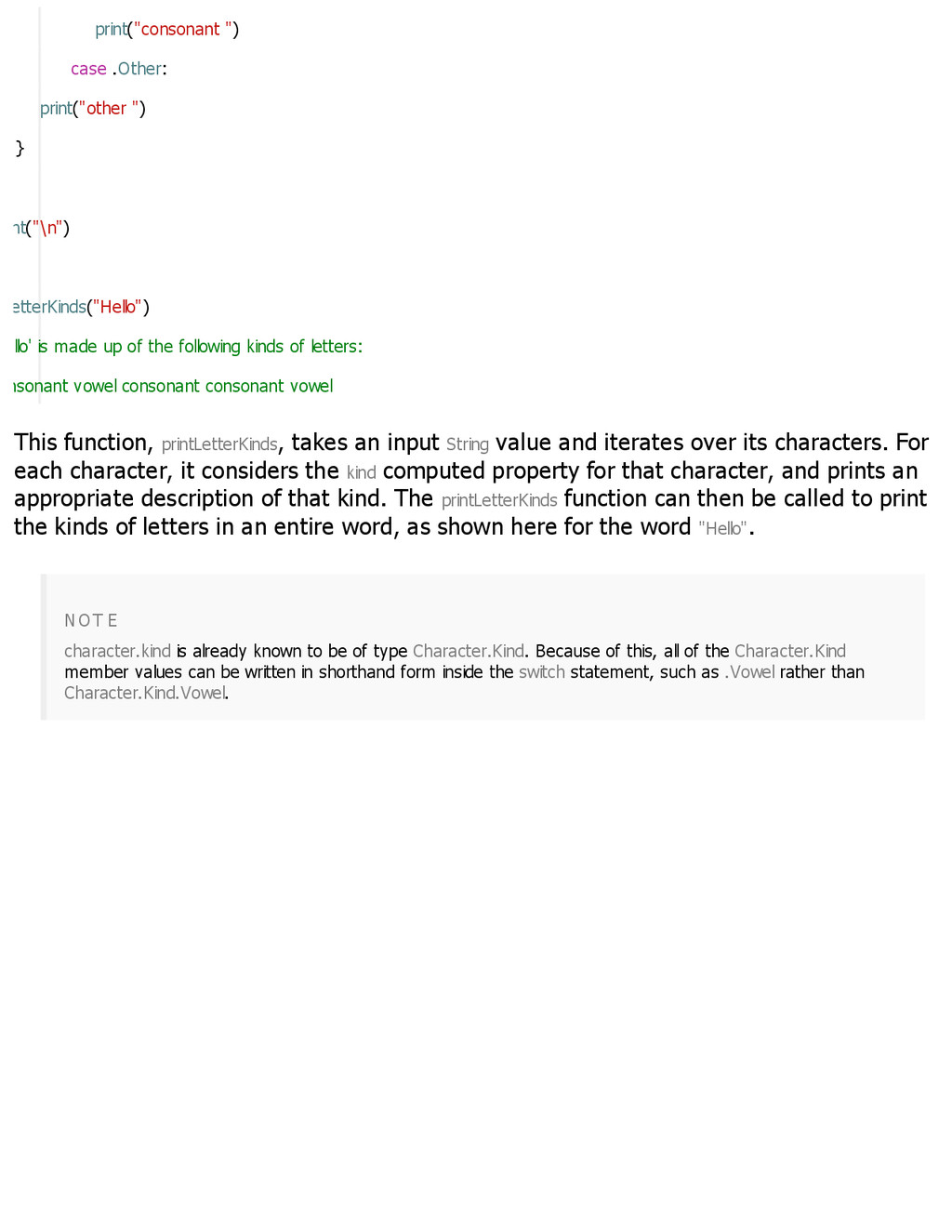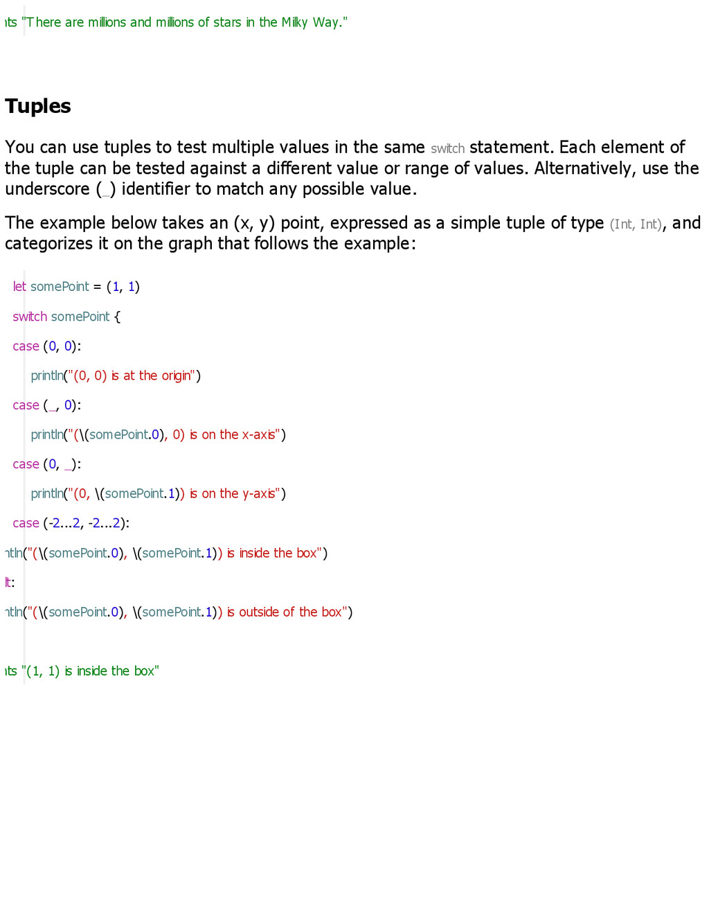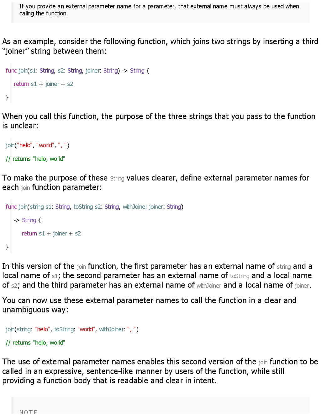 it will return a value must always do so. A function with a defined return type cannot allow control to fall out of the bottom of the function without returning a value, and attempting to do so will result in a compile-time error. Functions with Multiple Return Values You can use a tuple type as the return type for a function to return multiple values as part of one compound return value. The example below defines a function called count, which counts the number of vowels, consonants, and other characters in a string, based on the standard set of vowels and consonants used in American English: func count(string: String) -> (vowels: Int, consonants: Int, others: Int) { var vowels = 0, consonants = 0, others = 0 for character in string { switch String(character).lowercaseString { case "a", "e", "i", "o", "u": ++vowels case "b", "c", "d", "f", "g", "h", "j", "k", "l", "m", "n", "p", "q", "r", "s", "t", "v", "w", "x", "y", "z": ++consonants default: ++others } eturn (vowels, consonants, others) You can use this count function to count the characters in an arbitrary string, and to retrieve the counted totals as a tuple of three named Int values: let total = count("some arbitrary string!") println("\(total.vowels) vowels and \(total.consonants) consonants")