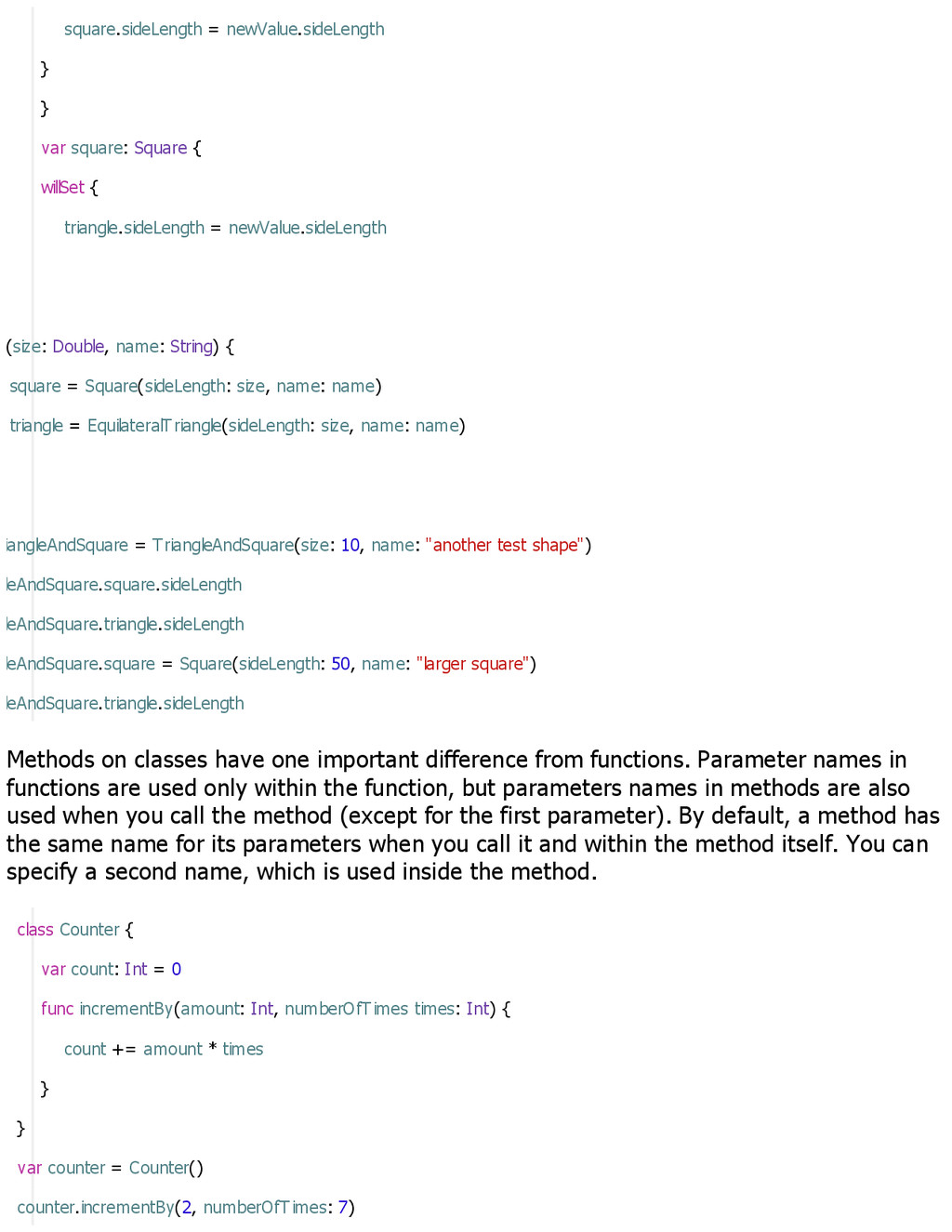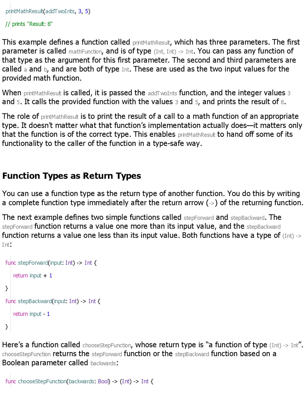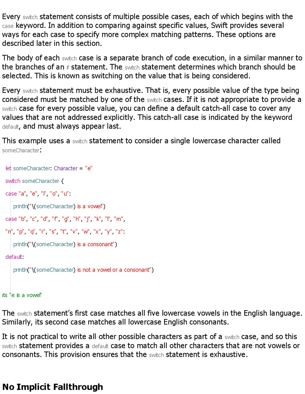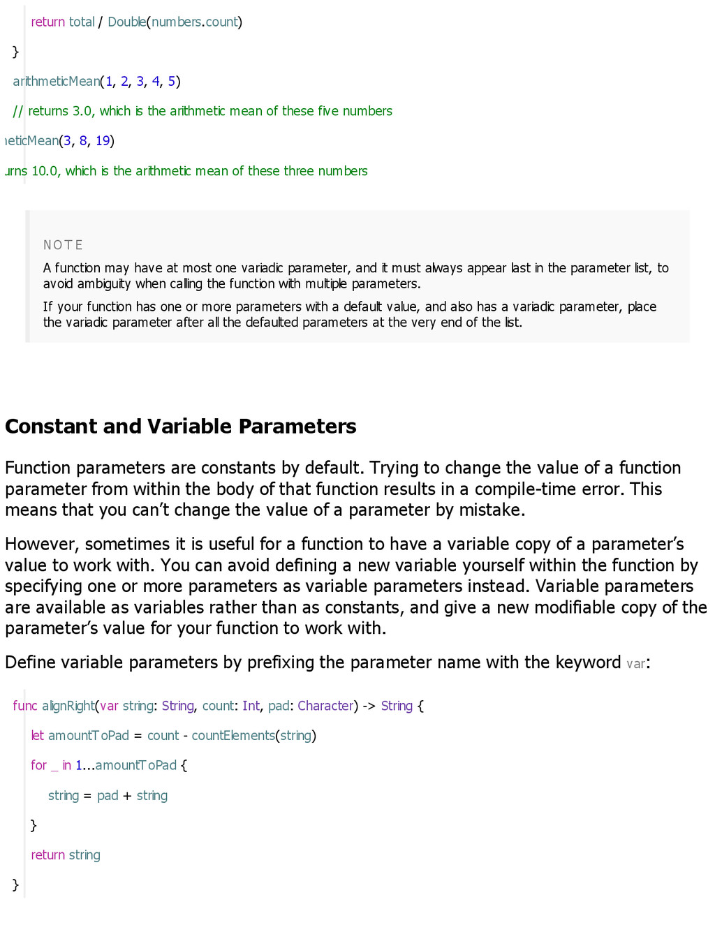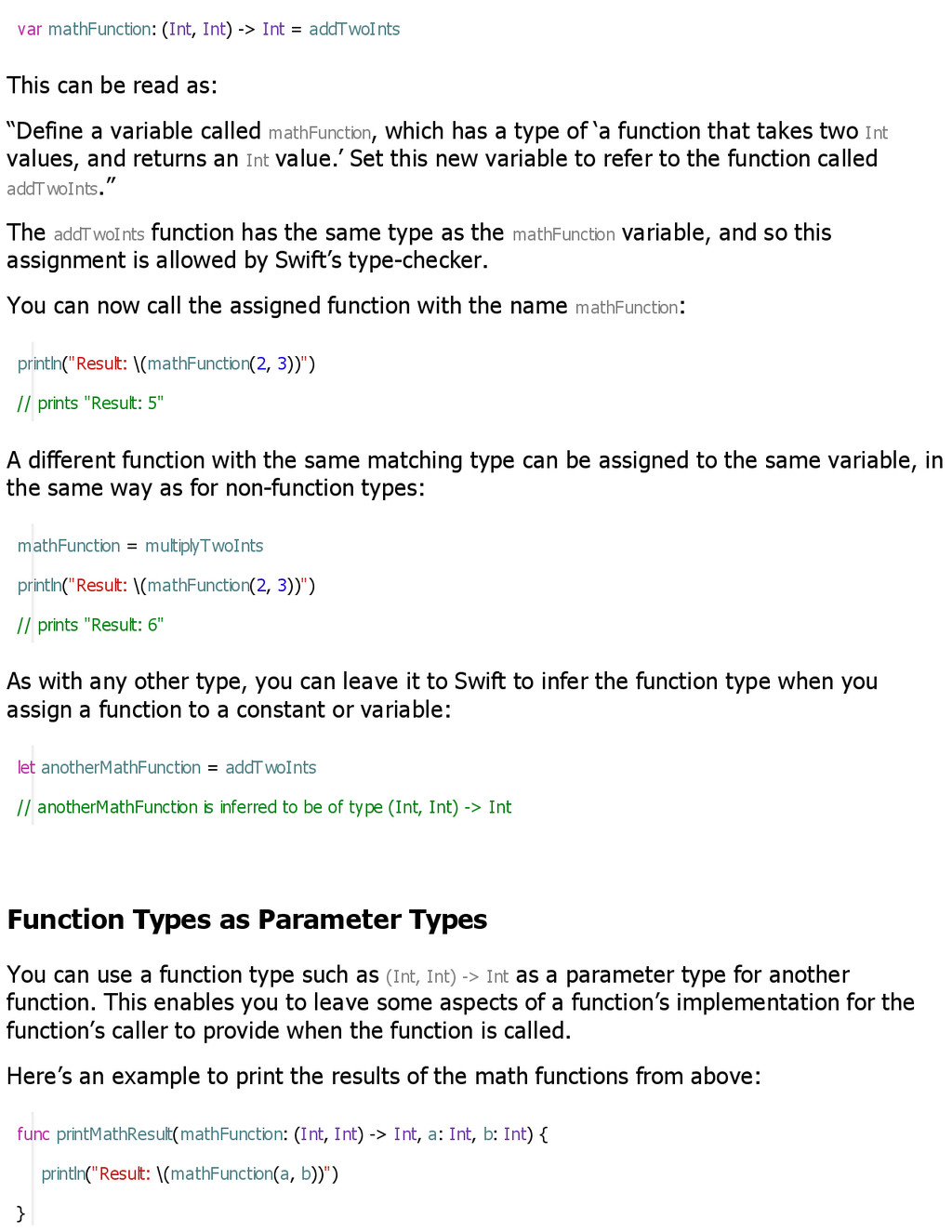 it will return a value must always do so. A function with a defined return type cannot allow control to fall out of the bottom of the function without returning a value, and attempting to do so will result in a compile-time error. Functions with Multiple Return Values You can use a tuple type as the return type for a function to return multiple values as part of one compound return value. The example below defines a function called count, which counts the number of vowels, consonants, and other characters in a string, based on the standard set of vowels and consonants used in American English: func count(string: String) -> (vowels: Int, consonants: Int, others: Int) { var vowels = 0, consonants = 0, others = 0 for character in string { switch String(character).lowercaseString { case "a", "e", "i", "o", "u": ++vowels case "b", "c", "d", "f", "g", "h", "j", "k", "l", "m", "n", "p", "q", "r", "s", "t", "v", "w", "x", "y", "z": ++consonants default: ++others } eturn (vowels, consonants, others) You can use this count function to count the characters in an arbitrary string, and to retrieve the counted totals as a tuple of three named Int values: let total = count("some arbitrary string!") println("\(total.vowels) vowels and \(total.consonants) consonants")
