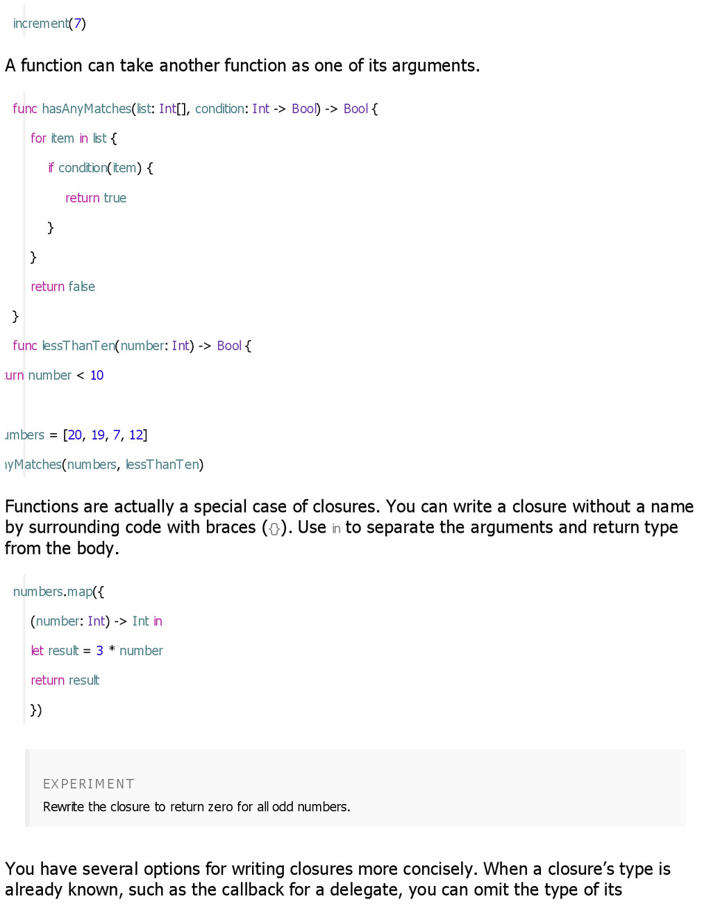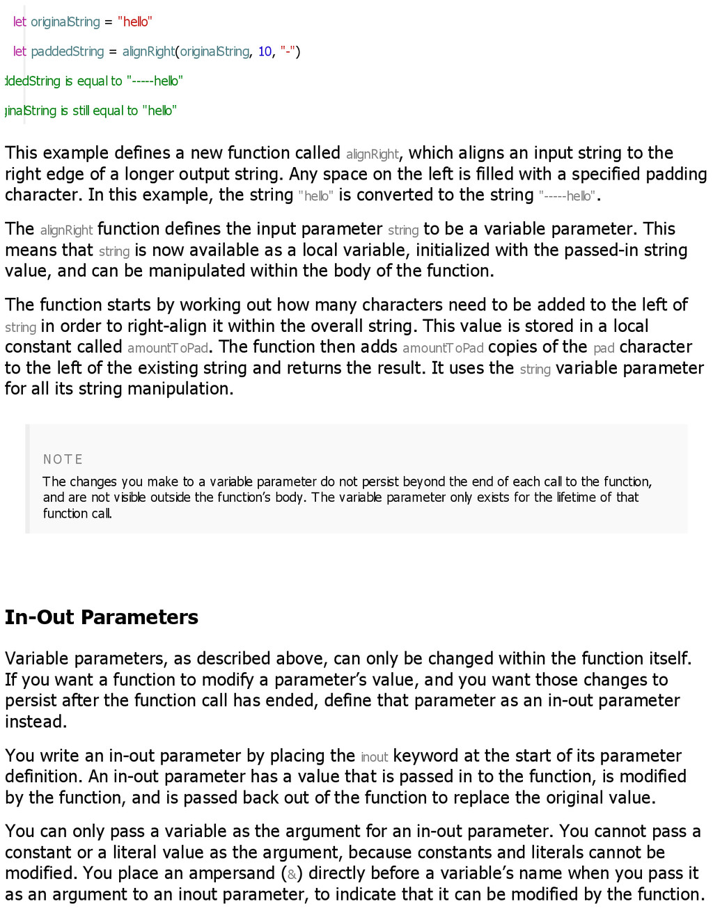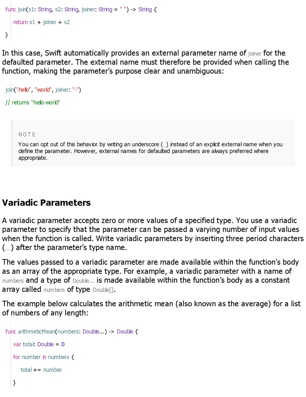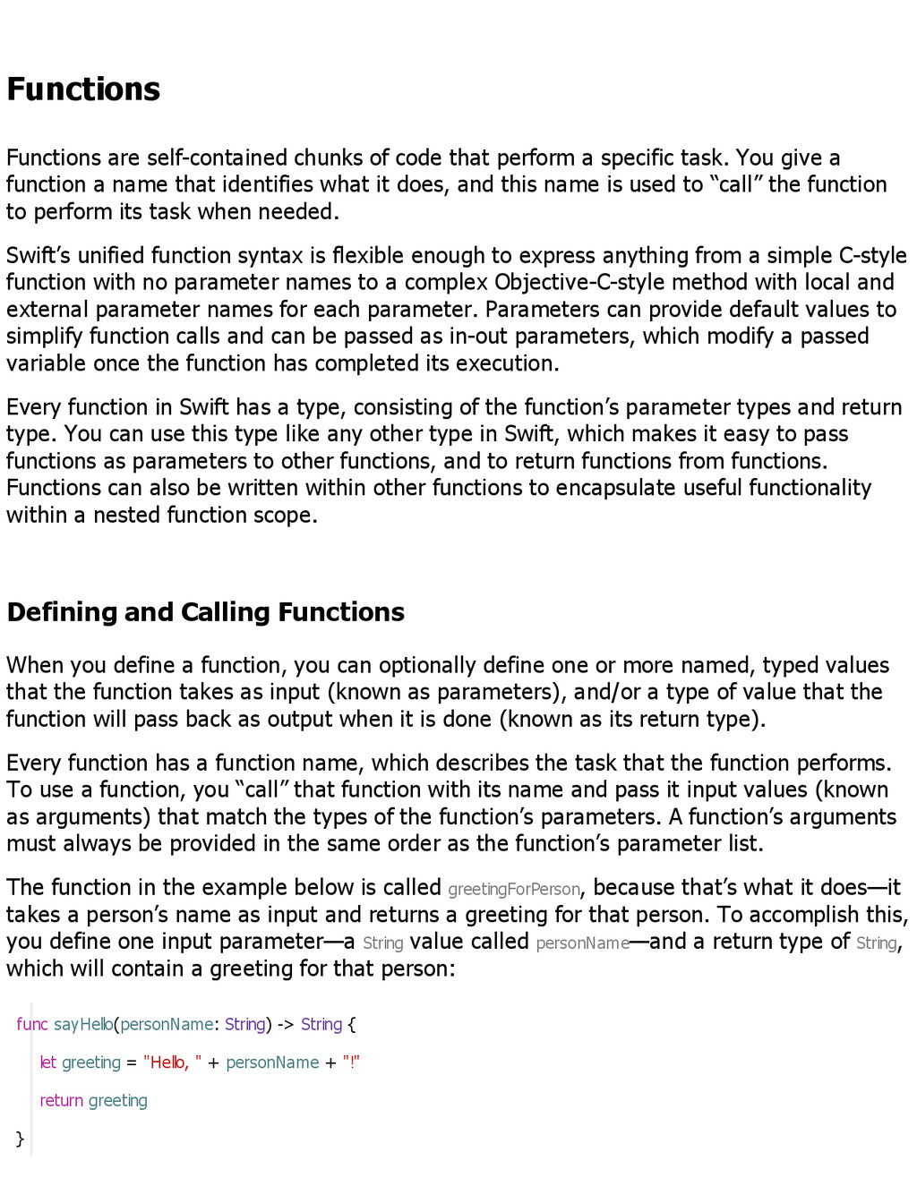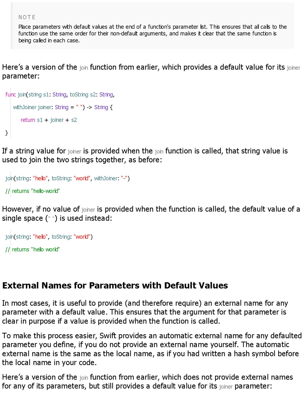it will return a value must always do so. A function with a defined return type cannot allow control to fall out of the bottom of the function without returning a value, and attempting to do so will result in a compile-time error. Functions with Multiple Return Values You can use a tuple type as the return type for a function to return multiple values as part of one compound return value. The example below defines a function called count, which counts the number of vowels, consonants, and other characters in a string, based on the standard set of vowels and consonants used in American English: func count(string: String) -> (vowels: Int, consonants: Int, others: Int) { var vowels = 0, consonants = 0, others = 0 for character in string { switch String(character).lowercaseString { case "a", "e", "i", "o", "u": ++vowels case "b", "c", "d", "f", "g", "h", "j", "k", "l", "m", "n", "p", "q", "r", "s", "t", "v", "w", "x", "y", "z": ++consonants default: ++others } eturn (vowels, consonants, others) You can use this count function to count the characters in an arbitrary string, and to retrieve the counted totals as a tuple of three named Int values: let total = count("some arbitrary string!") println("\(total.vowels) vowels and \(total.consonants) consonants")
