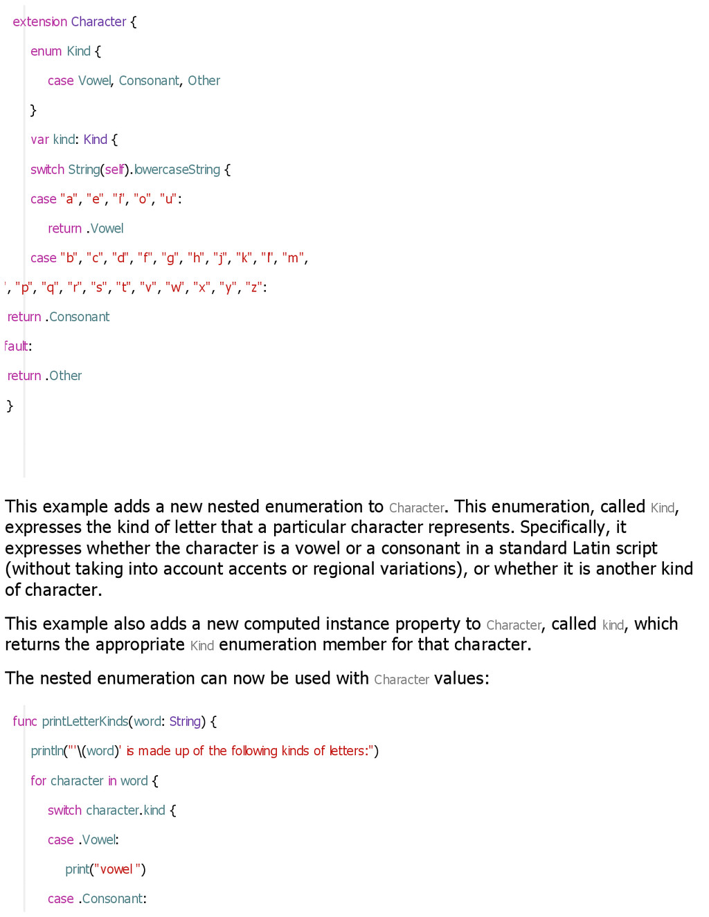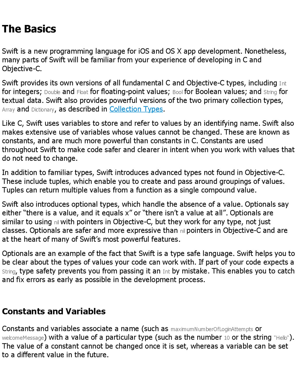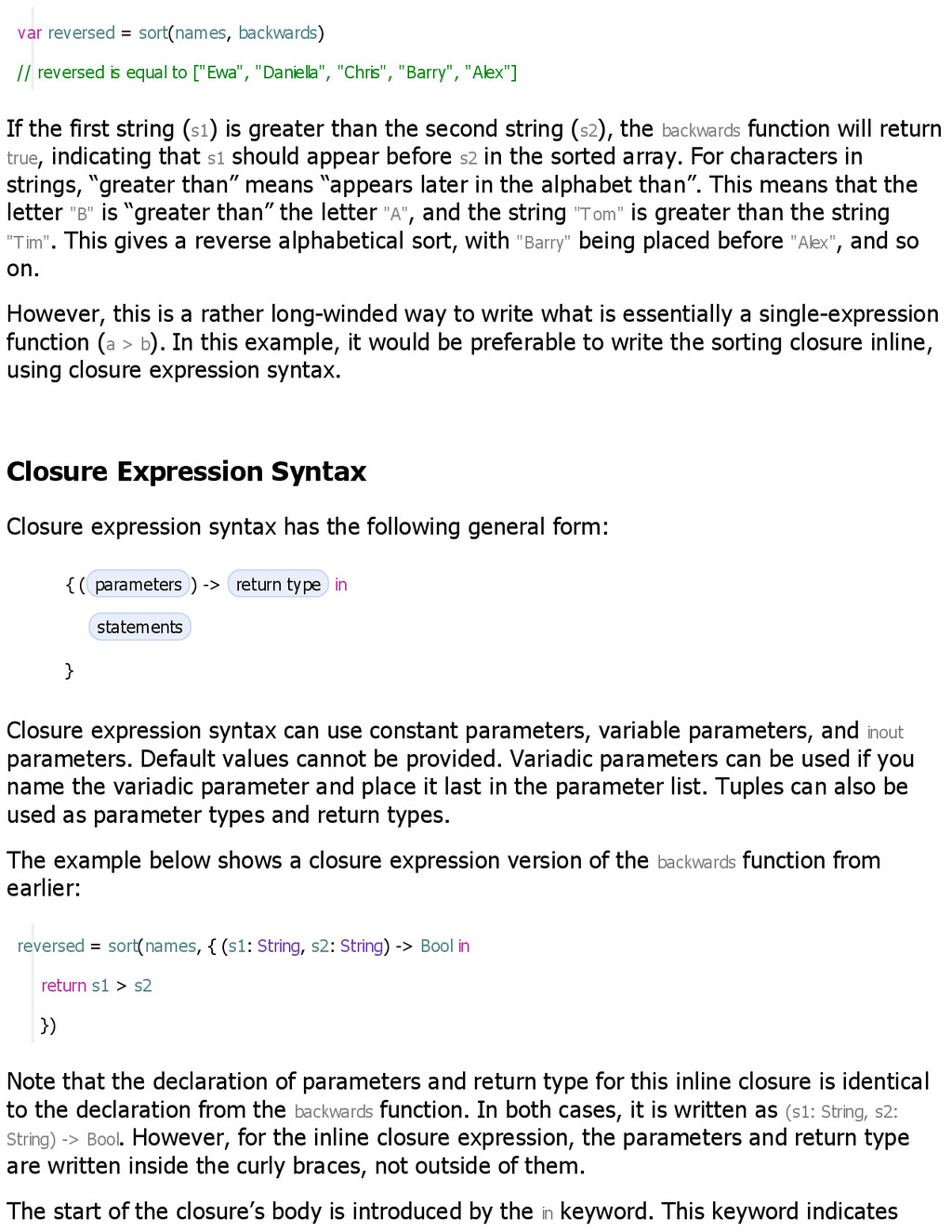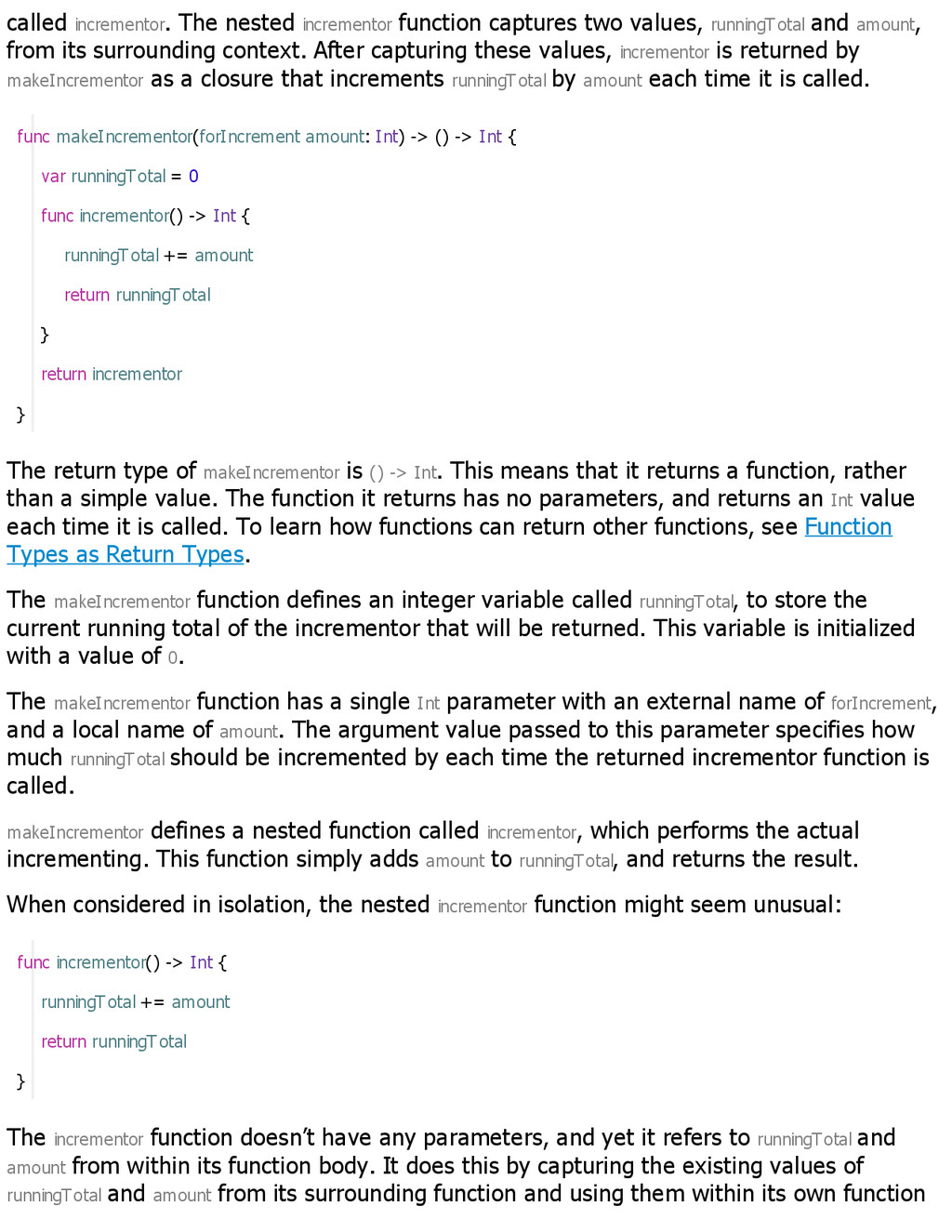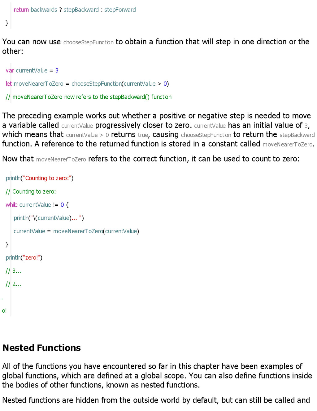 it will return a value must always do so. A function with a defined return type cannot allow control to fall out of the bottom of the function without returning a value, and attempting to do so will result in a compile-time error. Functions with Multiple Return Values You can use a tuple type as the return type for a function to return multiple values as part of one compound return value. The example below defines a function called count, which counts the number of vowels, consonants, and other characters in a string, based on the standard set of vowels and consonants used in American English: func count(string: String) -> (vowels: Int, consonants: Int, others: Int) { var vowels = 0, consonants = 0, others = 0 for character in string { switch String(character).lowercaseString { case "a", "e", "i", "o", "u": ++vowels case "b", "c", "d", "f", "g", "h", "j", "k", "l", "m", "n", "p", "q", "r", "s", "t", "v", "w", "x", "y", "z": ++consonants default: ++others } eturn (vowels, consonants, others) You can use this count function to count the characters in an arbitrary string, and to retrieve the counted totals as a tuple of three named Int values: let total = count("some arbitrary string!") println("\(total.vowels) vowels and \(total.consonants) consonants")