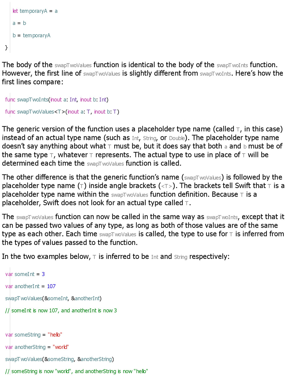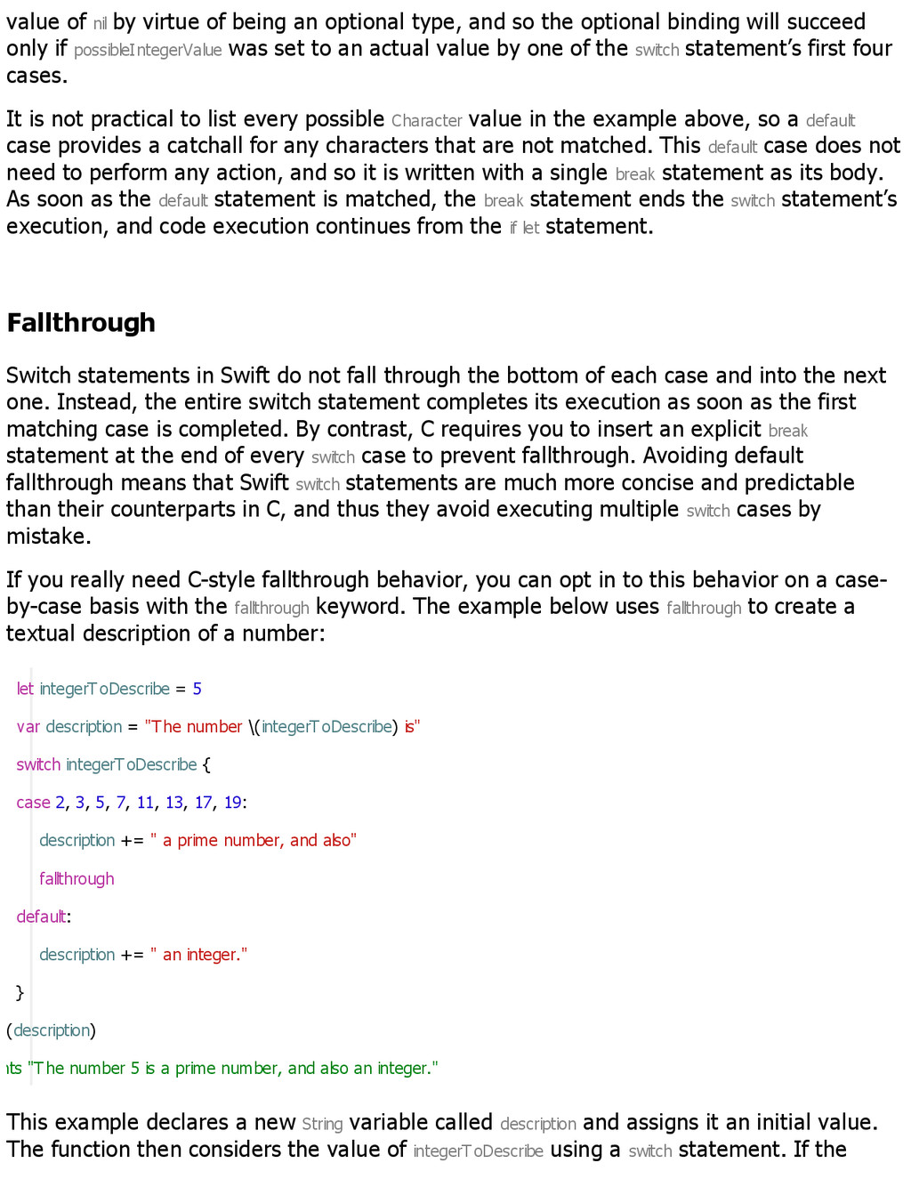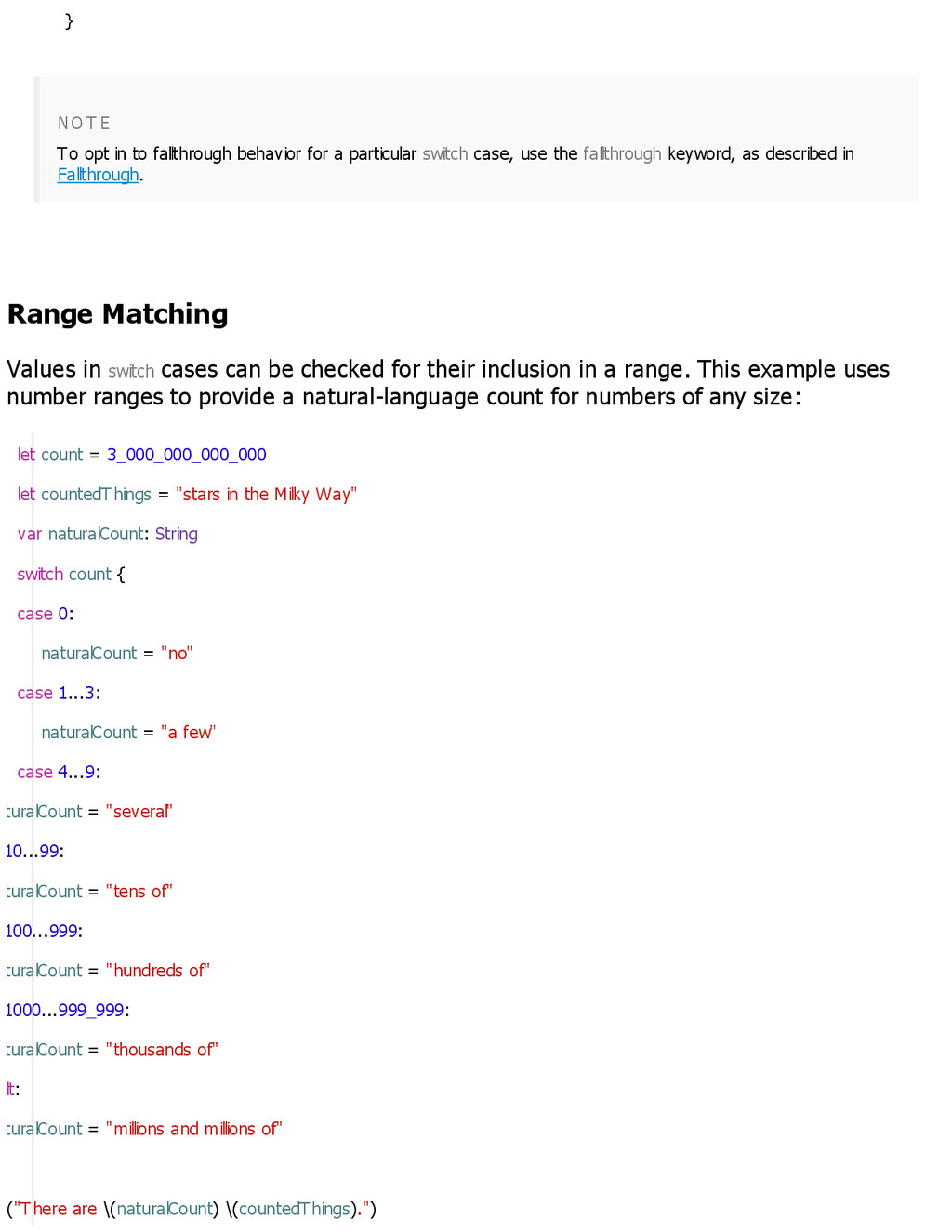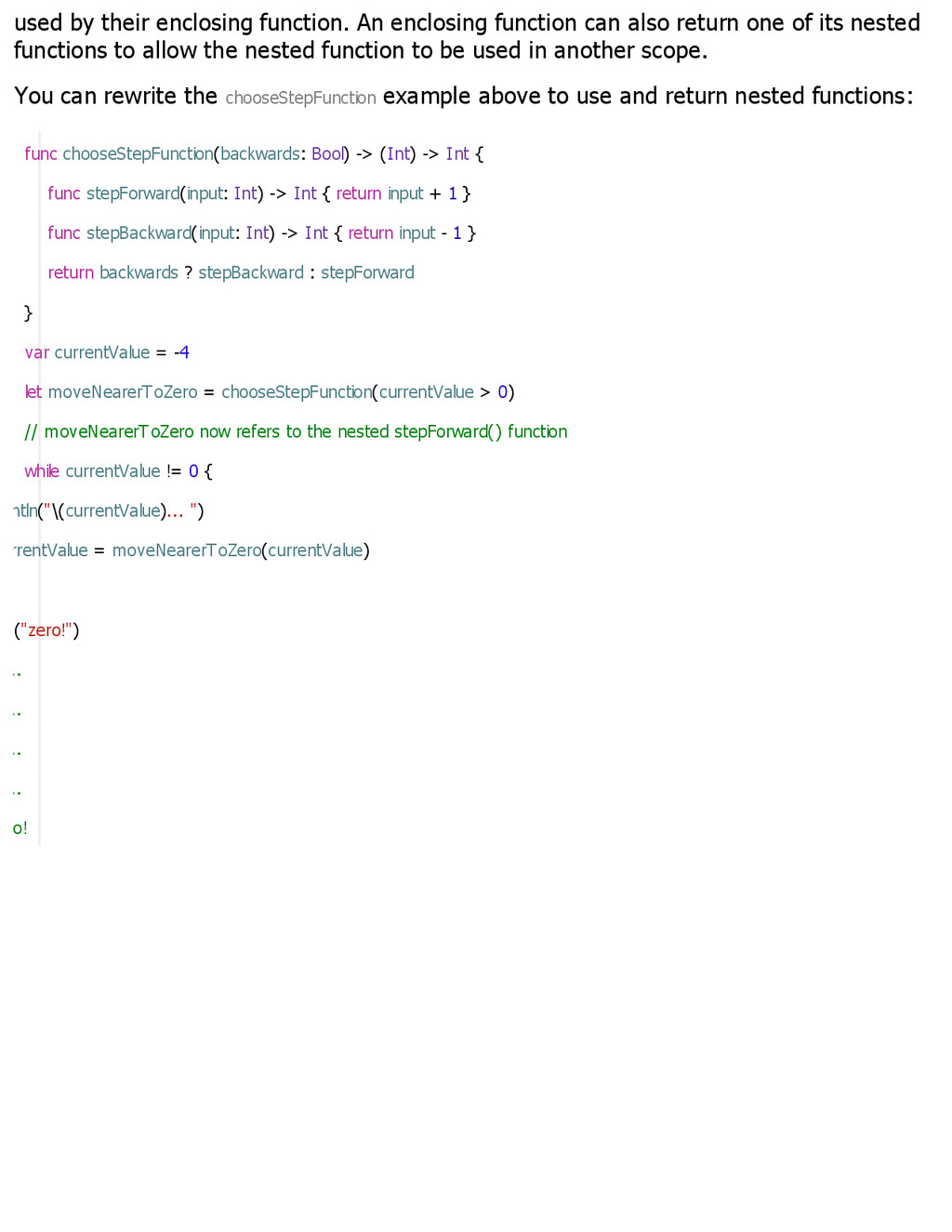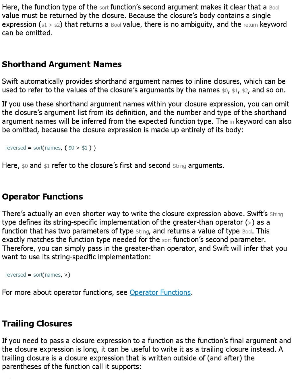 it will return a value must always do so. A function with a defined return type cannot allow control to fall out of the bottom of the function without returning a value, and attempting to do so will result in a compile-time error. Functions with Multiple Return Values You can use a tuple type as the return type for a function to return multiple values as part of one compound return value. The example below defines a function called count, which counts the number of vowels, consonants, and other characters in a string, based on the standard set of vowels and consonants used in American English: func count(string: String) -> (vowels: Int, consonants: Int, others: Int) { var vowels = 0, consonants = 0, others = 0 for character in string { switch String(character).lowercaseString { case "a", "e", "i", "o", "u": ++vowels case "b", "c", "d", "f", "g", "h", "j", "k", "l", "m", "n", "p", "q", "r", "s", "t", "v", "w", "x", "y", "z": ++consonants default: ++others } eturn (vowels, consonants, others) You can use this count function to count the characters in an arbitrary string, and to retrieve the counted totals as a tuple of three named Int values: let total = count("some arbitrary string!") println("\(total.vowels) vowels and \(total.consonants) consonants")