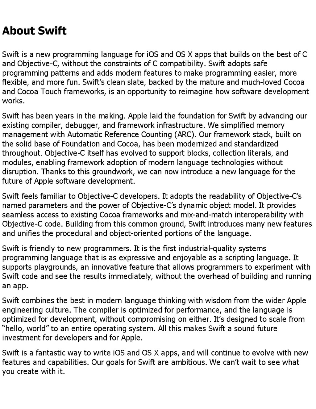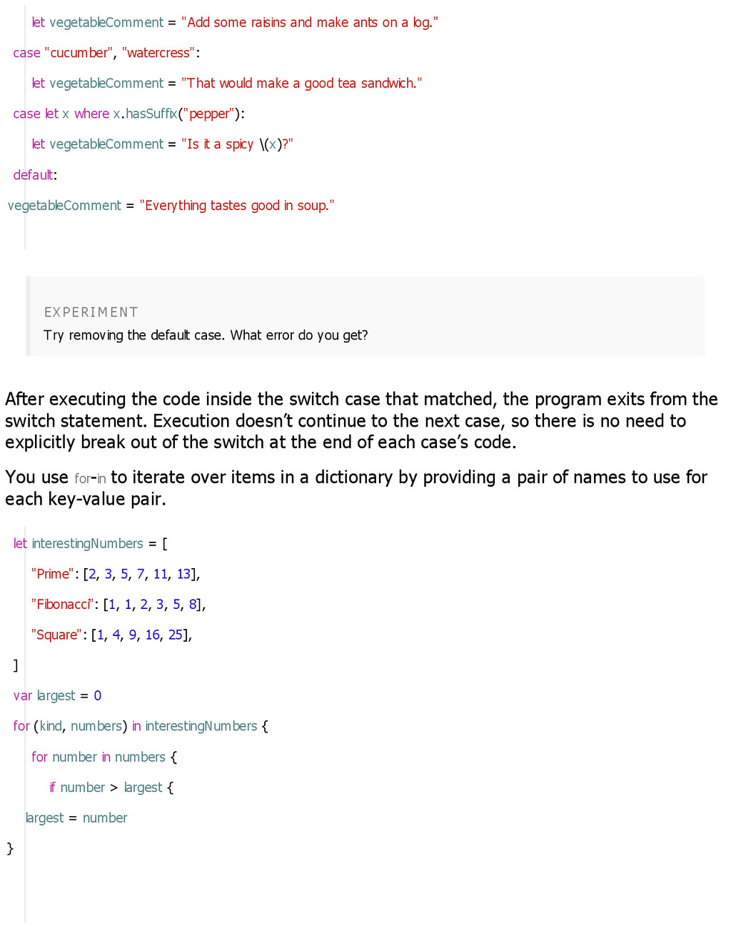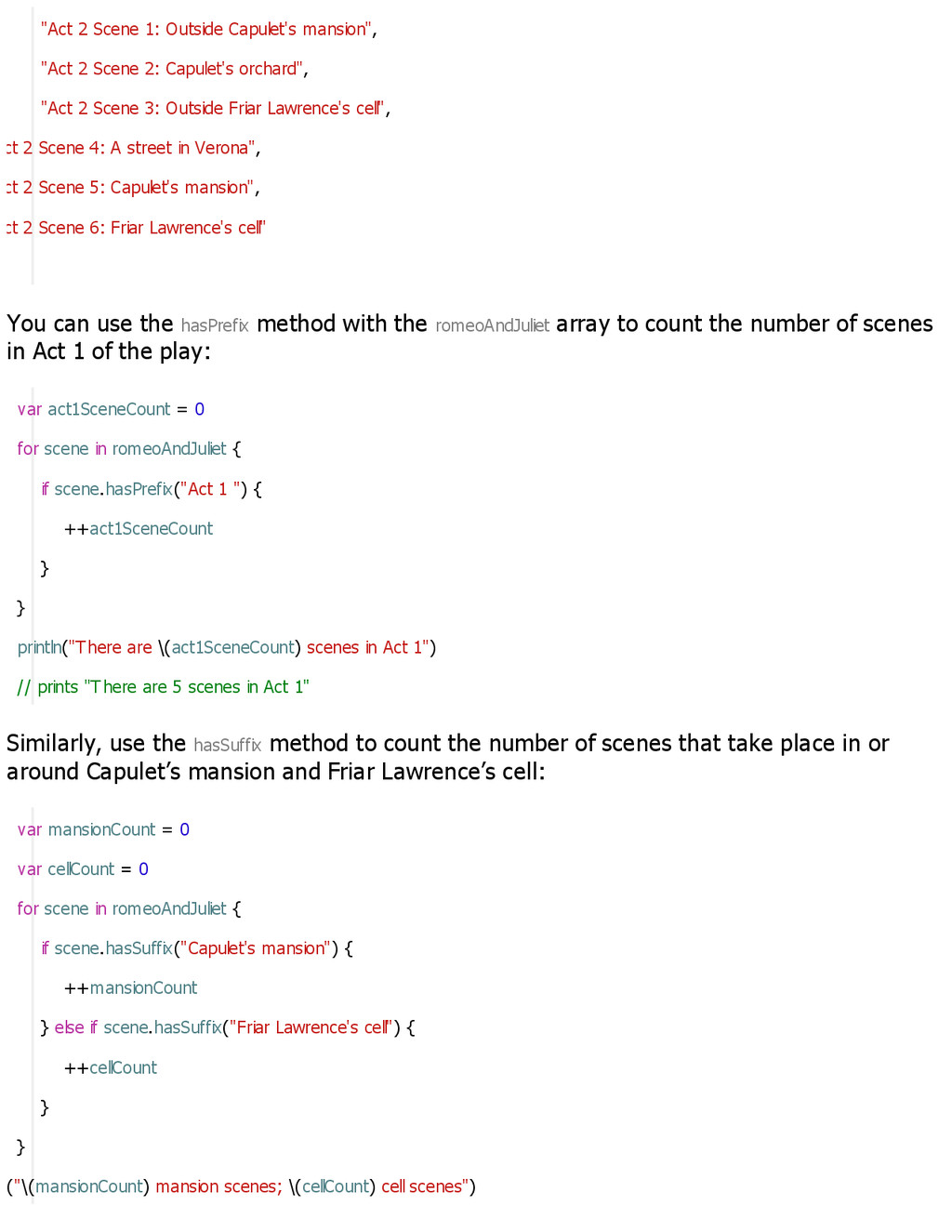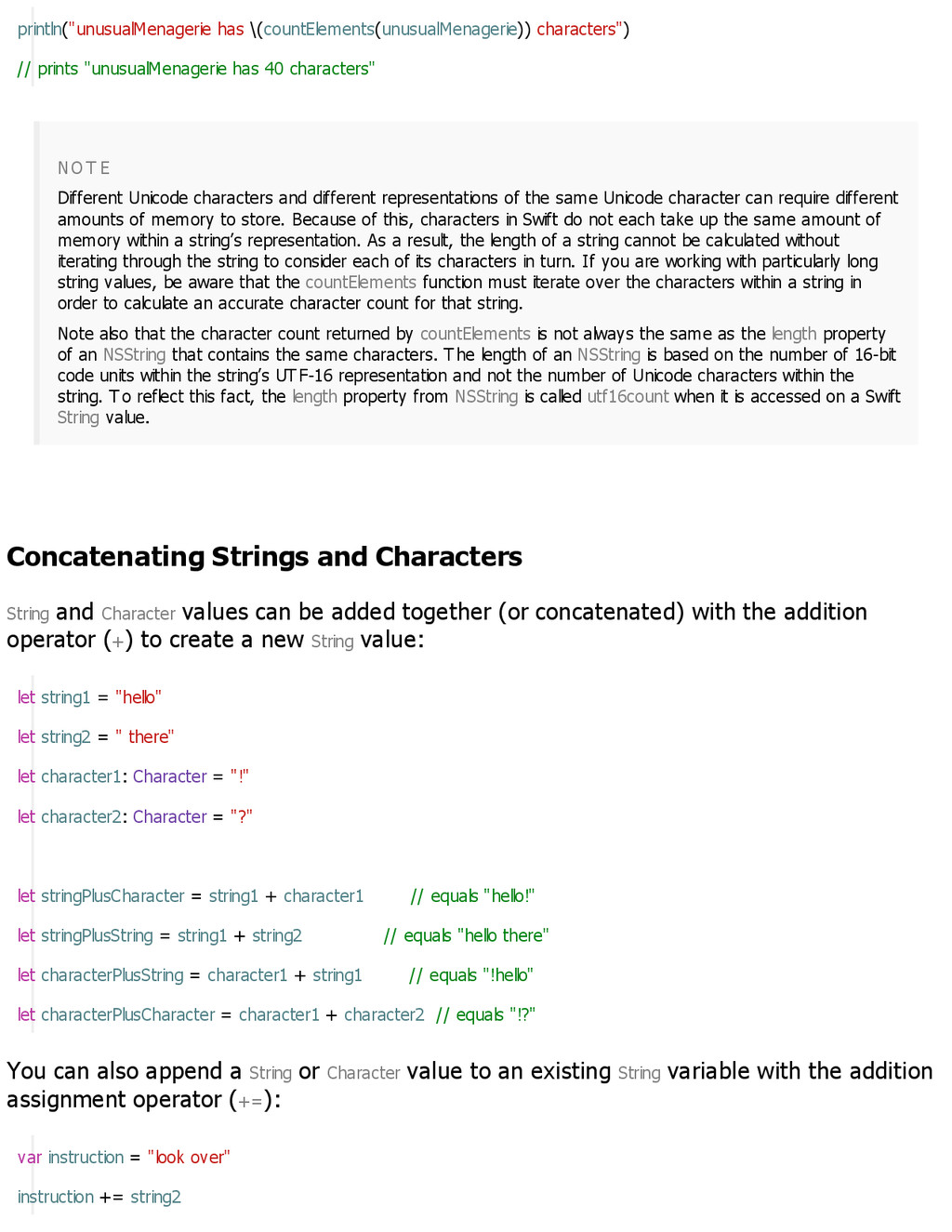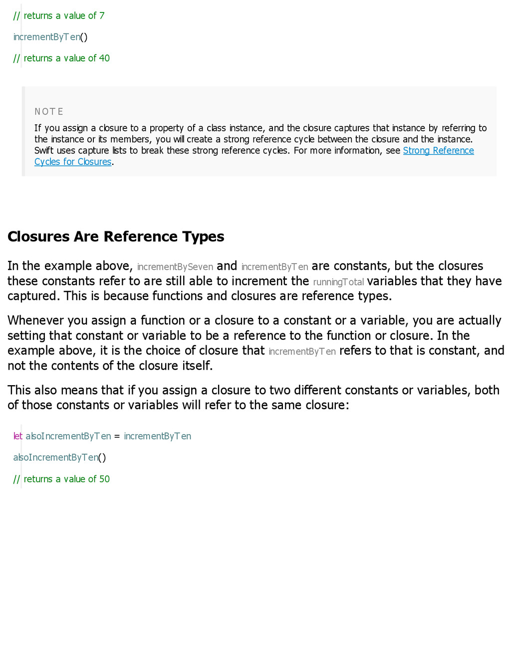 it will return a value must always do so. A function with a defined return type cannot allow control to fall out of the bottom of the function without returning a value, and attempting to do so will result in a compile-time error. Functions with Multiple Return Values You can use a tuple type as the return type for a function to return multiple values as part of one compound return value. The example below defines a function called count, which counts the number of vowels, consonants, and other characters in a string, based on the standard set of vowels and consonants used in American English: func count(string: String) -> (vowels: Int, consonants: Int, others: Int) { var vowels = 0, consonants = 0, others = 0 for character in string { switch String(character).lowercaseString { case "a", "e", "i", "o", "u": ++vowels case "b", "c", "d", "f", "g", "h", "j", "k", "l", "m", "n", "p", "q", "r", "s", "t", "v", "w", "x", "y", "z": ++consonants default: ++others } eturn (vowels, consonants, others) You can use this count function to count the characters in an arbitrary string, and to retrieve the counted totals as a tuple of three named Int values: let total = count("some arbitrary string!") println("\(total.vowels) vowels and \(total.consonants) consonants")