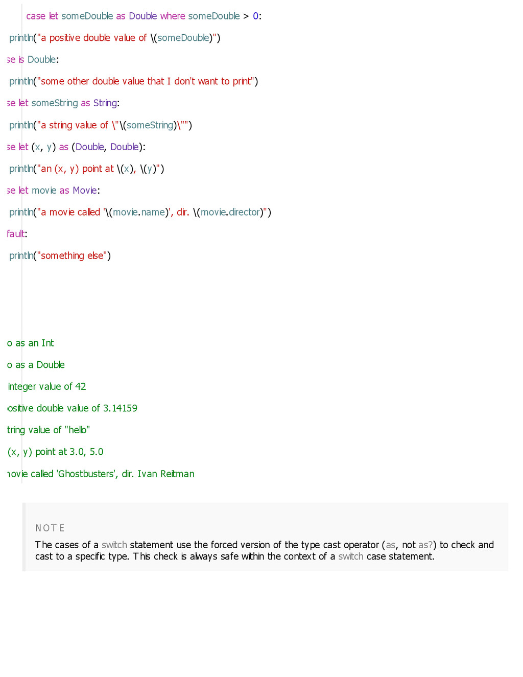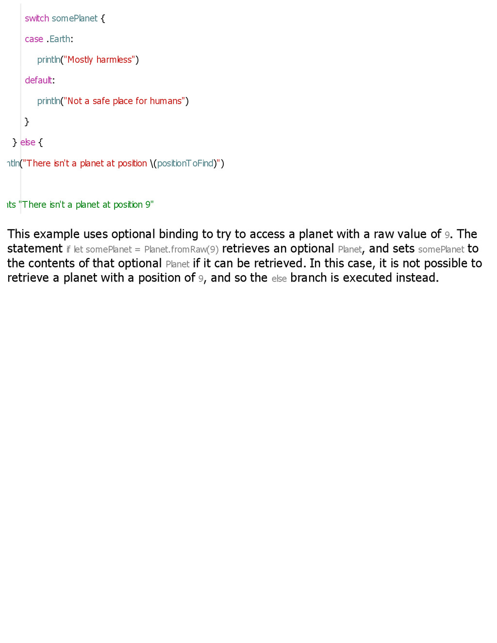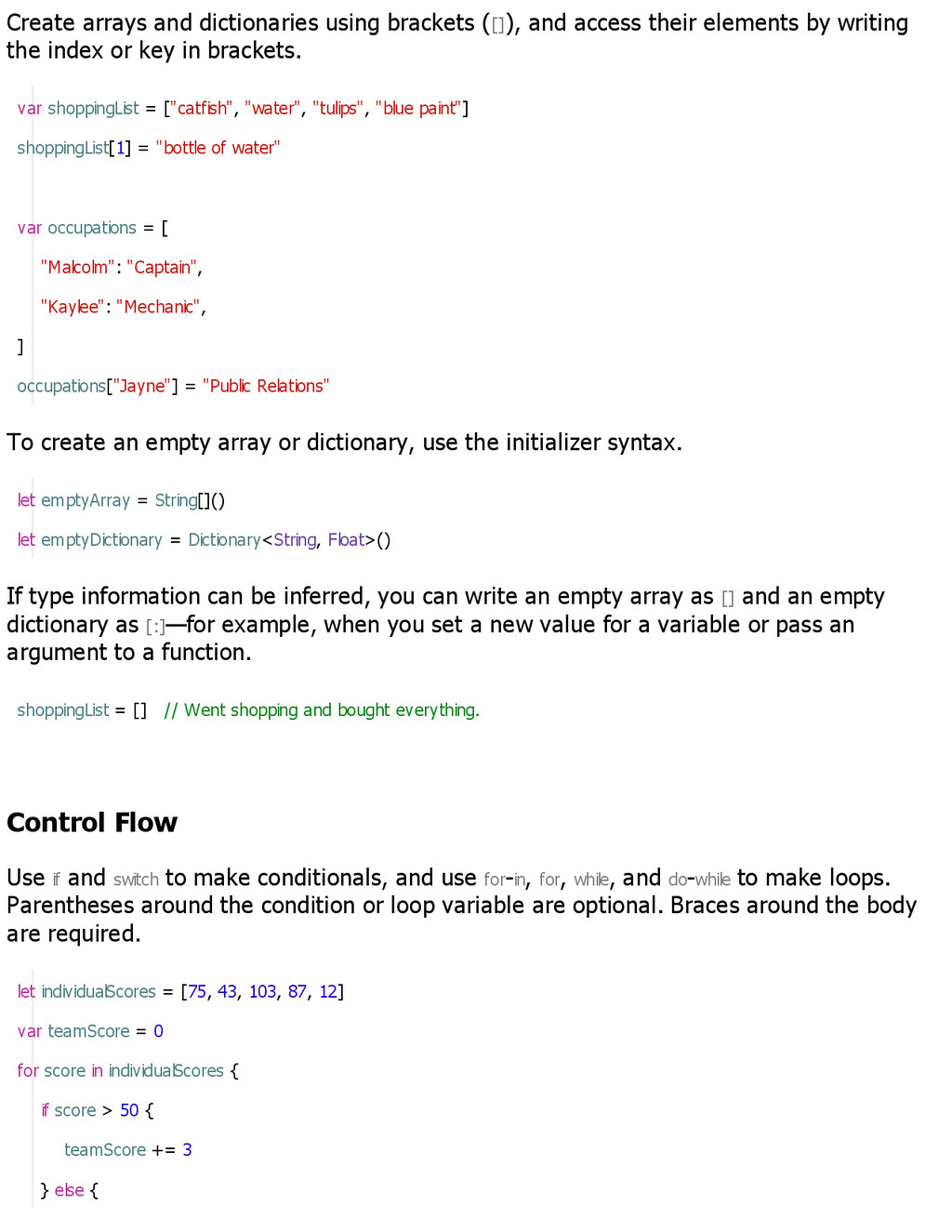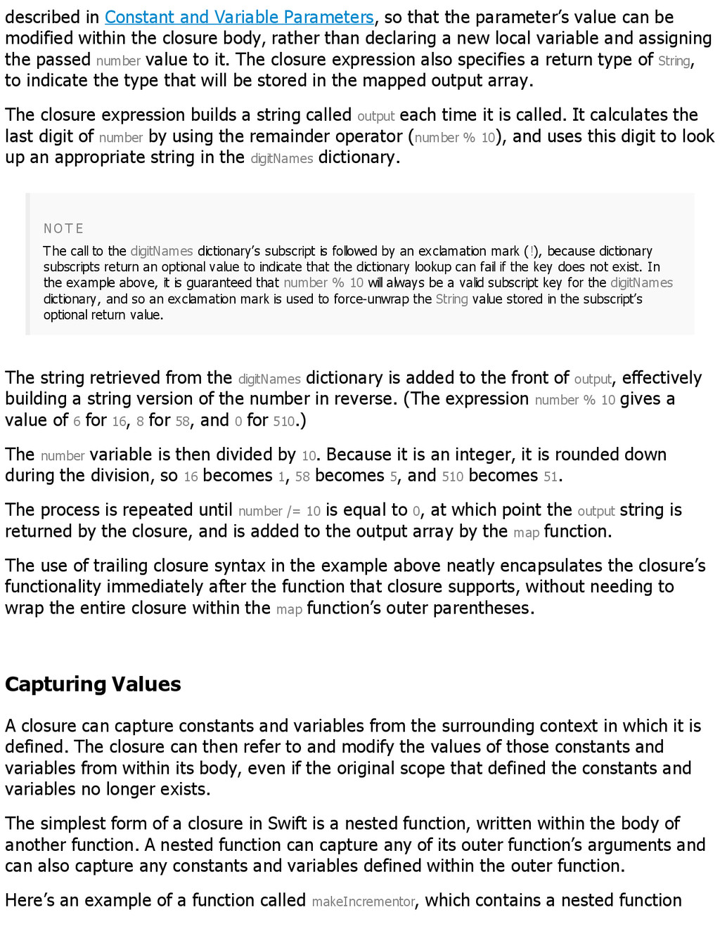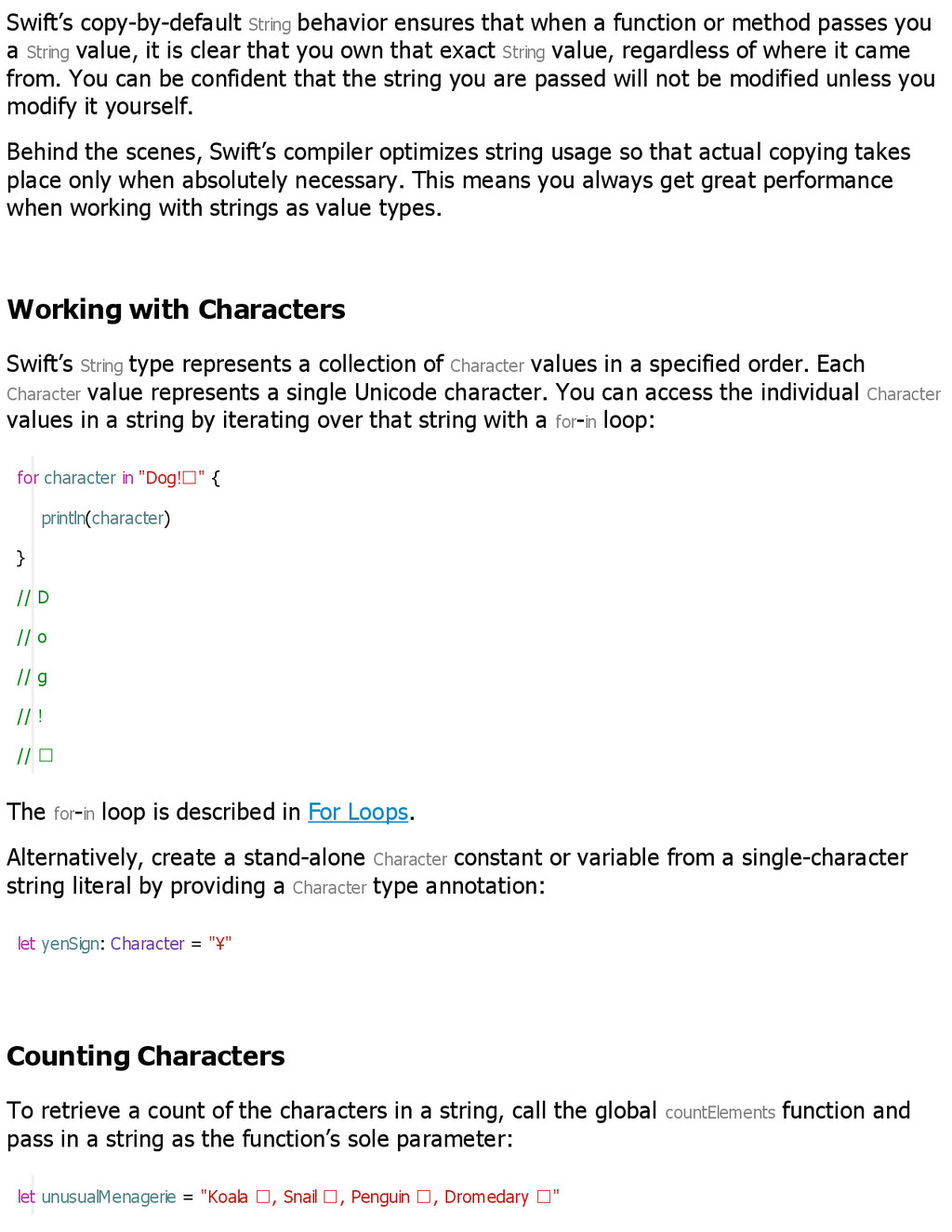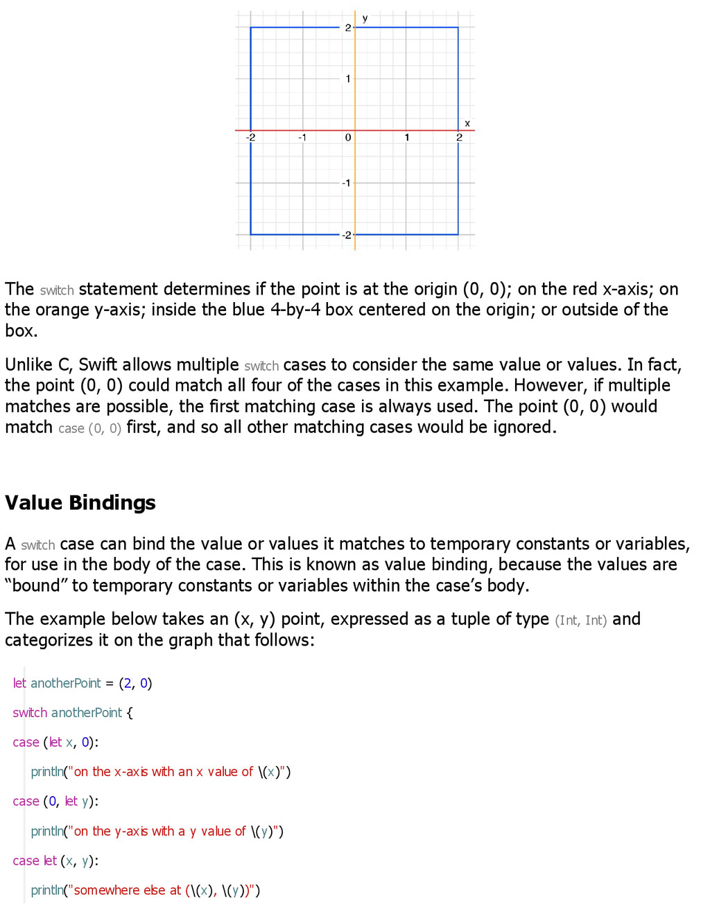it will return a value must always do so. A function with a defined return type cannot allow control to fall out of the bottom of the function without returning a value, and attempting to do so will result in a compile-time error. Functions with Multiple Return Values You can use a tuple type as the return type for a function to return multiple values as part of one compound return value. The example below defines a function called count, which counts the number of vowels, consonants, and other characters in a string, based on the standard set of vowels and consonants used in American English: func count(string: String) -> (vowels: Int, consonants: Int, others: Int) { var vowels = 0, consonants = 0, others = 0 for character in string { switch String(character).lowercaseString { case "a", "e", "i", "o", "u": ++vowels case "b", "c", "d", "f", "g", "h", "j", "k", "l", "m", "n", "p", "q", "r", "s", "t", "v", "w", "x", "y", "z": ++consonants default: ++others } eturn (vowels, consonants, others) You can use this count function to count the characters in an arbitrary string, and to retrieve the counted totals as a tuple of three named Int values: let total = count("some arbitrary string!") println("\(total.vowels) vowels and \(total.consonants) consonants")