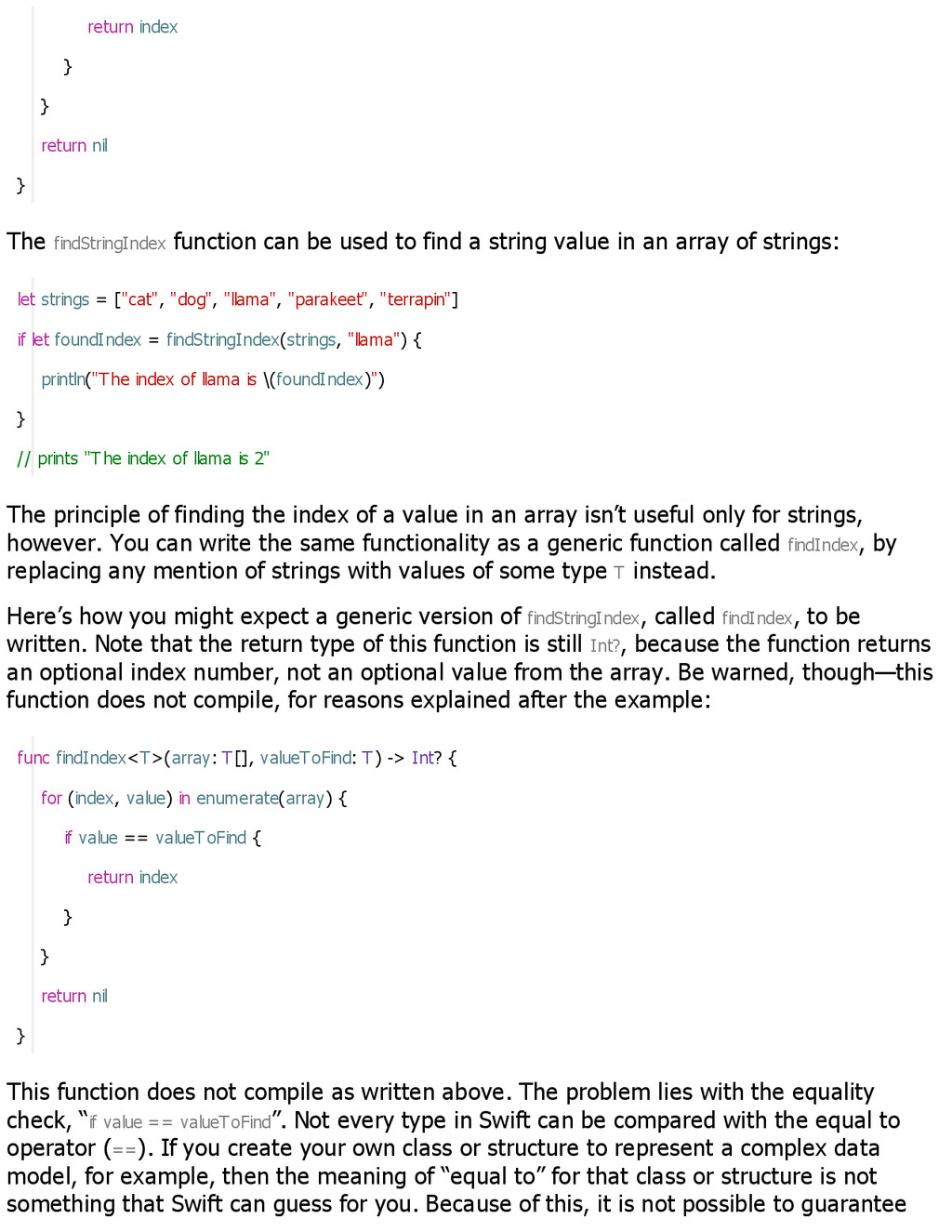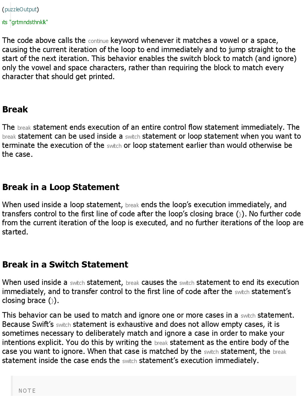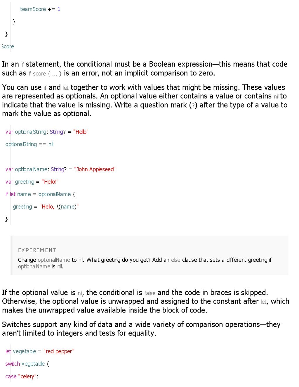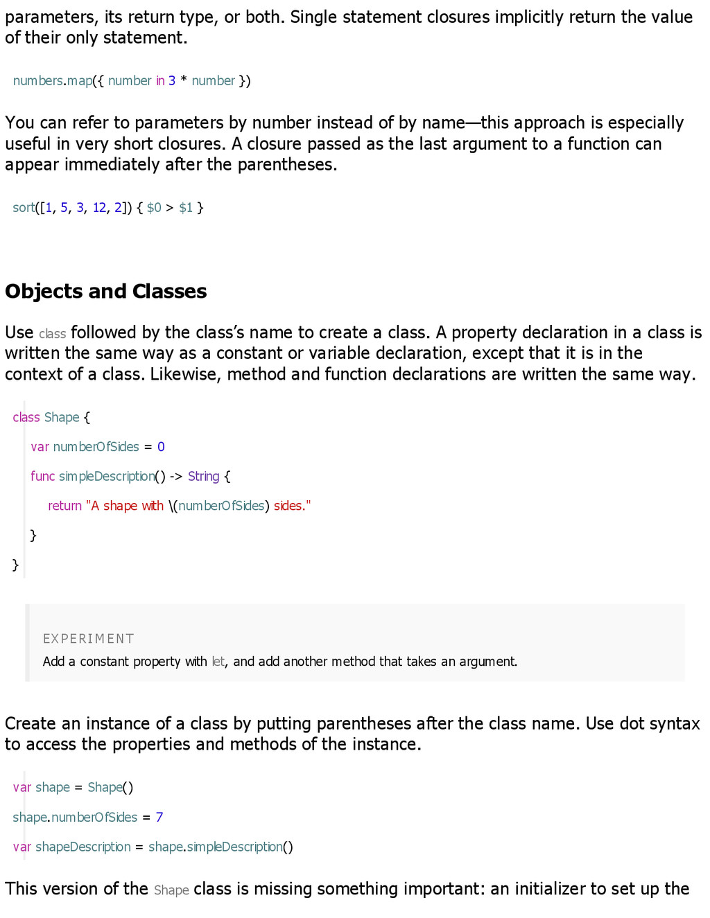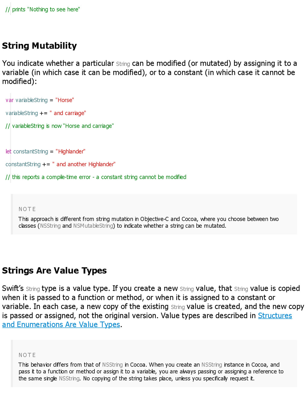 it will return a value must always do so. A function with a defined return type cannot allow control to fall out of the bottom of the function without returning a value, and attempting to do so will result in a compile-time error. Functions with Multiple Return Values You can use a tuple type as the return type for a function to return multiple values as part of one compound return value. The example below defines a function called count, which counts the number of vowels, consonants, and other characters in a string, based on the standard set of vowels and consonants used in American English: func count(string: String) -> (vowels: Int, consonants: Int, others: Int) { var vowels = 0, consonants = 0, others = 0 for character in string { switch String(character).lowercaseString { case "a", "e", "i", "o", "u": ++vowels case "b", "c", "d", "f", "g", "h", "j", "k", "l", "m", "n", "p", "q", "r", "s", "t", "v", "w", "x", "y", "z": ++consonants default: ++others } eturn (vowels, consonants, others) You can use this count function to count the characters in an arbitrary string, and to retrieve the counted totals as a tuple of three named Int values: let total = count("some arbitrary string!") println("\(total.vowels) vowels and \(total.consonants) consonants")