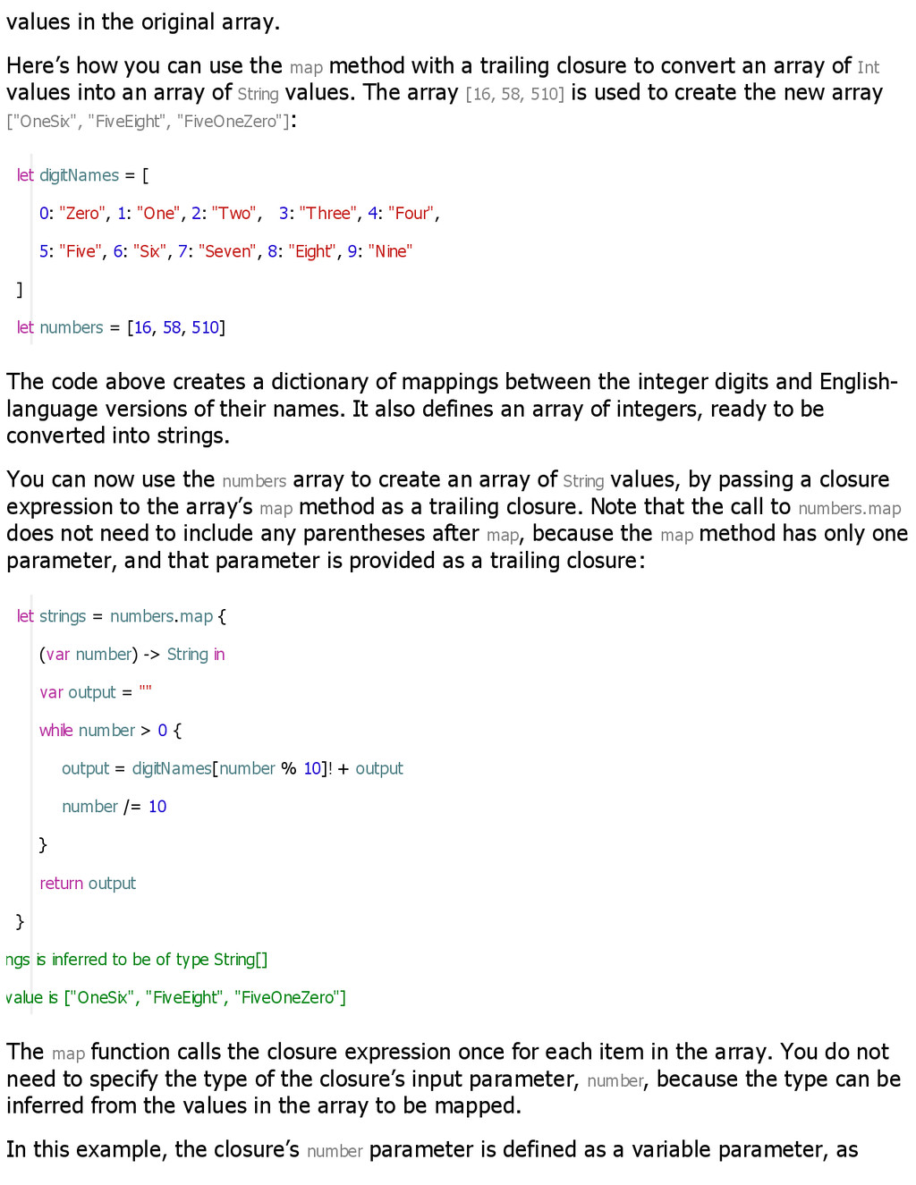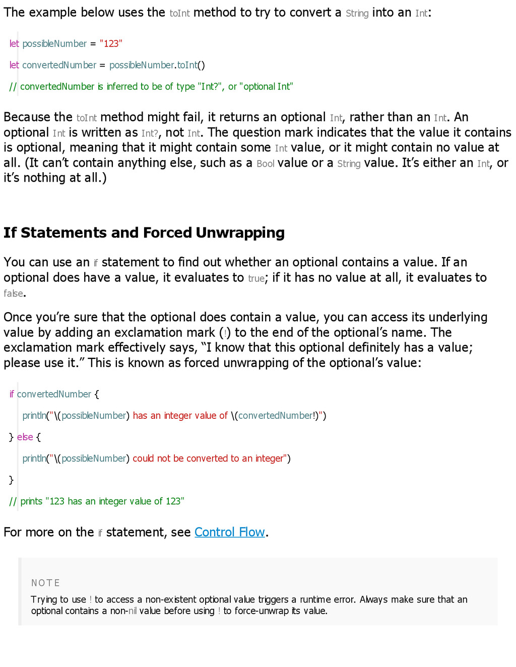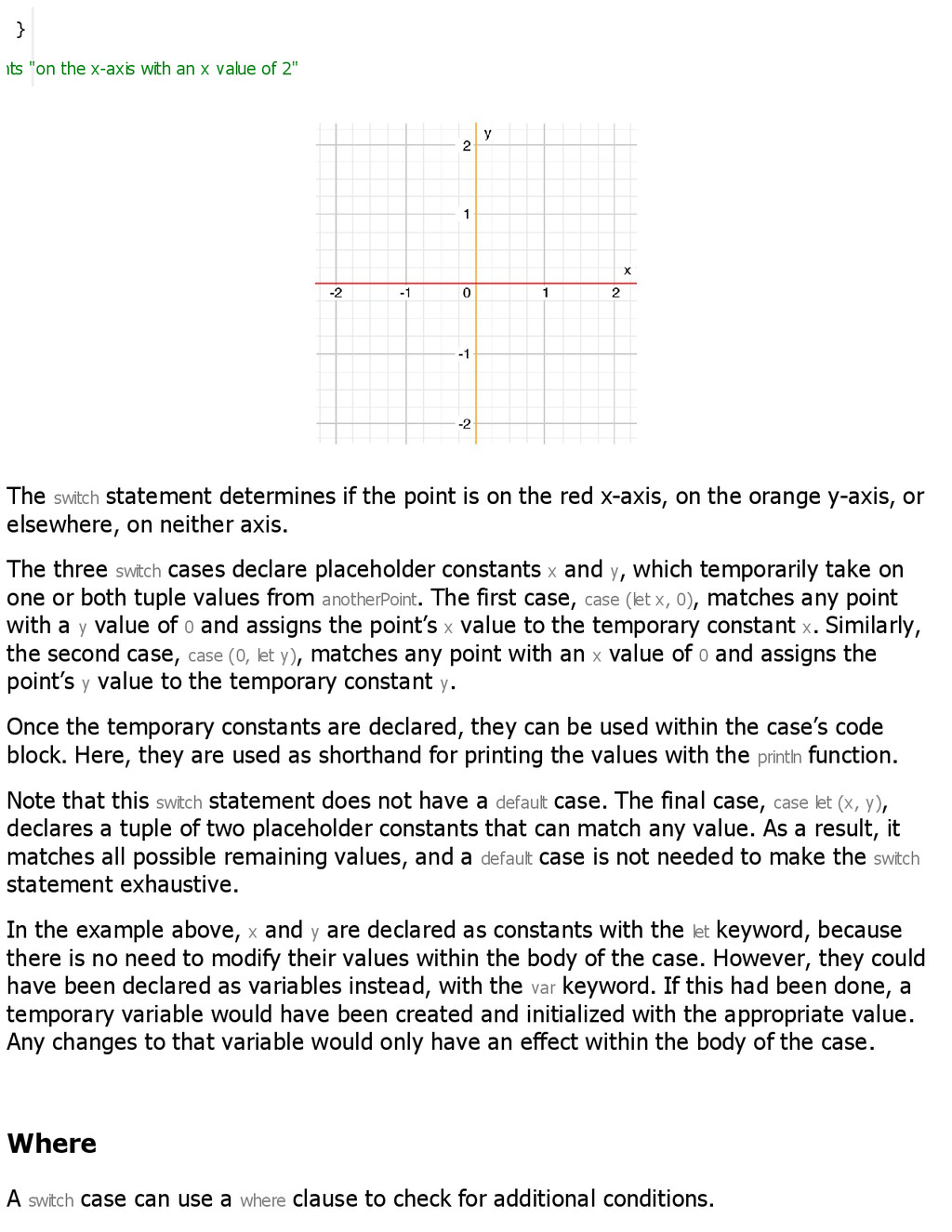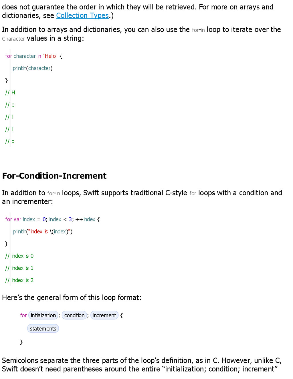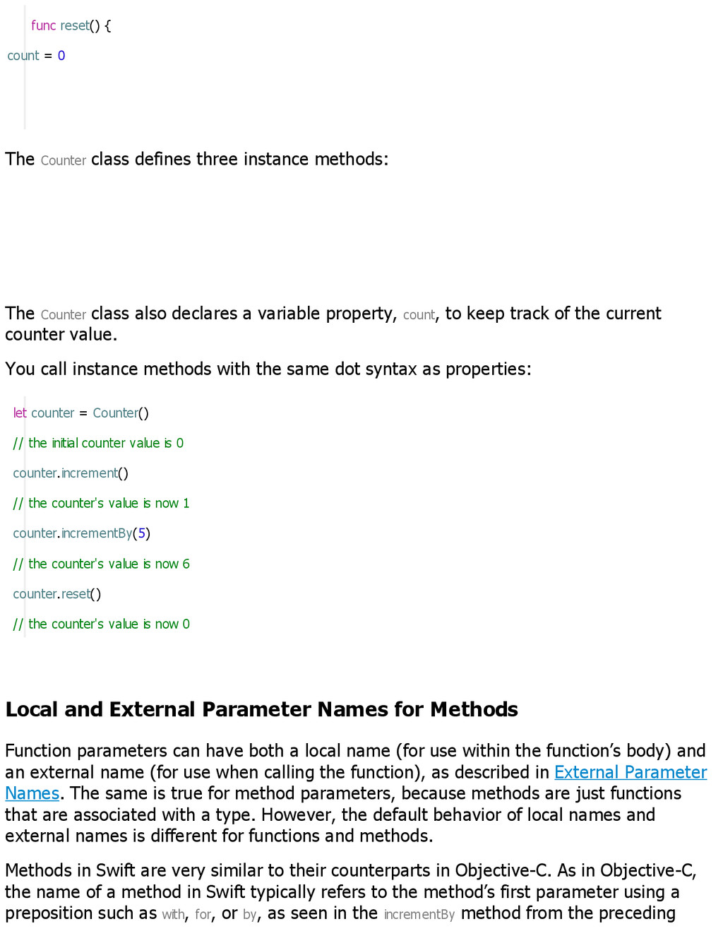 it will return a value must always do so. A function with a defined return type cannot allow control to fall out of the bottom of the function without returning a value, and attempting to do so will result in a compile-time error. Functions with Multiple Return Values You can use a tuple type as the return type for a function to return multiple values as part of one compound return value. The example below defines a function called count, which counts the number of vowels, consonants, and other characters in a string, based on the standard set of vowels and consonants used in American English: func count(string: String) -> (vowels: Int, consonants: Int, others: Int) { var vowels = 0, consonants = 0, others = 0 for character in string { switch String(character).lowercaseString { case "a", "e", "i", "o", "u": ++vowels case "b", "c", "d", "f", "g", "h", "j", "k", "l", "m", "n", "p", "q", "r", "s", "t", "v", "w", "x", "y", "z": ++consonants default: ++others } eturn (vowels, consonants, others) You can use this count function to count the characters in an arbitrary string, and to retrieve the counted totals as a tuple of three named Int values: let total = count("some arbitrary string!") println("\(total.vowels) vowels and \(total.consonants) consonants")