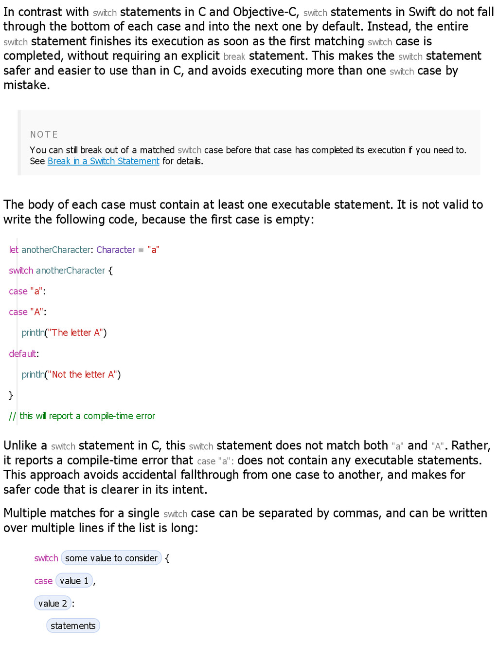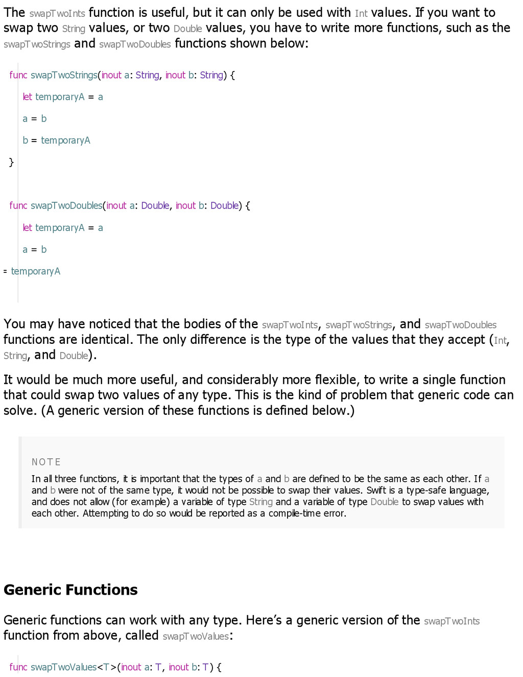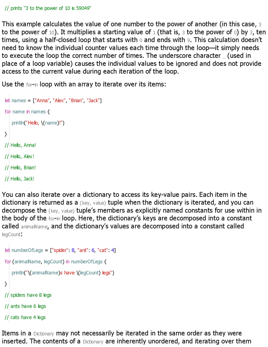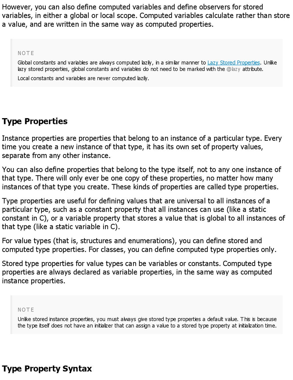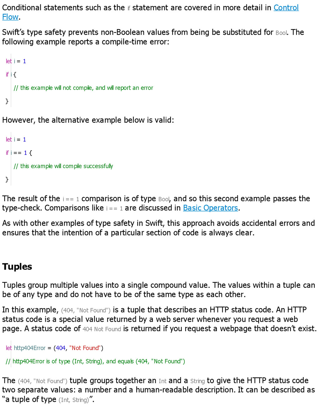 it will return a value must always do so. A function with a defined return type cannot allow control to fall out of the bottom of the function without returning a value, and attempting to do so will result in a compile-time error. Functions with Multiple Return Values You can use a tuple type as the return type for a function to return multiple values as part of one compound return value. The example below defines a function called count, which counts the number of vowels, consonants, and other characters in a string, based on the standard set of vowels and consonants used in American English: func count(string: String) -> (vowels: Int, consonants: Int, others: Int) { var vowels = 0, consonants = 0, others = 0 for character in string { switch String(character).lowercaseString { case "a", "e", "i", "o", "u": ++vowels case "b", "c", "d", "f", "g", "h", "j", "k", "l", "m", "n", "p", "q", "r", "s", "t", "v", "w", "x", "y", "z": ++consonants default: ++others } eturn (vowels, consonants, others) You can use this count function to count the characters in an arbitrary string, and to retrieve the counted totals as a tuple of three named Int values: let total = count("some arbitrary string!") println("\(total.vowels) vowels and \(total.consonants) consonants")