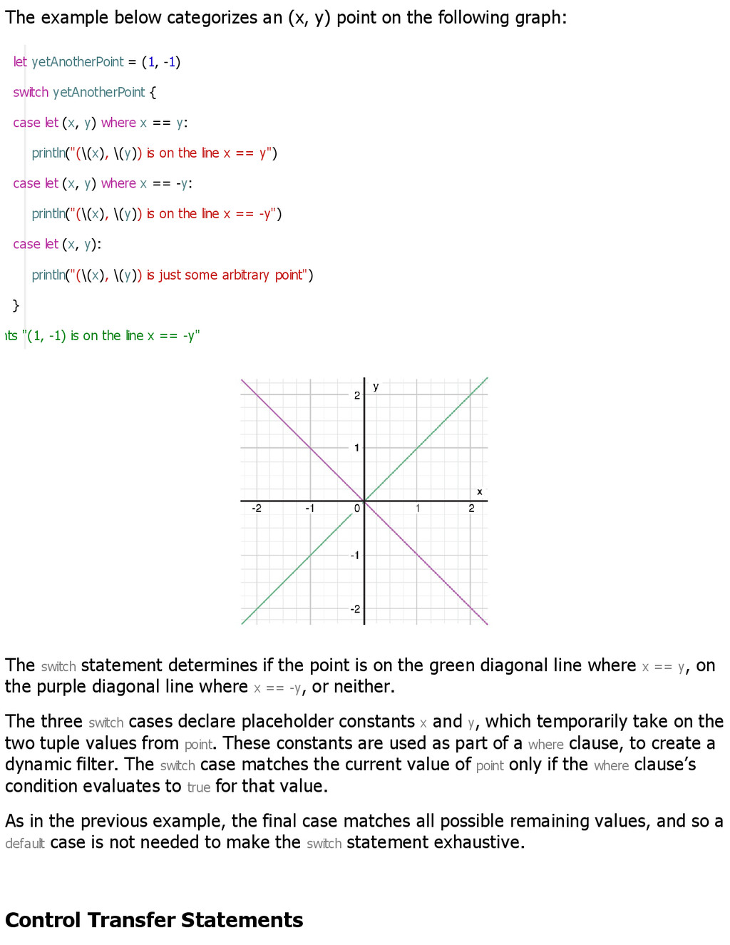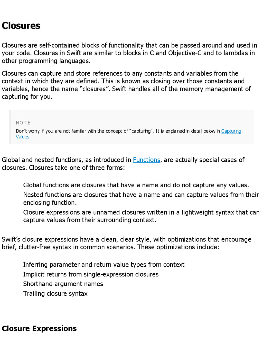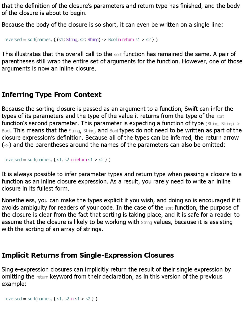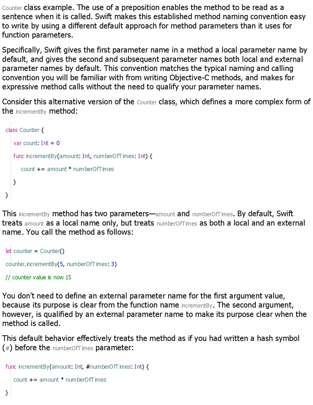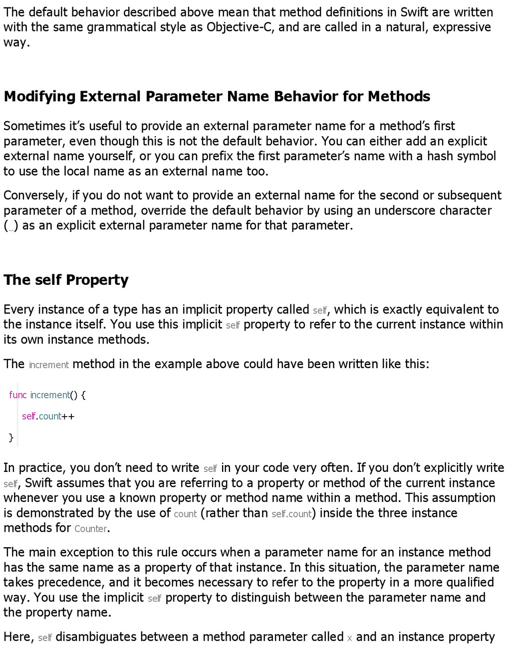 it will return a value must always do so. A function with a defined return type cannot allow control to fall out of the bottom of the function without returning a value, and attempting to do so will result in a compile-time error. Functions with Multiple Return Values You can use a tuple type as the return type for a function to return multiple values as part of one compound return value. The example below defines a function called count, which counts the number of vowels, consonants, and other characters in a string, based on the standard set of vowels and consonants used in American English: func count(string: String) -> (vowels: Int, consonants: Int, others: Int) { var vowels = 0, consonants = 0, others = 0 for character in string { switch String(character).lowercaseString { case "a", "e", "i", "o", "u": ++vowels case "b", "c", "d", "f", "g", "h", "j", "k", "l", "m", "n", "p", "q", "r", "s", "t", "v", "w", "x", "y", "z": ++consonants default: ++others } eturn (vowels, consonants, others) You can use this count function to count the characters in an arbitrary string, and to retrieve the counted totals as a tuple of three named Int values: let total = count("some arbitrary string!") println("\(total.vowels) vowels and \(total.consonants) consonants")