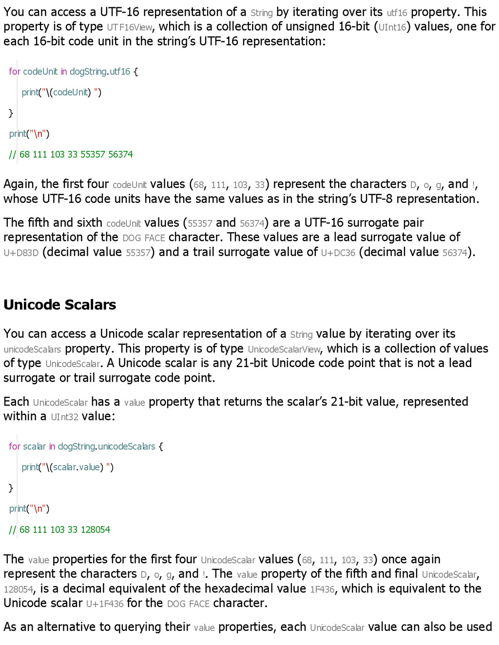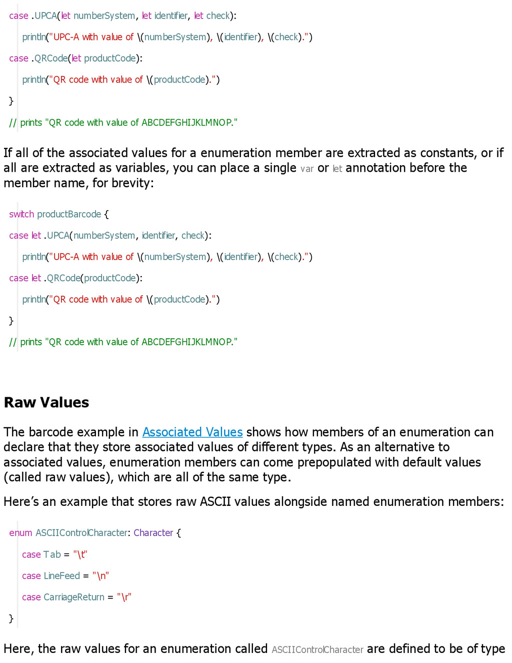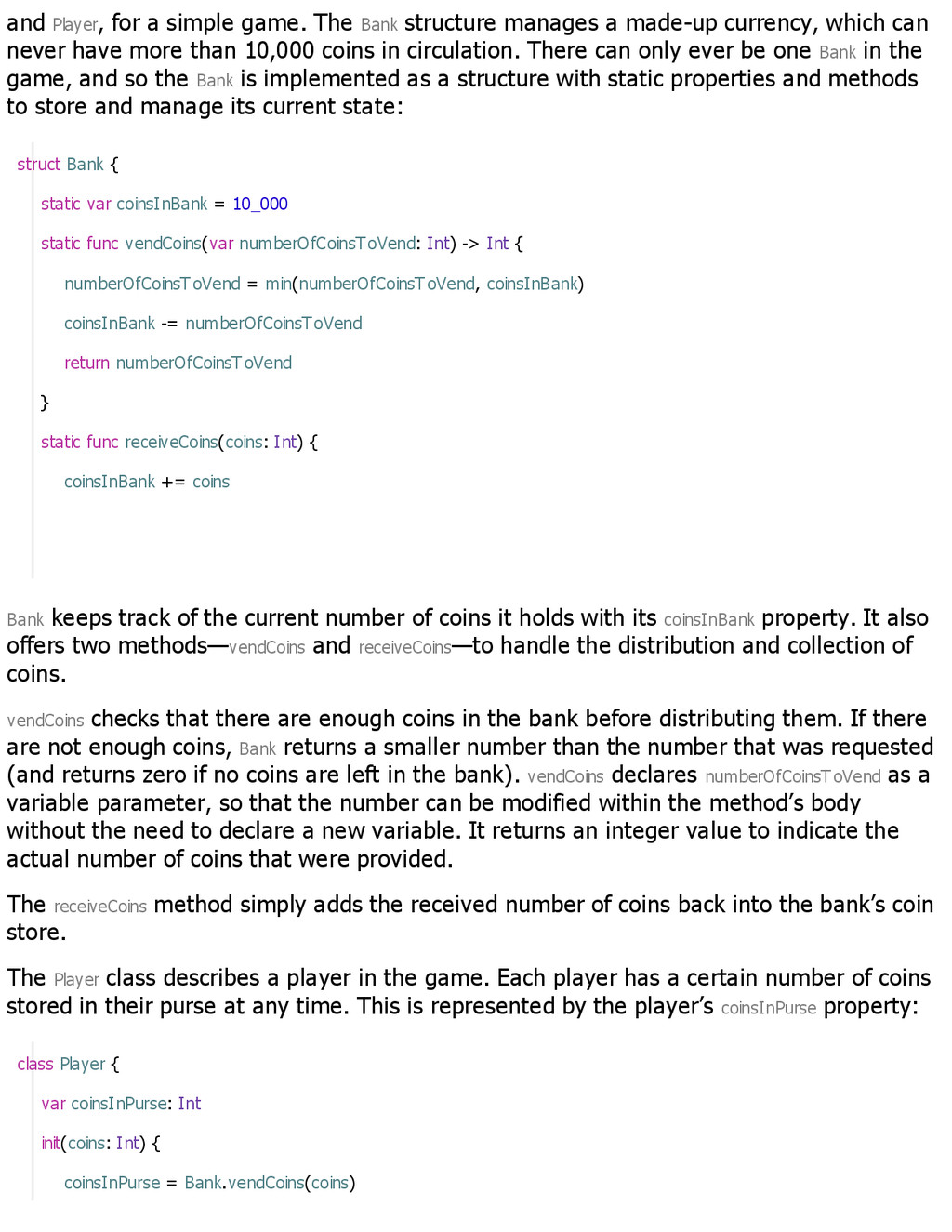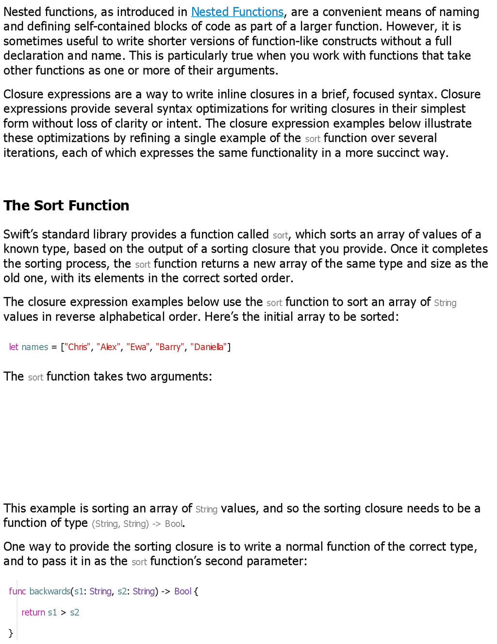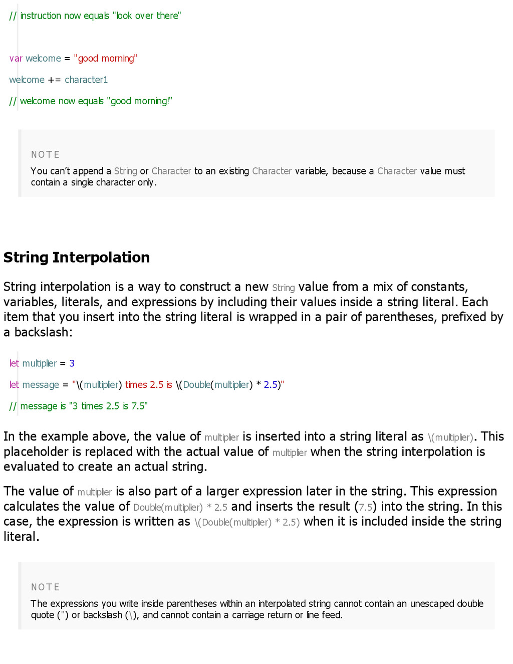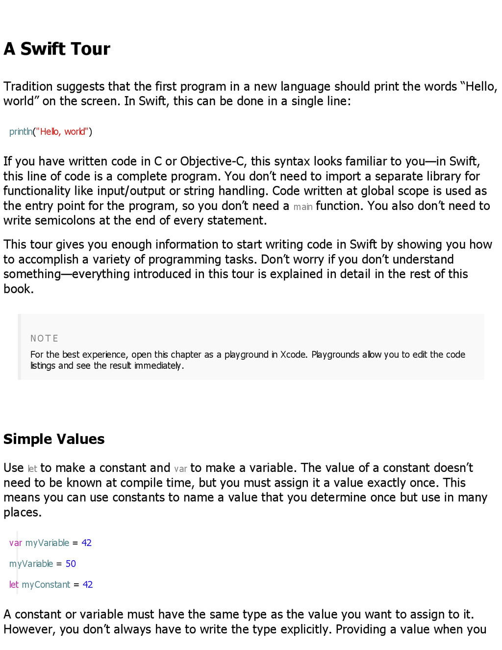 it will return a value must always do so. A function with a defined return type cannot allow control to fall out of the bottom of the function without returning a value, and attempting to do so will result in a compile-time error. Functions with Multiple Return Values You can use a tuple type as the return type for a function to return multiple values as part of one compound return value. The example below defines a function called count, which counts the number of vowels, consonants, and other characters in a string, based on the standard set of vowels and consonants used in American English: func count(string: String) -> (vowels: Int, consonants: Int, others: Int) { var vowels = 0, consonants = 0, others = 0 for character in string { switch String(character).lowercaseString { case "a", "e", "i", "o", "u": ++vowels case "b", "c", "d", "f", "g", "h", "j", "k", "l", "m", "n", "p", "q", "r", "s", "t", "v", "w", "x", "y", "z": ++consonants default: ++others } eturn (vowels, consonants, others) You can use this count function to count the characters in an arbitrary string, and to retrieve the counted totals as a tuple of three named Int values: let total = count("some arbitrary string!") println("\(total.vowels) vowels and \(total.consonants) consonants")