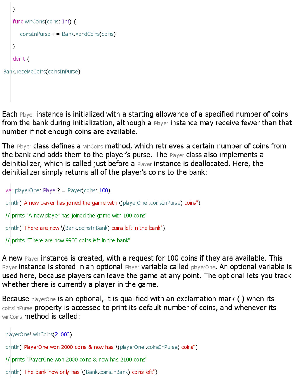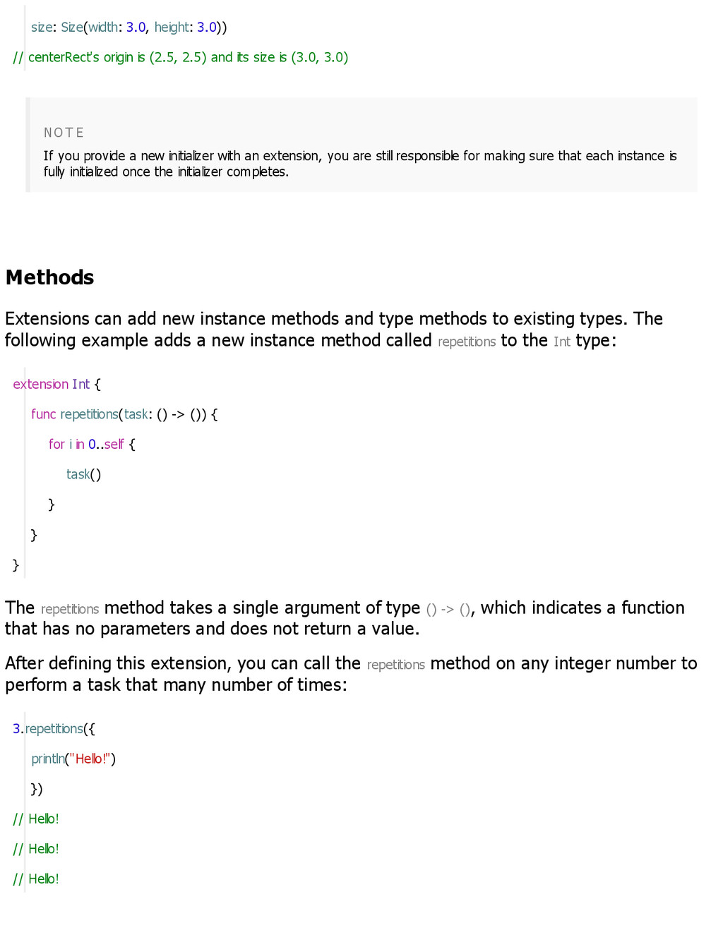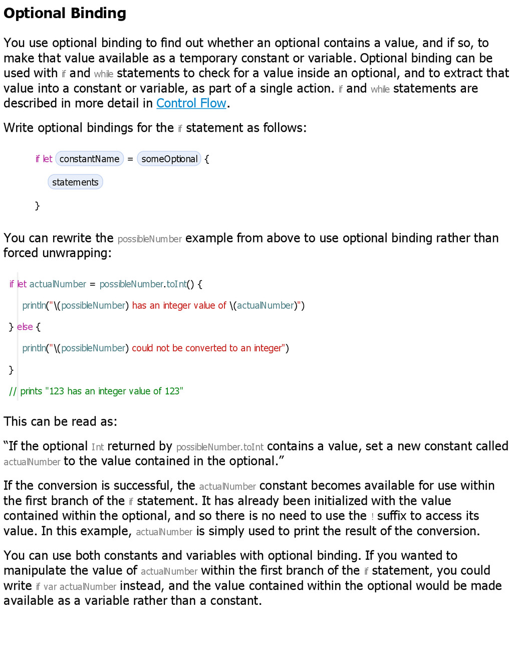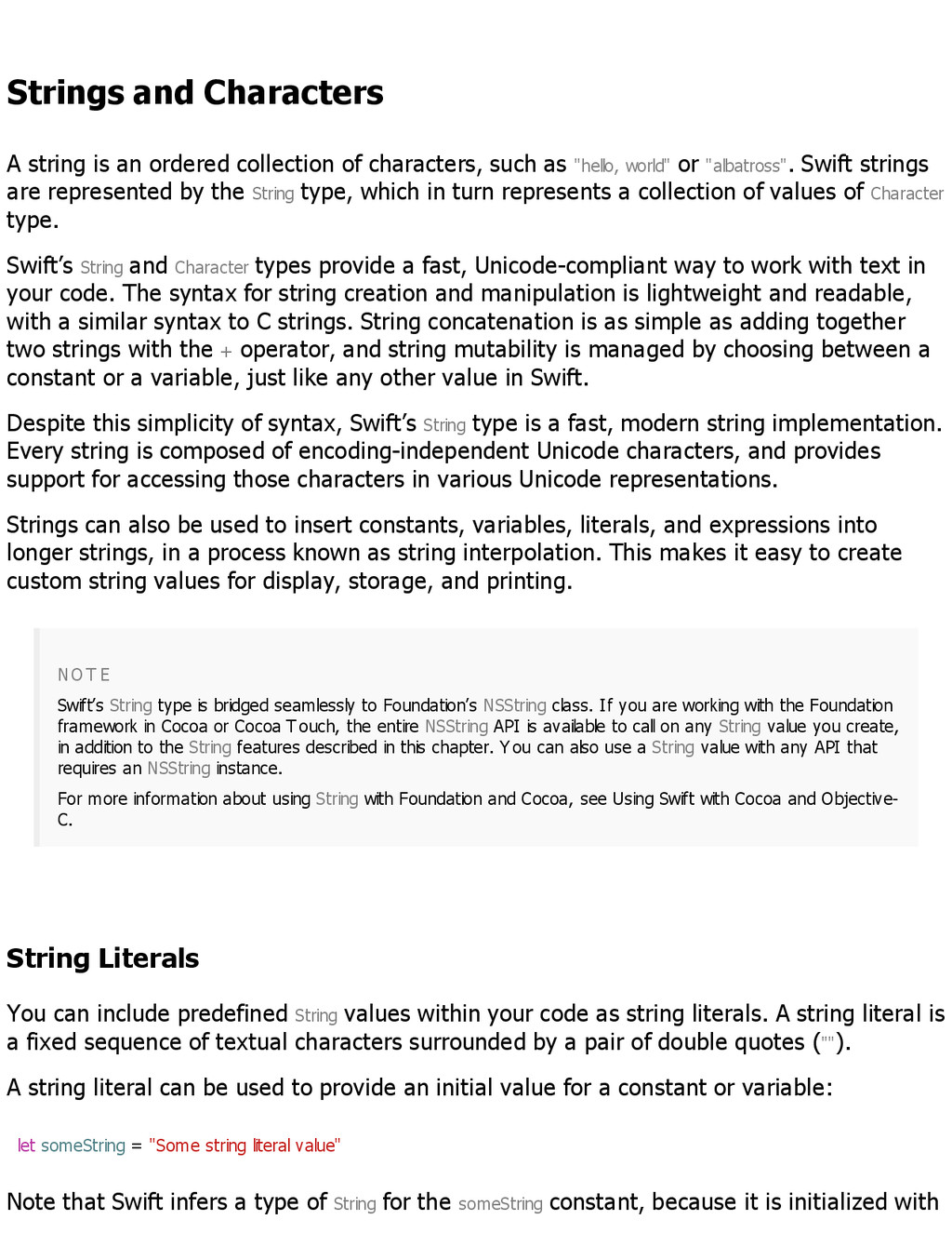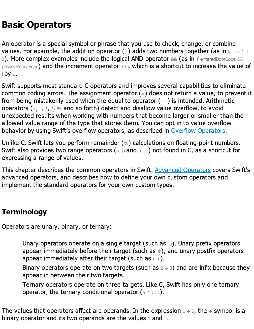 it will return a value must always do so. A function with a defined return type cannot allow control to fall out of the bottom of the function without returning a value, and attempting to do so will result in a compile-time error. Functions with Multiple Return Values You can use a tuple type as the return type for a function to return multiple values as part of one compound return value. The example below defines a function called count, which counts the number of vowels, consonants, and other characters in a string, based on the standard set of vowels and consonants used in American English: func count(string: String) -> (vowels: Int, consonants: Int, others: Int) { var vowels = 0, consonants = 0, others = 0 for character in string { switch String(character).lowercaseString { case "a", "e", "i", "o", "u": ++vowels case "b", "c", "d", "f", "g", "h", "j", "k", "l", "m", "n", "p", "q", "r", "s", "t", "v", "w", "x", "y", "z": ++consonants default: ++others } eturn (vowels, consonants, others) You can use this count function to count the characters in an arbitrary string, and to retrieve the counted totals as a tuple of three named Int values: let total = count("some arbitrary string!") println("\(total.vowels) vowels and \(total.consonants) consonants")