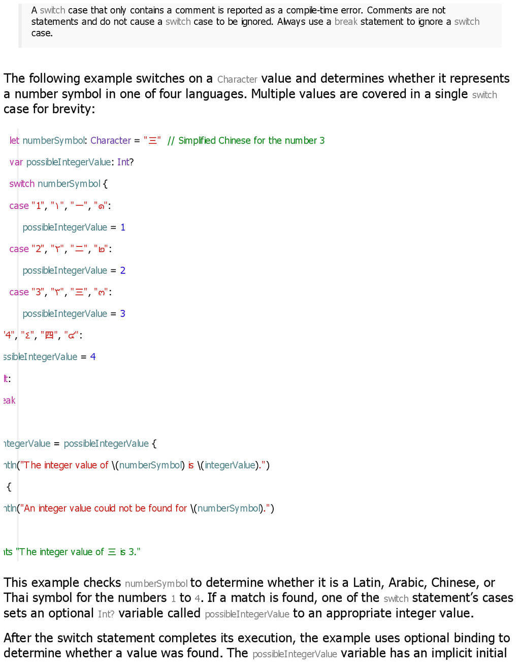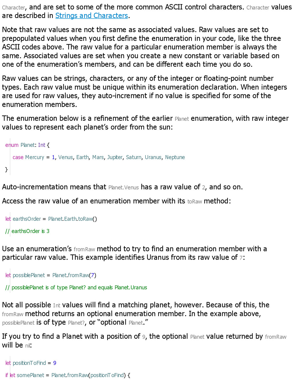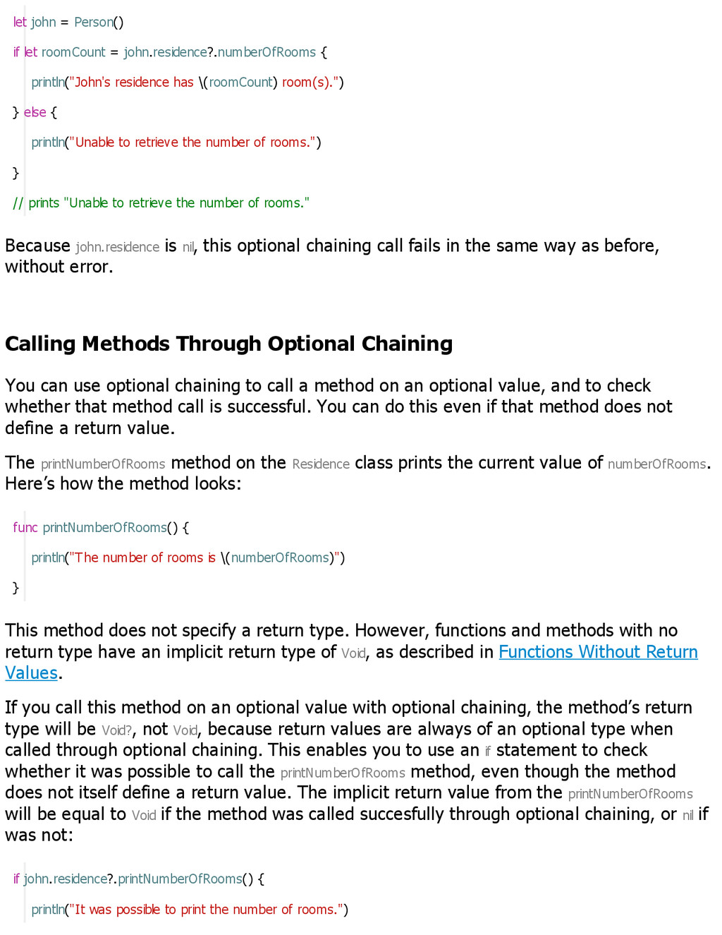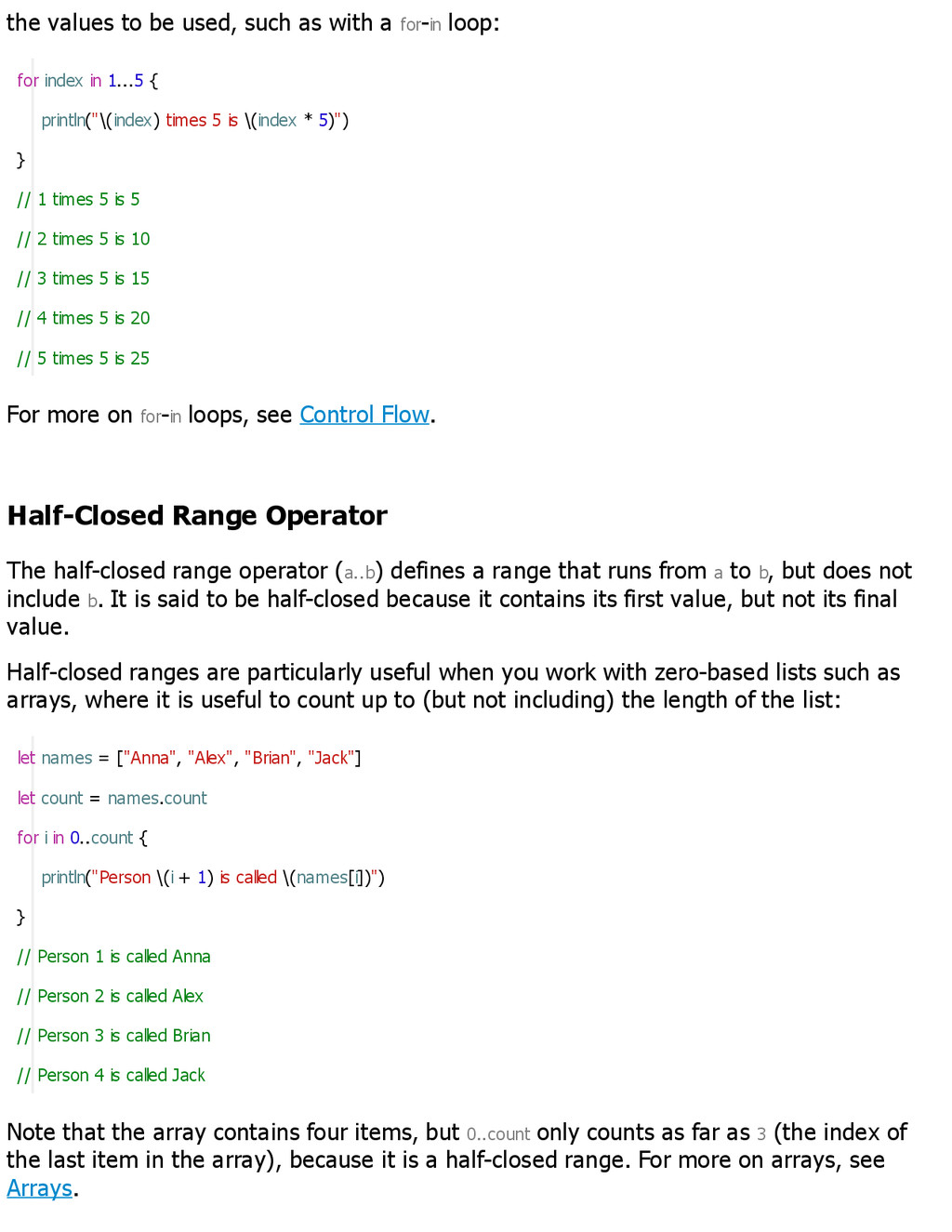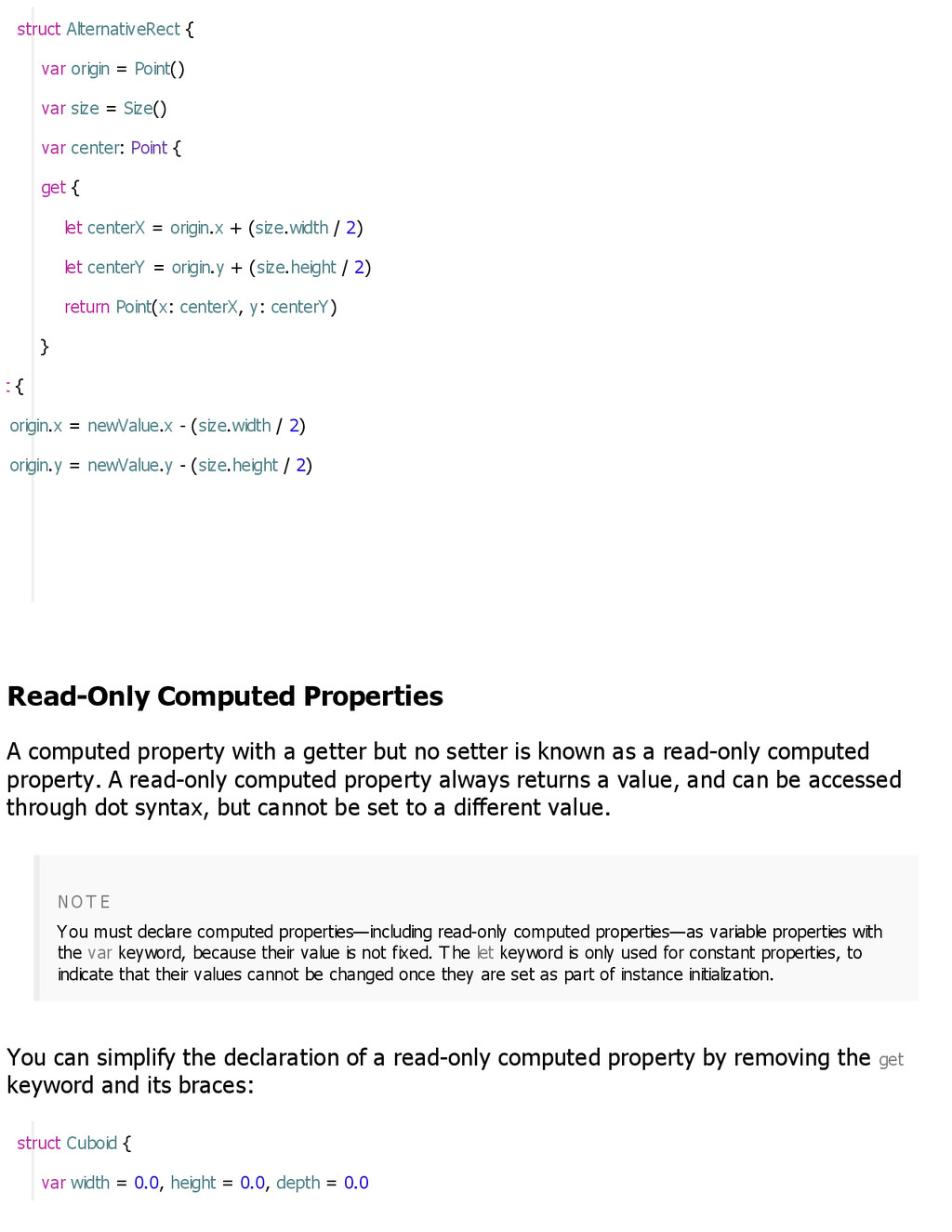 it will return a value must always do so. A function with a defined return type cannot allow control to fall out of the bottom of the function without returning a value, and attempting to do so will result in a compile-time error. Functions with Multiple Return Values You can use a tuple type as the return type for a function to return multiple values as part of one compound return value. The example below defines a function called count, which counts the number of vowels, consonants, and other characters in a string, based on the standard set of vowels and consonants used in American English: func count(string: String) -> (vowels: Int, consonants: Int, others: Int) { var vowels = 0, consonants = 0, others = 0 for character in string { switch String(character).lowercaseString { case "a", "e", "i", "o", "u": ++vowels case "b", "c", "d", "f", "g", "h", "j", "k", "l", "m", "n", "p", "q", "r", "s", "t", "v", "w", "x", "y", "z": ++consonants default: ++others } eturn (vowels, consonants, others) You can use this count function to count the characters in an arbitrary string, and to retrieve the counted totals as a tuple of three named Int values: let total = count("some arbitrary string!") println("\(total.vowels) vowels and \(total.consonants) consonants")