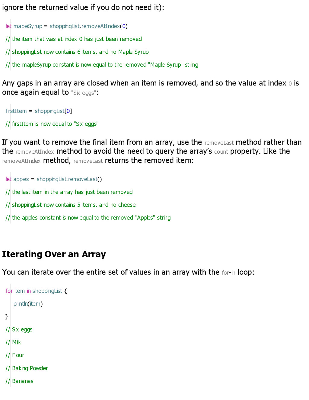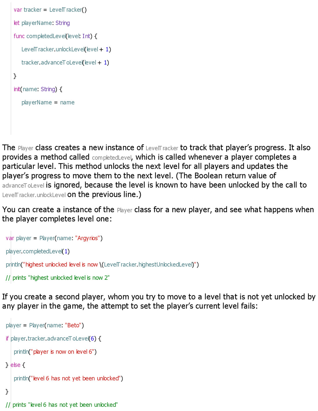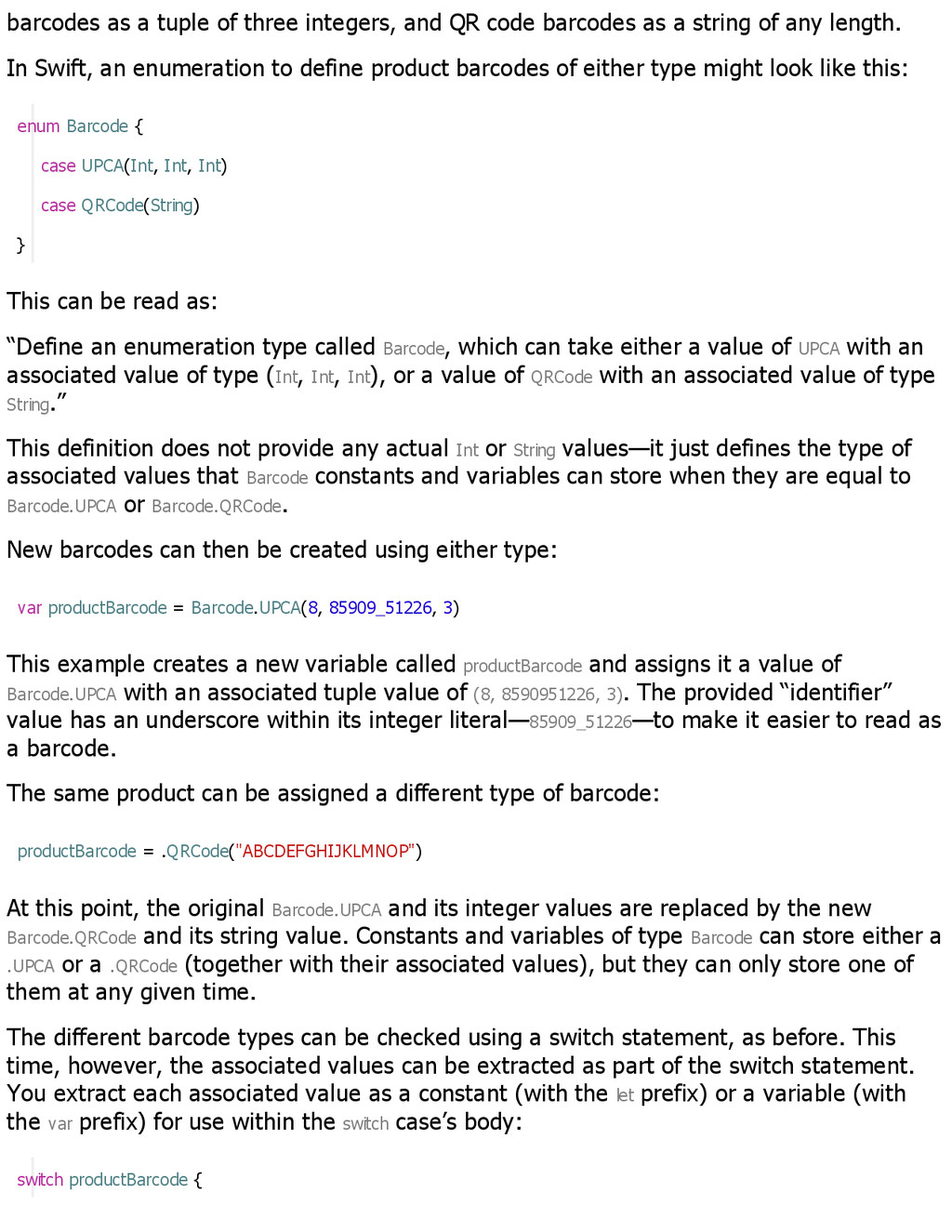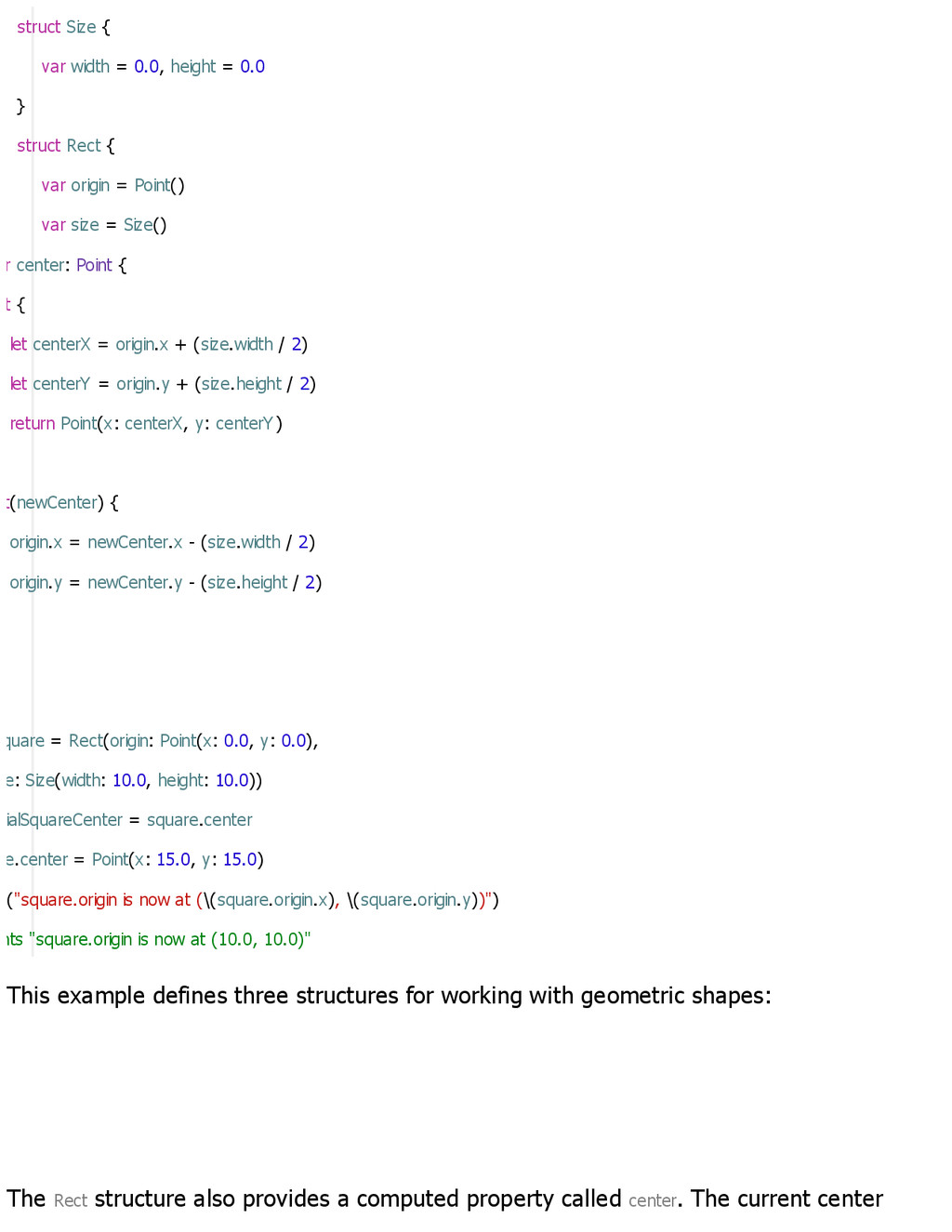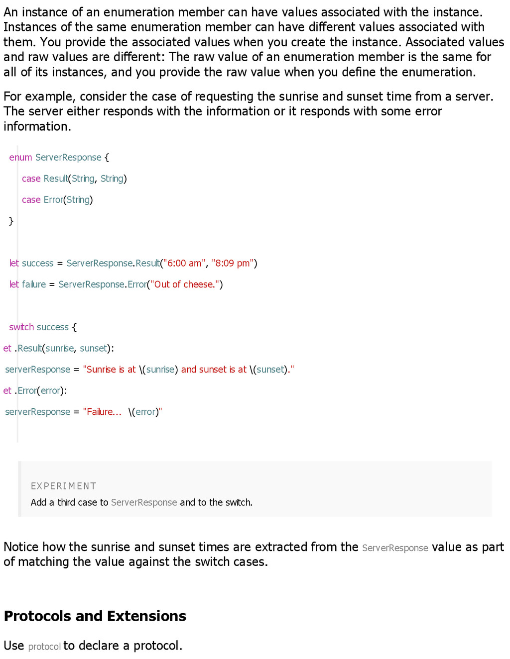 it will return a value must always do so. A function with a defined return type cannot allow control to fall out of the bottom of the function without returning a value, and attempting to do so will result in a compile-time error. Functions with Multiple Return Values You can use a tuple type as the return type for a function to return multiple values as part of one compound return value. The example below defines a function called count, which counts the number of vowels, consonants, and other characters in a string, based on the standard set of vowels and consonants used in American English: func count(string: String) -> (vowels: Int, consonants: Int, others: Int) { var vowels = 0, consonants = 0, others = 0 for character in string { switch String(character).lowercaseString { case "a", "e", "i", "o", "u": ++vowels case "b", "c", "d", "f", "g", "h", "j", "k", "l", "m", "n", "p", "q", "r", "s", "t", "v", "w", "x", "y", "z": ++consonants default: ++others } eturn (vowels, consonants, others) You can use this count function to count the characters in an arbitrary string, and to retrieve the counted totals as a tuple of three named Int values: let total = count("some arbitrary string!") println("\(total.vowels) vowels and \(total.consonants) consonants")