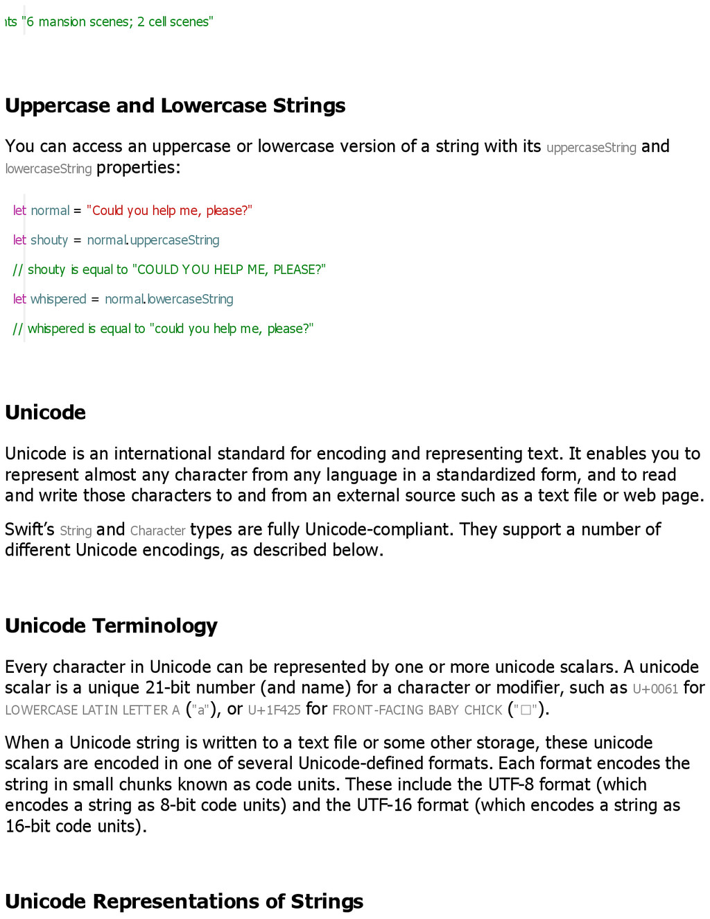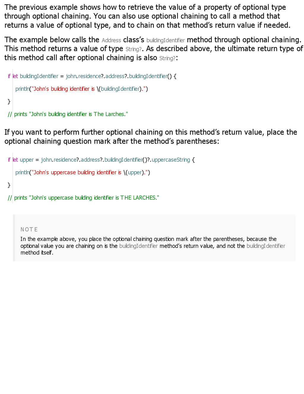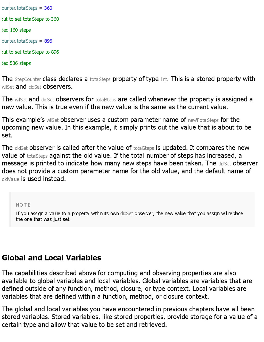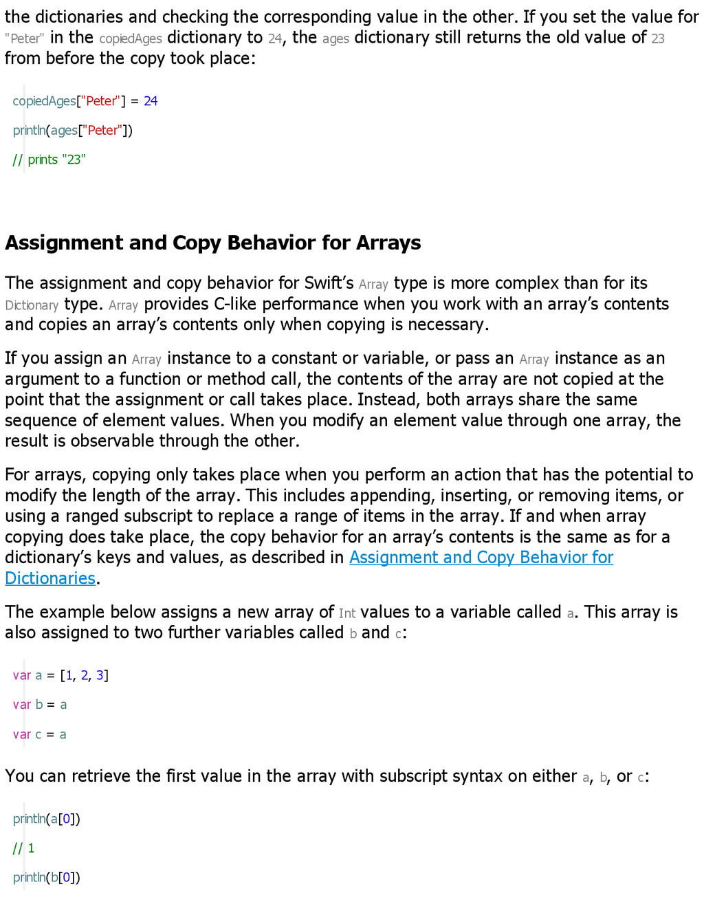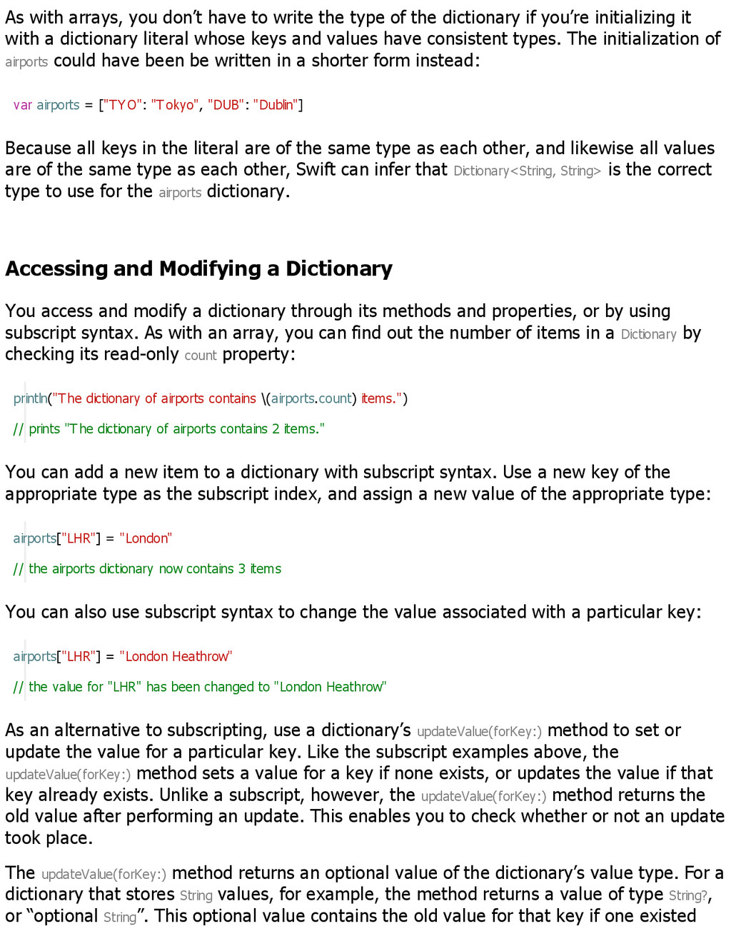 it will return a value must always do so. A function with a defined return type cannot allow control to fall out of the bottom of the function without returning a value, and attempting to do so will result in a compile-time error. Functions with Multiple Return Values You can use a tuple type as the return type for a function to return multiple values as part of one compound return value. The example below defines a function called count, which counts the number of vowels, consonants, and other characters in a string, based on the standard set of vowels and consonants used in American English: func count(string: String) -> (vowels: Int, consonants: Int, others: Int) { var vowels = 0, consonants = 0, others = 0 for character in string { switch String(character).lowercaseString { case "a", "e", "i", "o", "u": ++vowels case "b", "c", "d", "f", "g", "h", "j", "k", "l", "m", "n", "p", "q", "r", "s", "t", "v", "w", "x", "y", "z": ++consonants default: ++others } eturn (vowels, consonants, others) You can use this count function to count the characters in an arbitrary string, and to retrieve the counted totals as a tuple of three named Int values: let total = count("some arbitrary string!") println("\(total.vowels) vowels and \(total.consonants) consonants")
