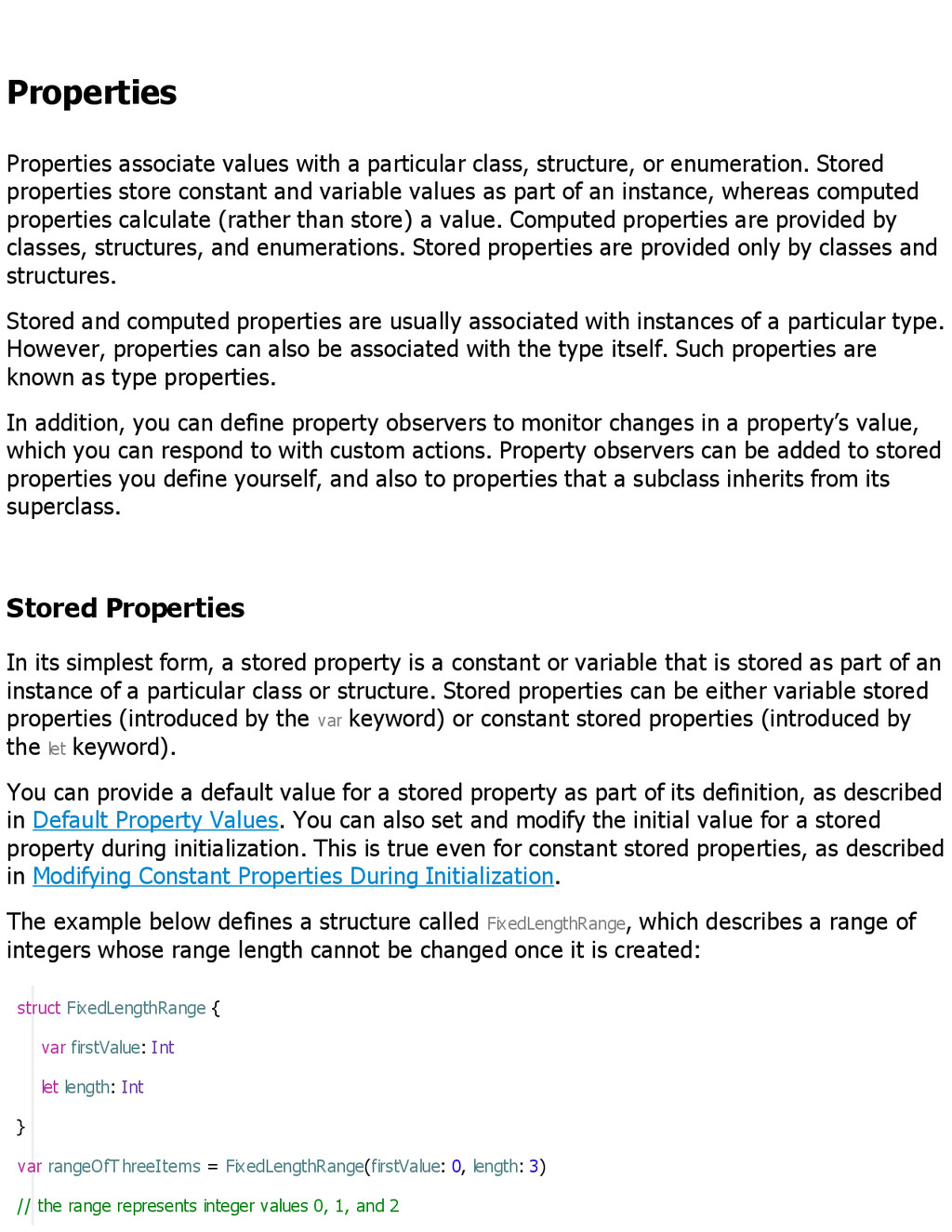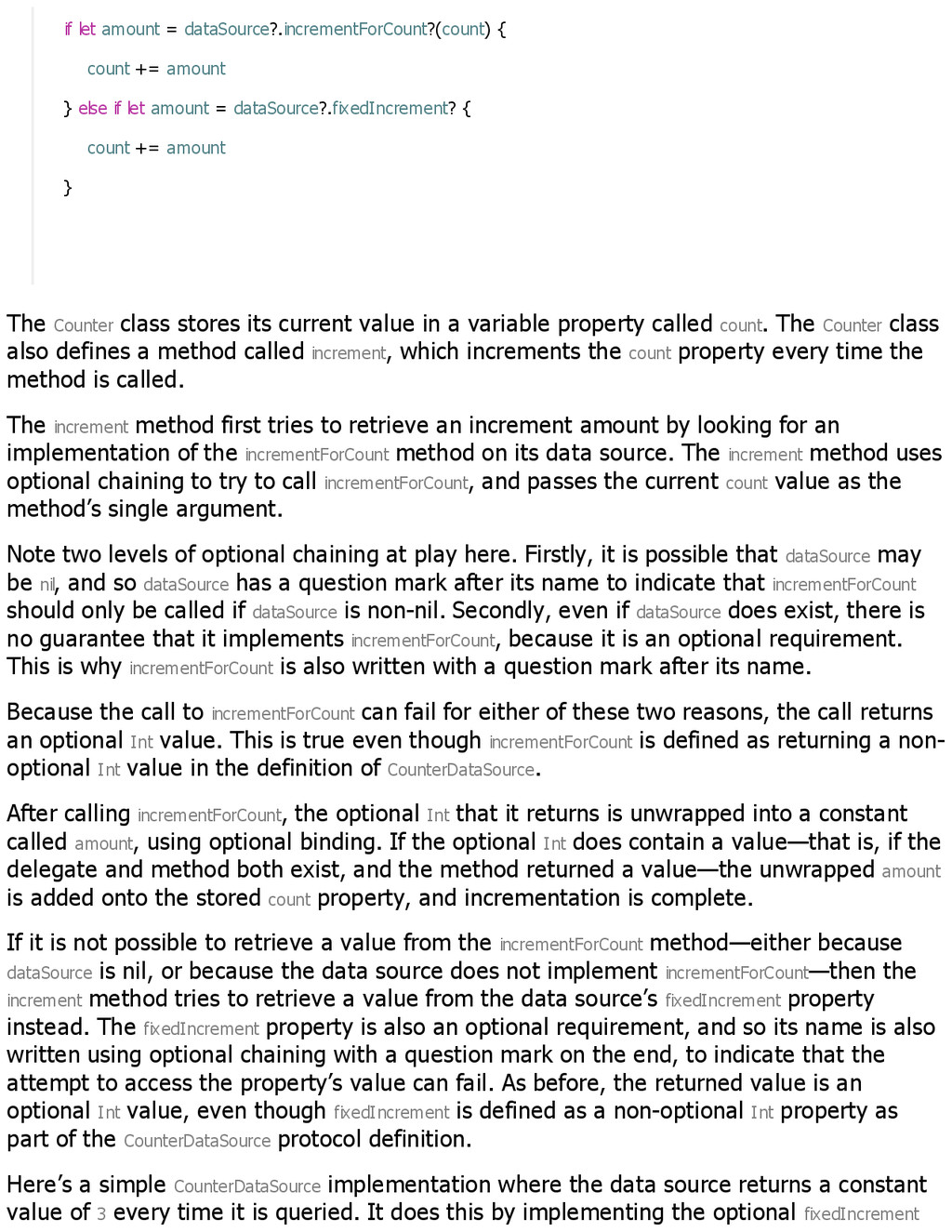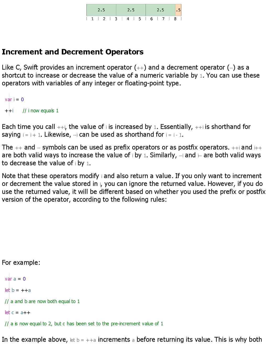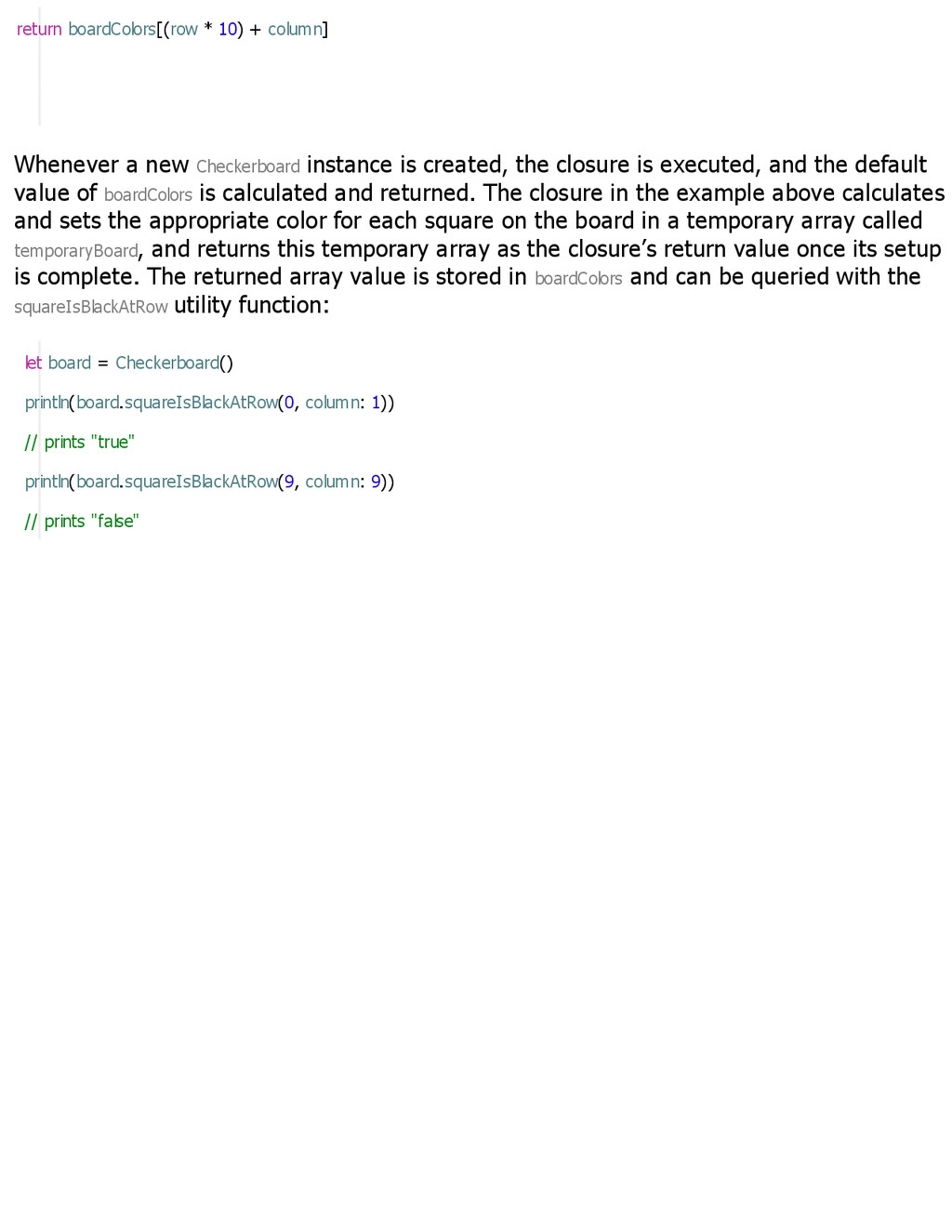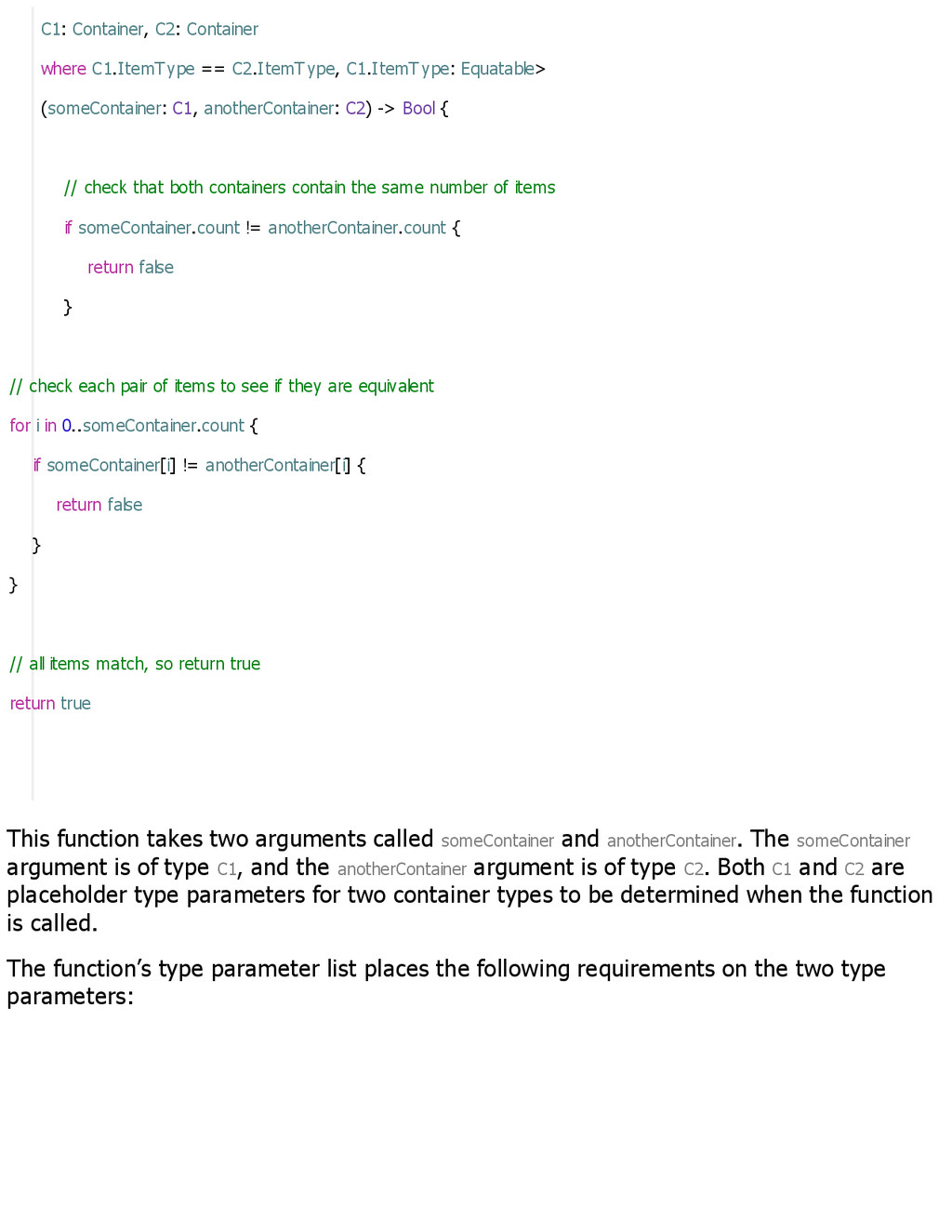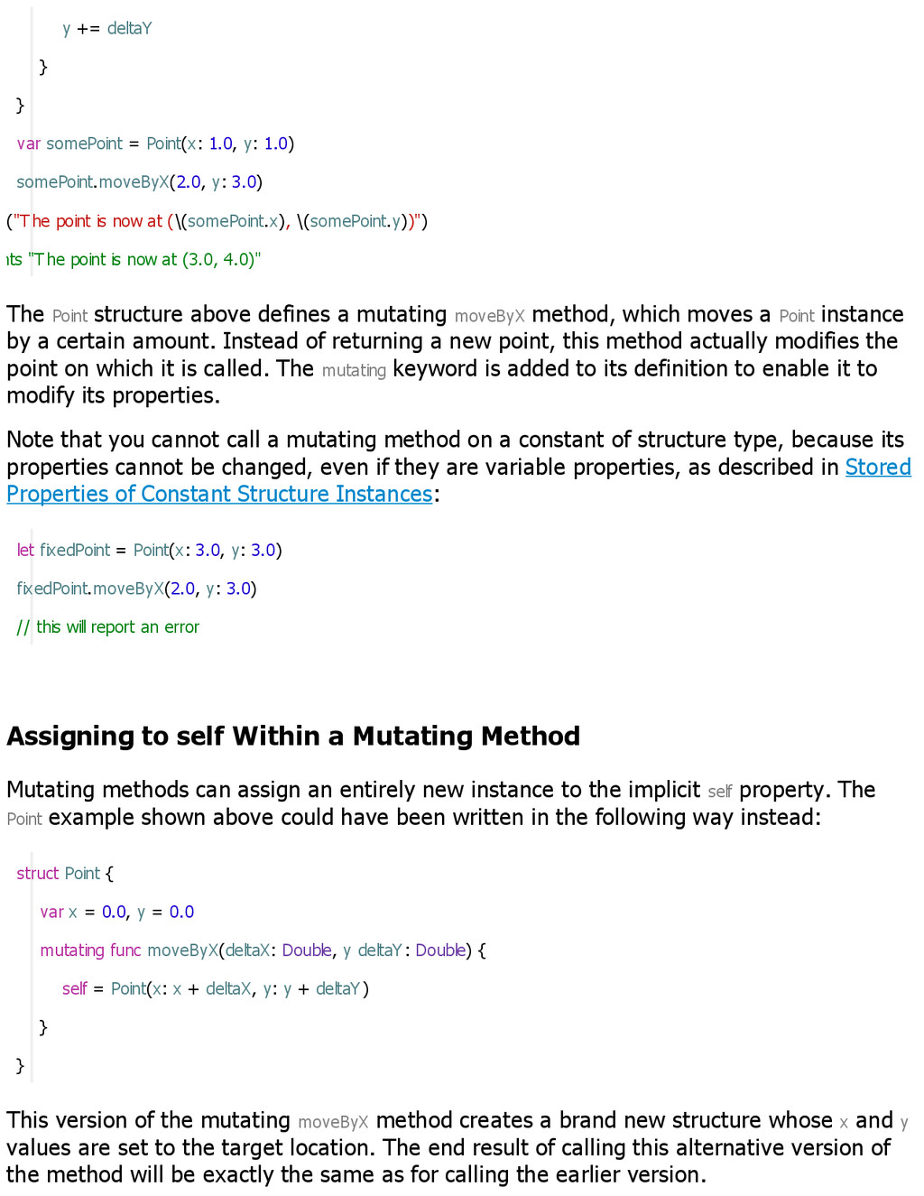 it will return a value must always do so. A function with a defined return type cannot allow control to fall out of the bottom of the function without returning a value, and attempting to do so will result in a compile-time error. Functions with Multiple Return Values You can use a tuple type as the return type for a function to return multiple values as part of one compound return value. The example below defines a function called count, which counts the number of vowels, consonants, and other characters in a string, based on the standard set of vowels and consonants used in American English: func count(string: String) -> (vowels: Int, consonants: Int, others: Int) { var vowels = 0, consonants = 0, others = 0 for character in string { switch String(character).lowercaseString { case "a", "e", "i", "o", "u": ++vowels case "b", "c", "d", "f", "g", "h", "j", "k", "l", "m", "n", "p", "q", "r", "s", "t", "v", "w", "x", "y", "z": ++consonants default: ++others } eturn (vowels, consonants, others) You can use this count function to count the characters in an arbitrary string, and to retrieve the counted totals as a tuple of three named Int values: let total = count("some arbitrary string!") println("\(total.vowels) vowels and \(total.consonants) consonants")