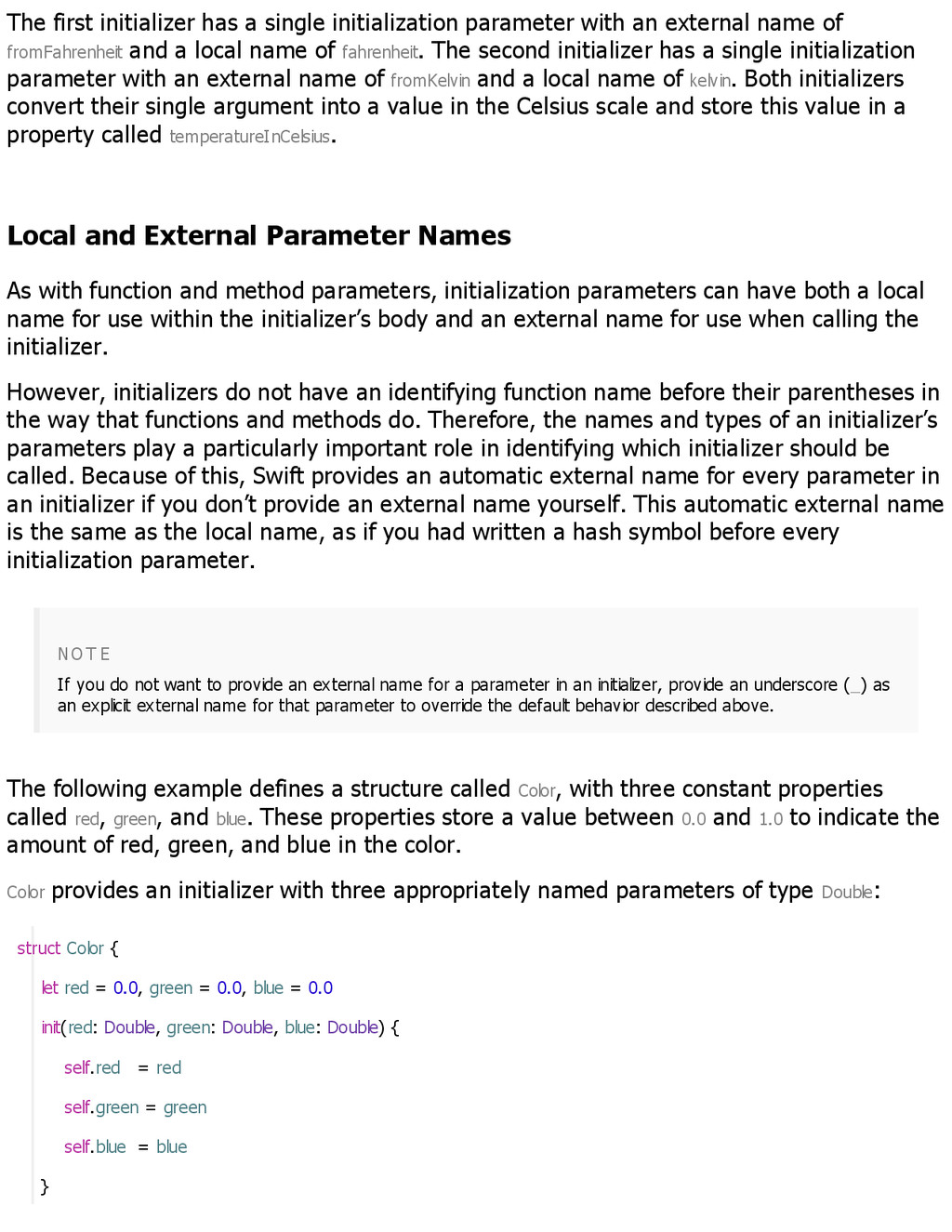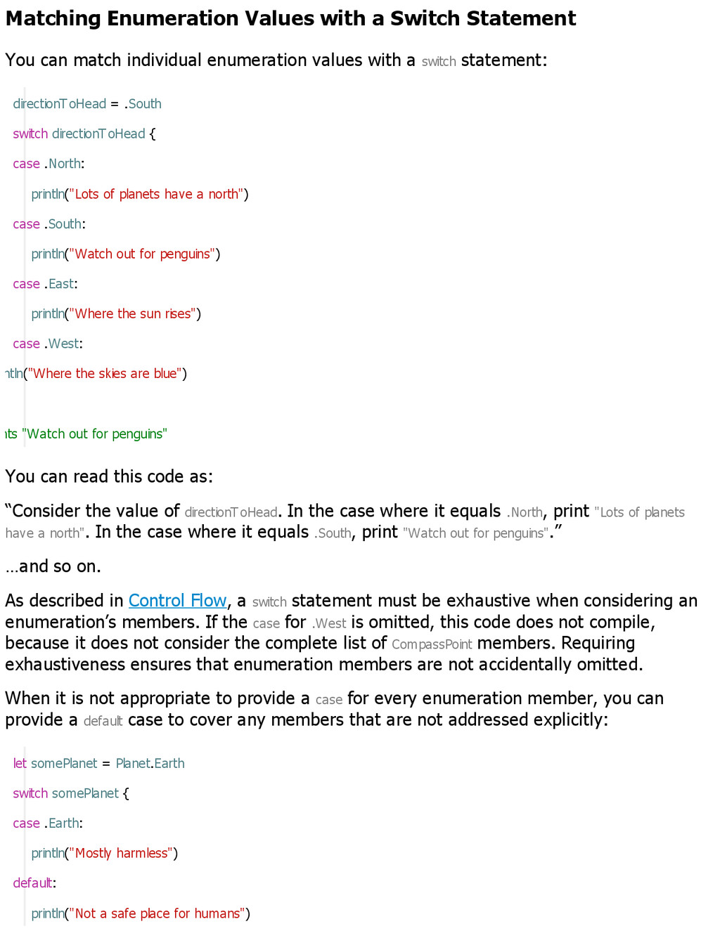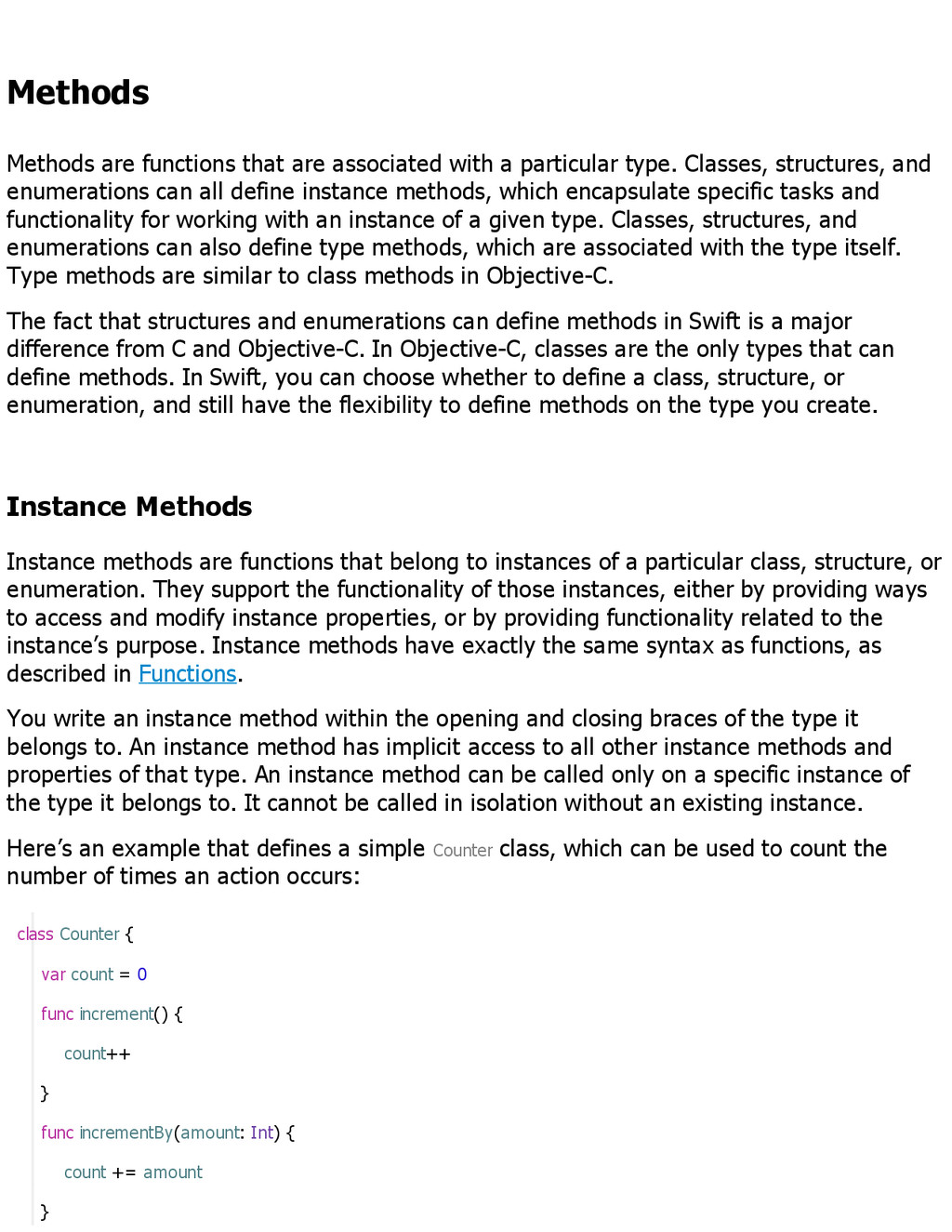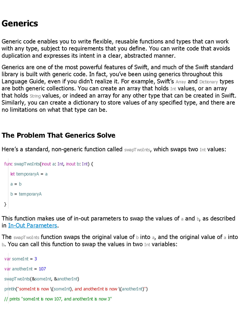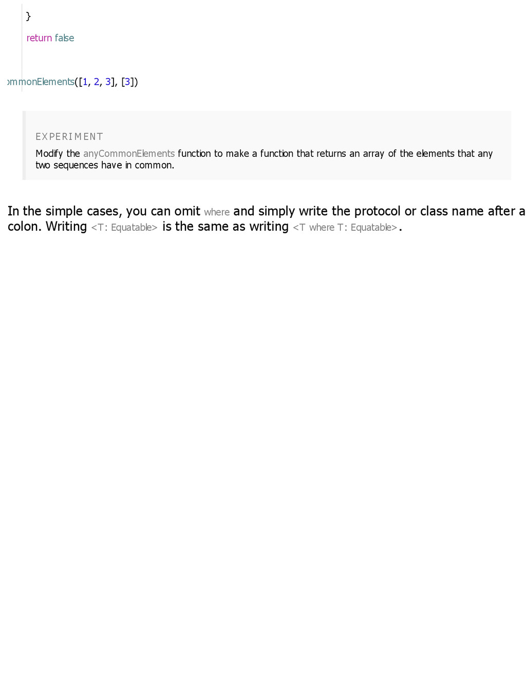 it will return a value must always do so. A function with a defined return type cannot allow control to fall out of the bottom of the function without returning a value, and attempting to do so will result in a compile-time error. Functions with Multiple Return Values You can use a tuple type as the return type for a function to return multiple values as part of one compound return value. The example below defines a function called count, which counts the number of vowels, consonants, and other characters in a string, based on the standard set of vowels and consonants used in American English: func count(string: String) -> (vowels: Int, consonants: Int, others: Int) { var vowels = 0, consonants = 0, others = 0 for character in string { switch String(character).lowercaseString { case "a", "e", "i", "o", "u": ++vowels case "b", "c", "d", "f", "g", "h", "j", "k", "l", "m", "n", "p", "q", "r", "s", "t", "v", "w", "x", "y", "z": ++consonants default: ++others } eturn (vowels, consonants, others) You can use this count function to count the characters in an arbitrary string, and to retrieve the counted totals as a tuple of three named Int values: let total = count("some arbitrary string!") println("\(total.vowels) vowels and \(total.consonants) consonants")
