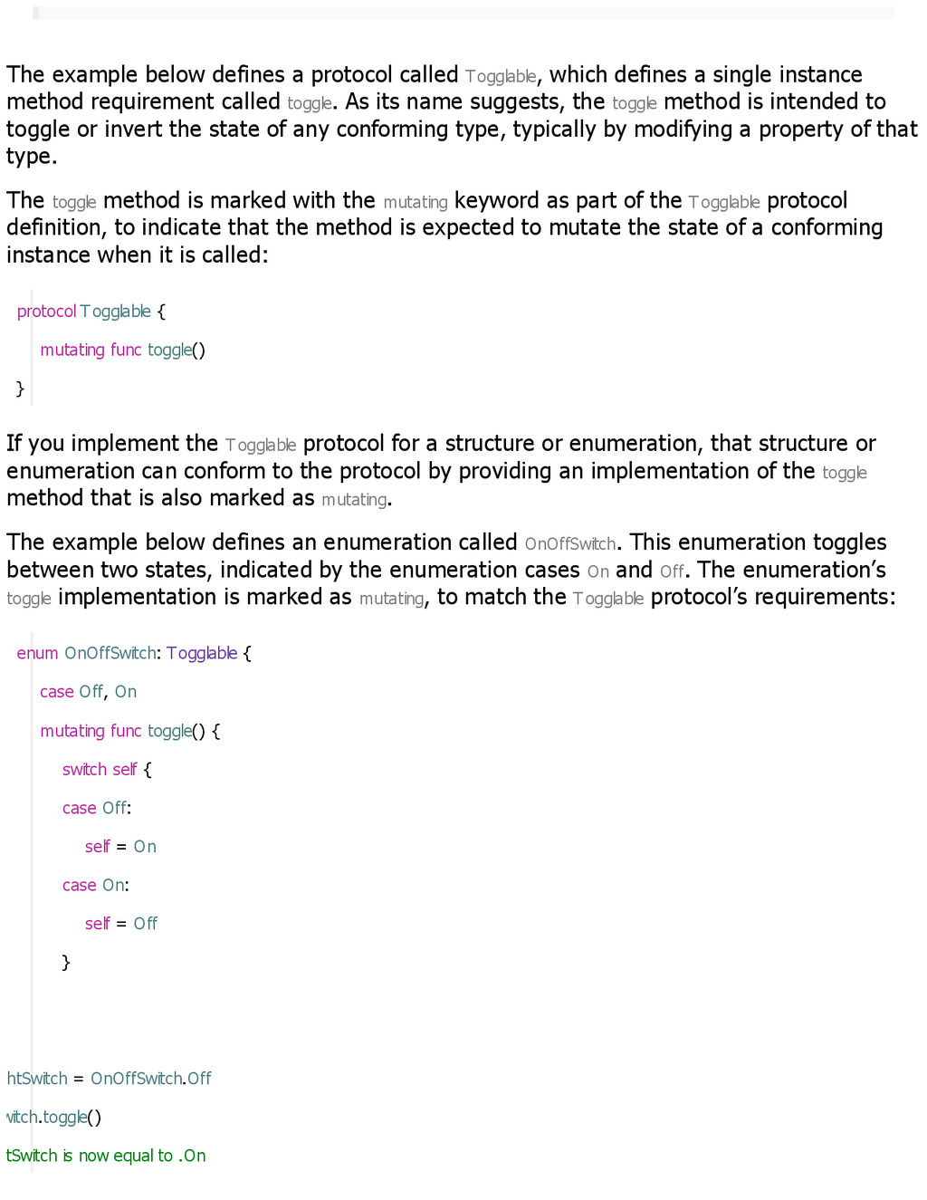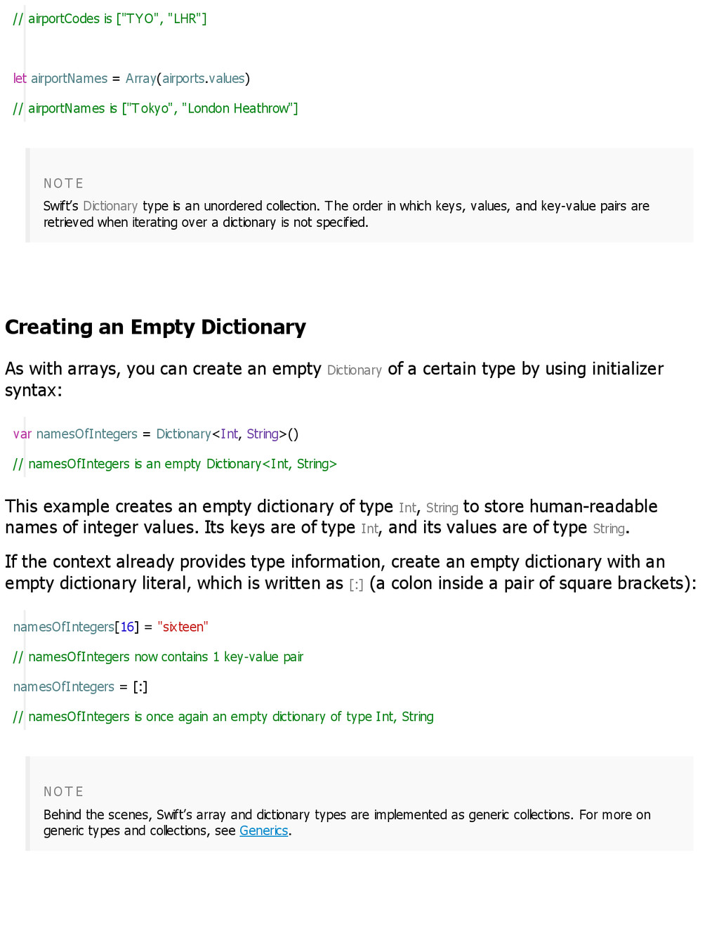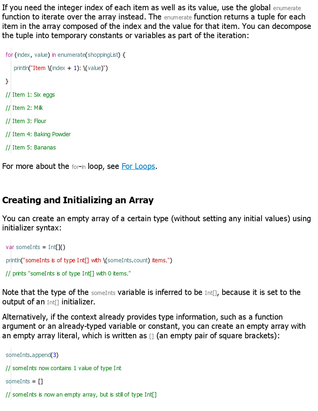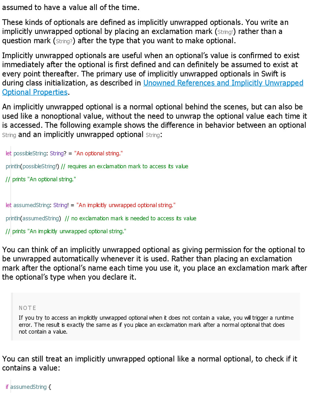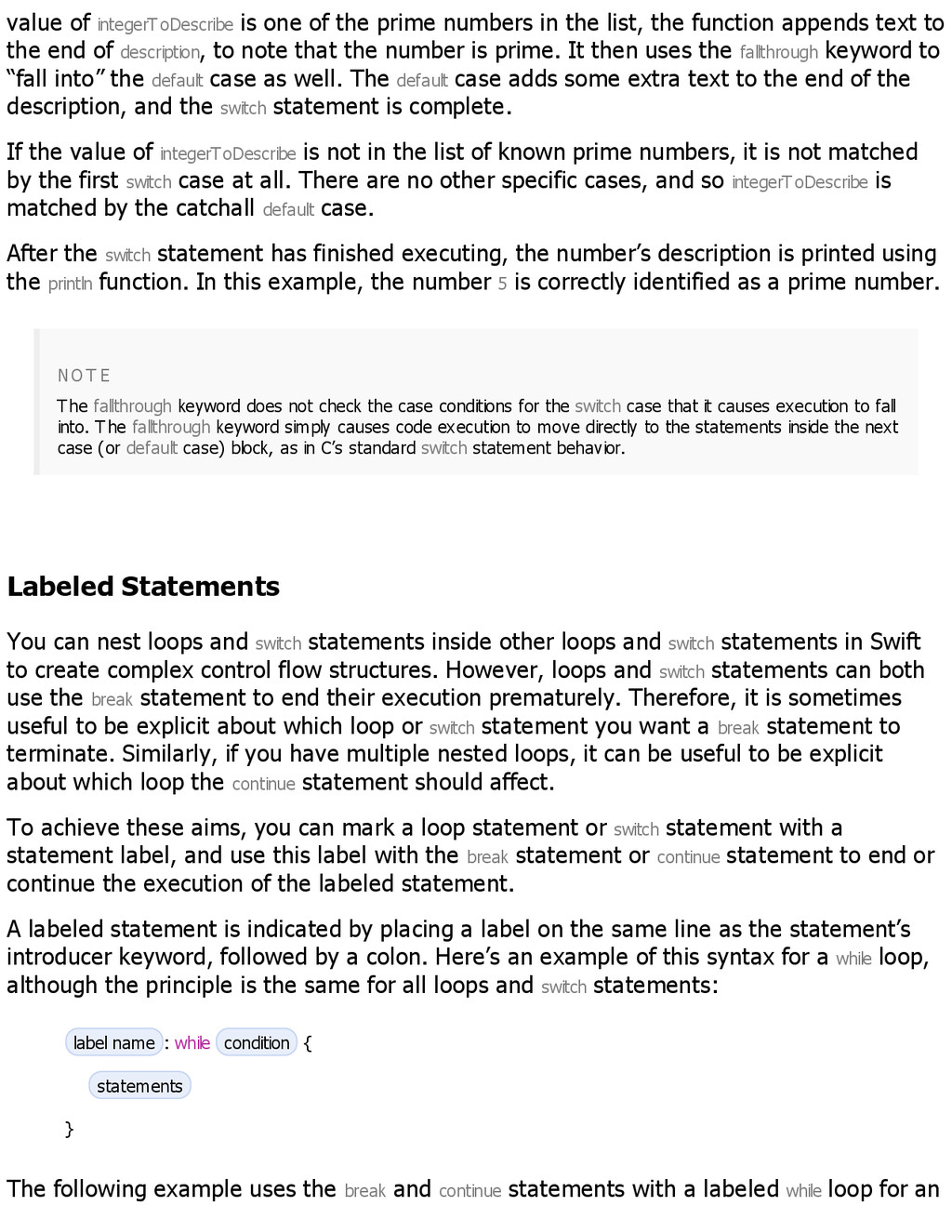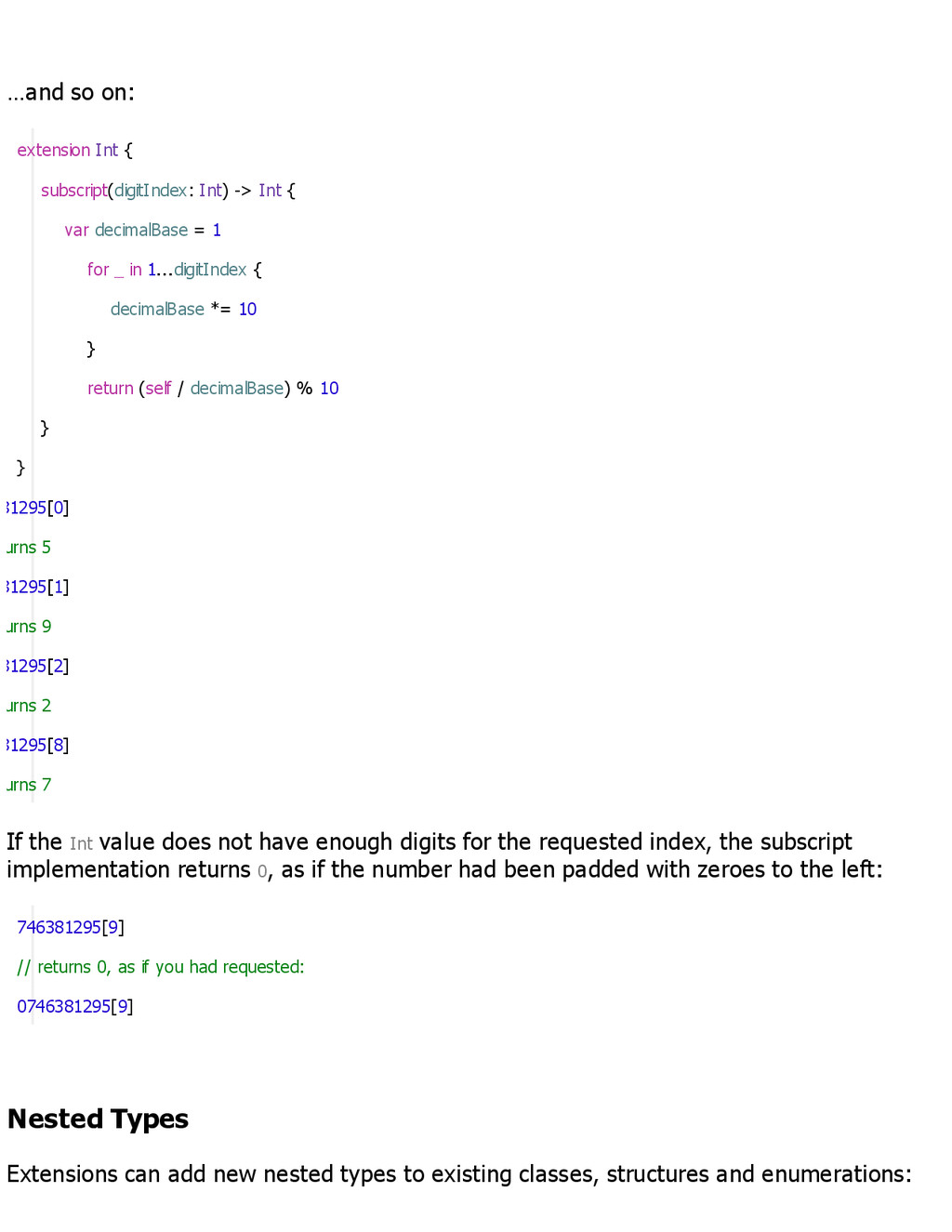 it will return a value must always do so. A function with a defined return type cannot allow control to fall out of the bottom of the function without returning a value, and attempting to do so will result in a compile-time error. Functions with Multiple Return Values You can use a tuple type as the return type for a function to return multiple values as part of one compound return value. The example below defines a function called count, which counts the number of vowels, consonants, and other characters in a string, based on the standard set of vowels and consonants used in American English: func count(string: String) -> (vowels: Int, consonants: Int, others: Int) { var vowels = 0, consonants = 0, others = 0 for character in string { switch String(character).lowercaseString { case "a", "e", "i", "o", "u": ++vowels case "b", "c", "d", "f", "g", "h", "j", "k", "l", "m", "n", "p", "q", "r", "s", "t", "v", "w", "x", "y", "z": ++consonants default: ++others } eturn (vowels, consonants, others) You can use this count function to count the characters in an arbitrary string, and to retrieve the counted totals as a tuple of three named Int values: let total = count("some arbitrary string!") println("\(total.vowels) vowels and \(total.consonants) consonants")