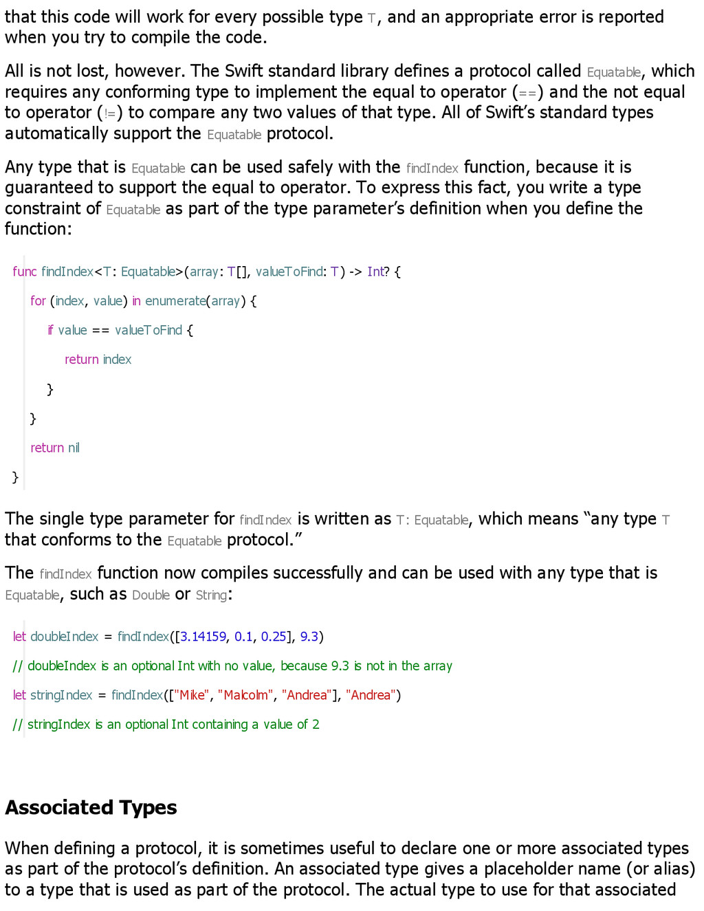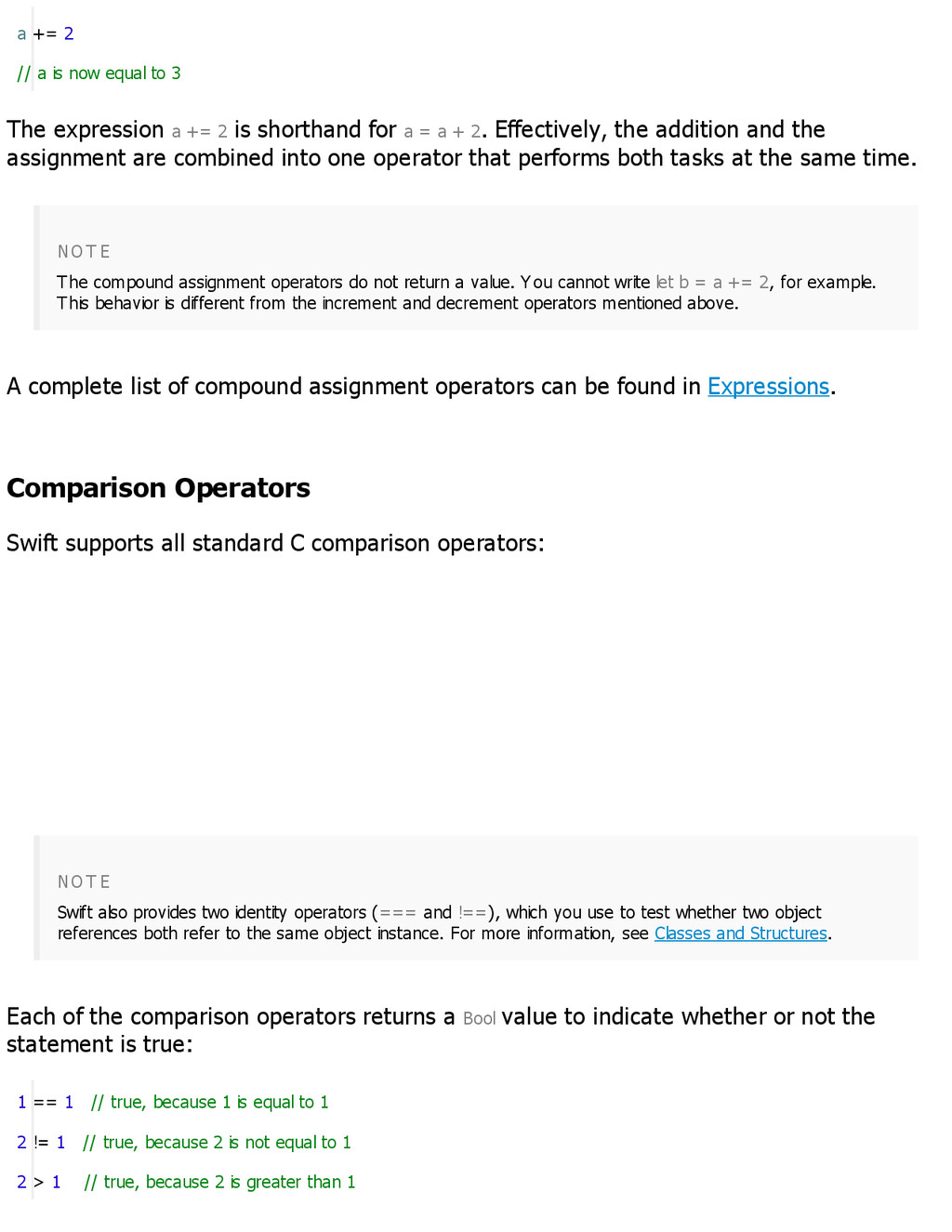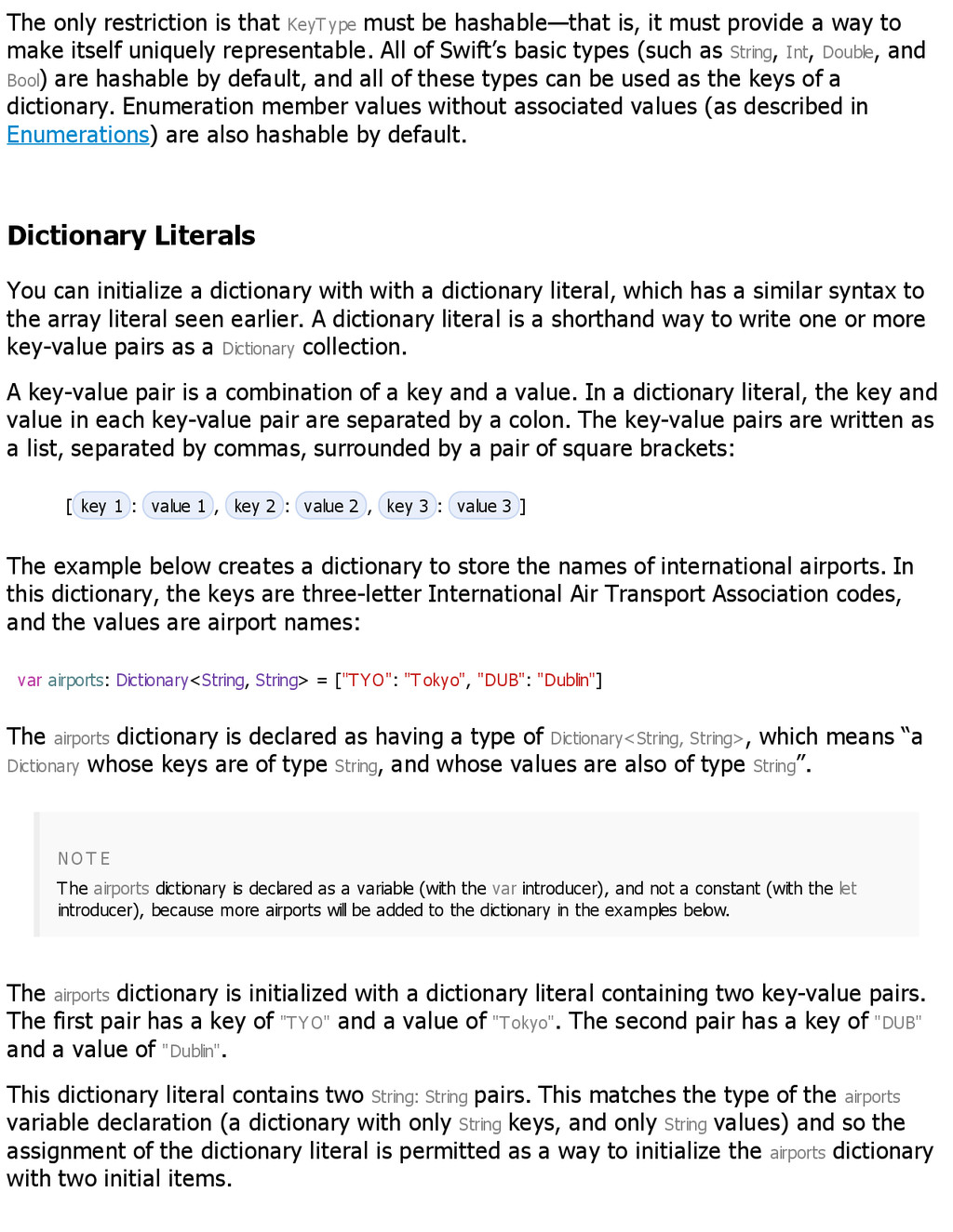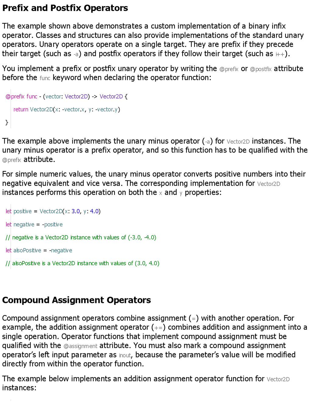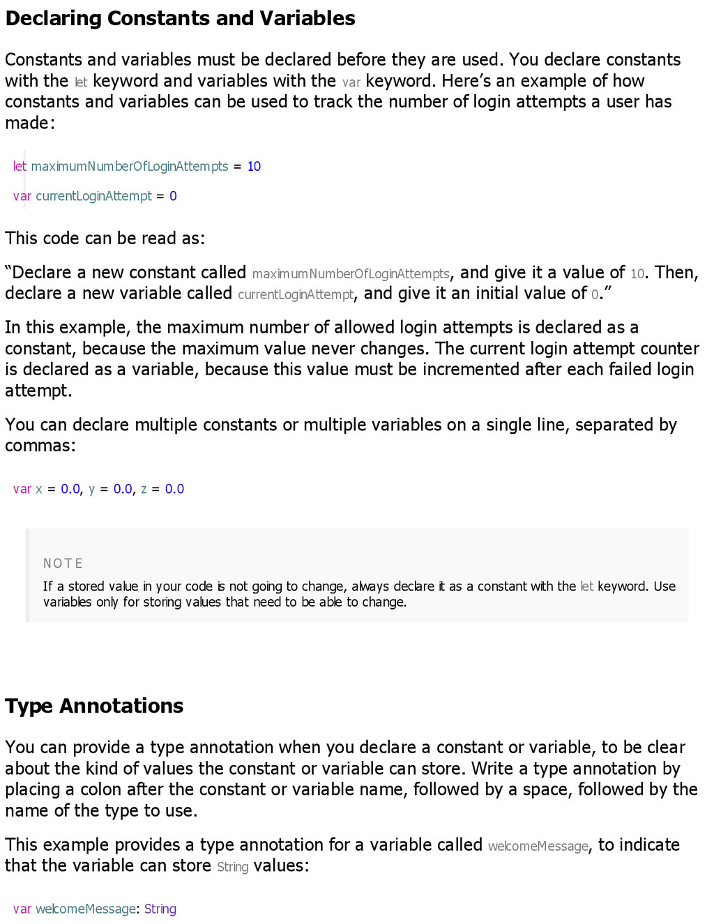 it will return a value must always do so. A function with a defined return type cannot allow control to fall out of the bottom of the function without returning a value, and attempting to do so will result in a compile-time error. Functions with Multiple Return Values You can use a tuple type as the return type for a function to return multiple values as part of one compound return value. The example below defines a function called count, which counts the number of vowels, consonants, and other characters in a string, based on the standard set of vowels and consonants used in American English: func count(string: String) -> (vowels: Int, consonants: Int, others: Int) { var vowels = 0, consonants = 0, others = 0 for character in string { switch String(character).lowercaseString { case "a", "e", "i", "o", "u": ++vowels case "b", "c", "d", "f", "g", "h", "j", "k", "l", "m", "n", "p", "q", "r", "s", "t", "v", "w", "x", "y", "z": ++consonants default: ++others } eturn (vowels, consonants, others) You can use this count function to count the characters in an arbitrary string, and to retrieve the counted totals as a tuple of three named Int values: let total = count("some arbitrary string!") println("\(total.vowels) vowels and \(total.consonants) consonants")
