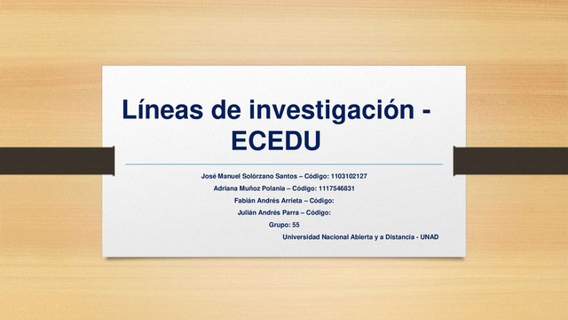 Es de carácter funcional Se interesa por el reconocimiento, respeto y potenciación de la diversidad de la infancia y la influencia que pueden tener los espacios educativos y sus diversos actores. Promover alternativas de construcción y fortalecimiento de espacios educativos para las infancias. Proponer y acompañar espacios de investigación formativa para los estudiantes de la UNAD Visibilidad, gestión del conocimiento y educación inclusiva Es de carácter funcional Busca desarrollar procesos de investigación sobre educación inclusiva y gestión del conocimiento de poblaciones diversas, para generar prácticas de visibilización y reconocimiento, con el uso de las tecnologías de la información y la comunicación Línea filosofía y educación Es de carácter funcional Gira en torno a la gestación de un hombre nuevo y de una sociedad alternativa que se apasione por la libertad y que responda a las necesidades del hombre actual brindándole herramientas para recrear nuevas generaciones Hacer de la educación un espacio dinámico mediante los presupuestos filosóficos de la sabiduría y el conocimiento Analizar desde la filosofía el sentido de la educación a través de nuevas tecnologías, y los procesos de apropiación de conocimiento y su impacto en la realidad. Historia y prospectiva de la educación abierta y a distancia Es de carácter funcional Busca motivar a los docentes, tutores, estudiantes, entre otros para que reconozcan la historia y comprendan los distintos procesos de educación abierta y a distancia que se han dado en Colombia Construir propuestas de educación abierta y a distancia que faciliten el desarrollo integral de la humanidad.