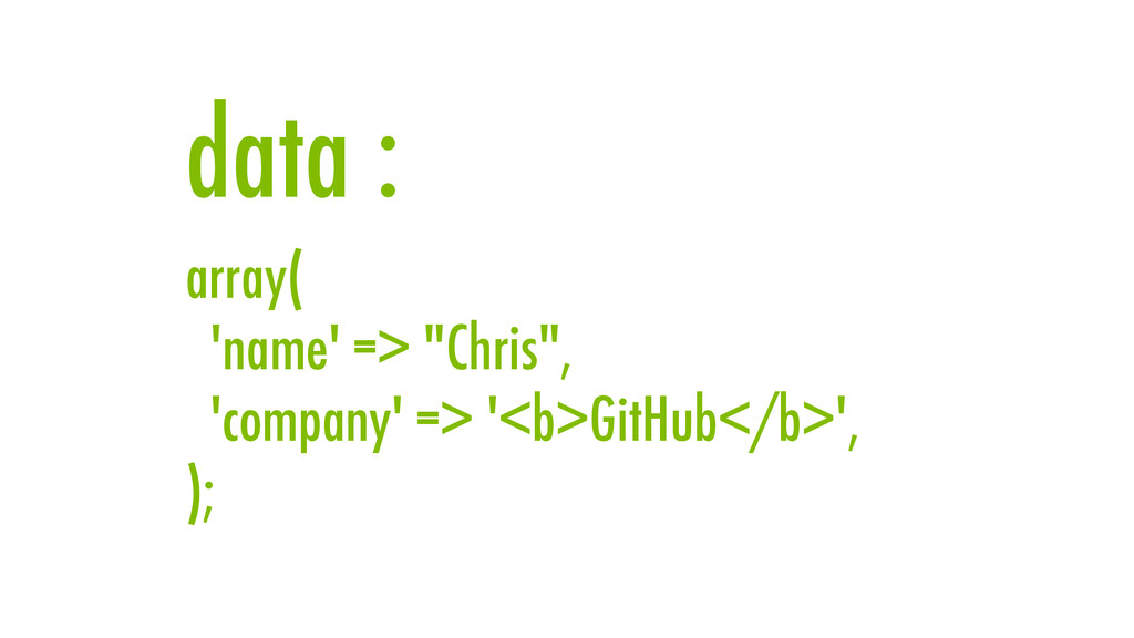 data : array( 'name' => "Chris", 'company' => '<b>GitHub</b>', );