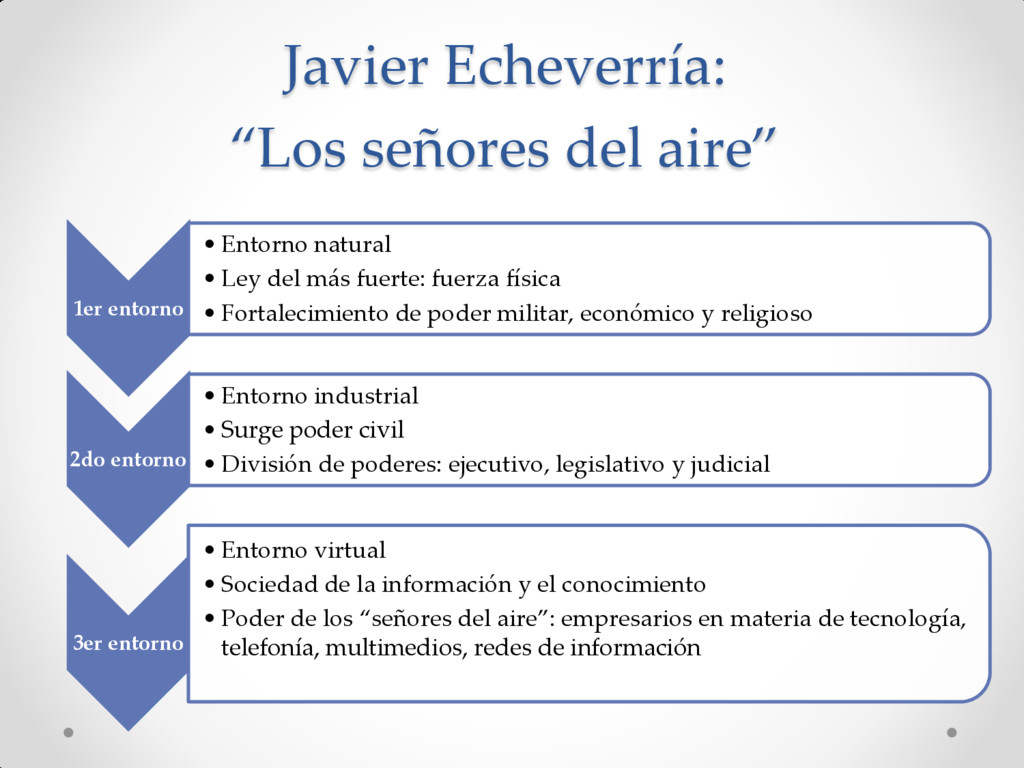 fuerza física • Fortalecimiento de poder militar, económico y religioso 2do entorno • Entorno industrial • Surge poder civil • División de poderes: ejecutivo, legislativo y judicial 3er entorno • Entorno virtual • Sociedad de la información y el conocimiento • Poder de los “señores del aire”: empresarios en materia de tecnología, telefonía, multimedios, redes de información Javier Echeverría: “Los señores del aire”