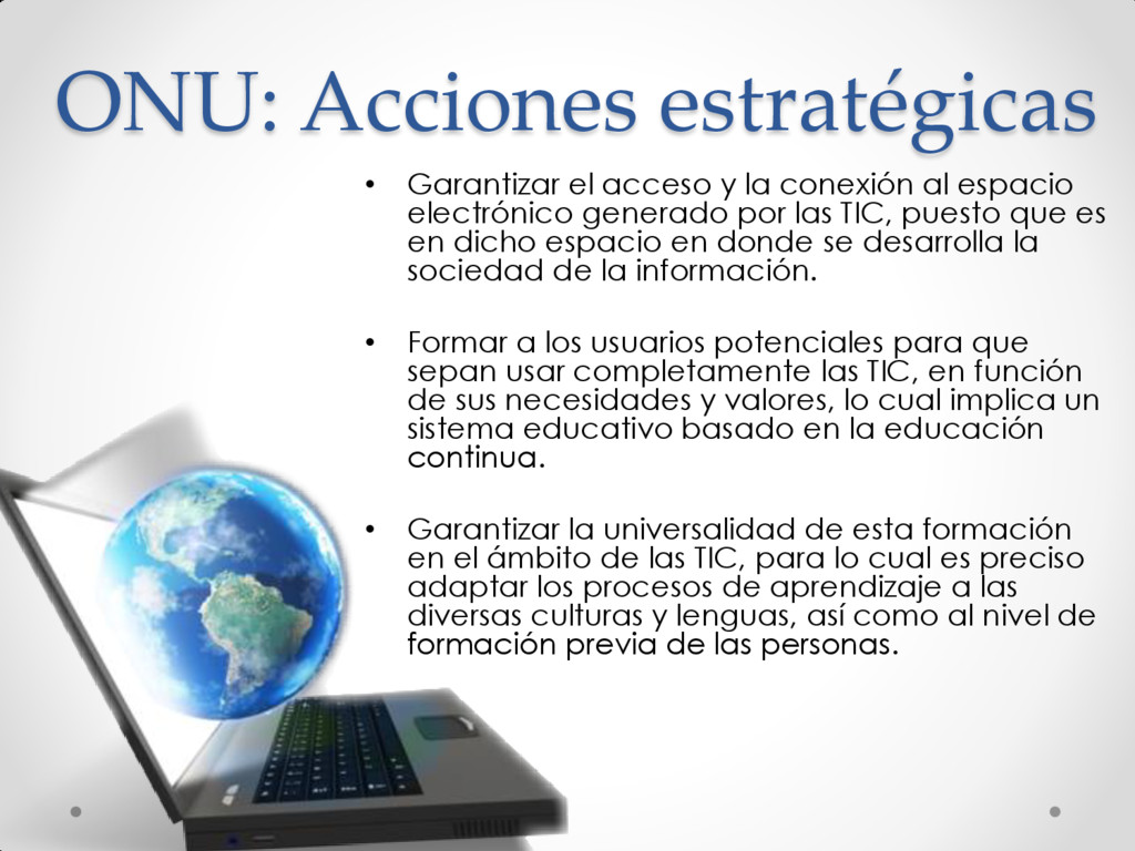 al espacio electrónico generado por las TIC, puesto que es en dicho espacio en donde se desarrolla la sociedad de la información. • Formar a los usuarios potenciales para que sepan usar completamente las TIC, en función de sus necesidades y valores, lo cual implica un sistema educativo basado en la educación continua. • Garantizar la universalidad de esta formación en el ámbito de las TIC, para lo cual es preciso adaptar los procesos de aprendizaje a las diversas culturas y lenguas, así como al nivel de formación previa de las personas.