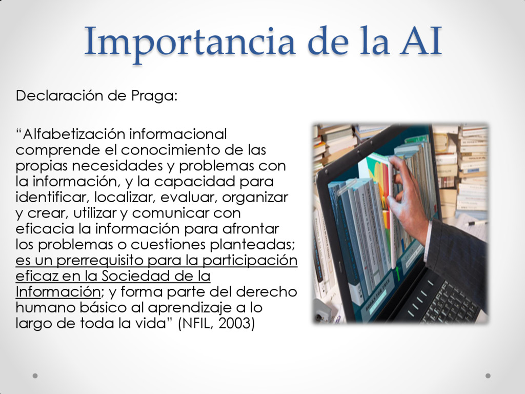 el conocimiento de las propias necesidades y problemas con la información, y la capacidad para identificar, localizar, evaluar, organizar y crear, utilizar y comunicar con eficacia la información para afrontar los problemas o cuestiones planteadas; es un prerrequisito para la participación eficaz en la Sociedad de la Información; y forma parte del derecho humano básico al aprendizaje a lo largo de toda la vida” (NFIL, 2003)