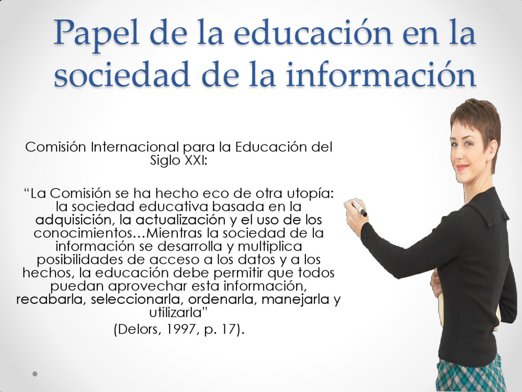 Comisión Internacional para la Educación del Siglo XXI: “La Comisión se ha hecho eco de otra utopía: la sociedad educativa basada en la adquisición, la actualización y el uso de los conocimientos…Mientras la sociedad de la información se desarrolla y multiplica posibilidades de acceso a los datos y a los hechos, la educación debe permitir que todos puedan aprovechar esta información, recabarla, seleccionarla, ordenarla, manejarla y utilizarla” (Delors, 1997, p. 17).