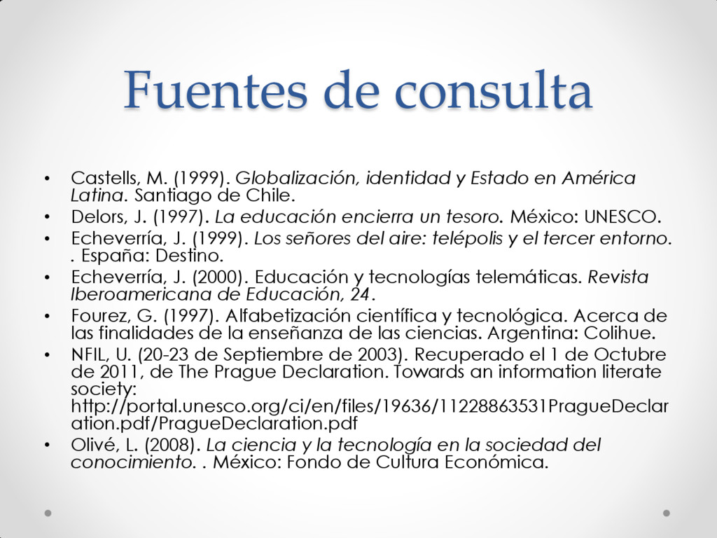 Estado en América Latina. Santiago de Chile. • Delors, J. (1997). La educación encierra un tesoro. México: UNESCO. • Echeverría, J. (1999). Los señores del aire: telépolis y el tercer entorno. . España: Destino. • Echeverría, J. (2000). Educación y tecnologías telemáticas. Revista Iberoamericana de Educación, 24. • Fourez, G. (1997). Alfabetización científica y tecnológica. Acerca de las finalidades de la enseñanza de las ciencias. Argentina: Colihue. • NFIL, U. (20-23 de Septiembre de 2003). Recuperado el 1 de Octubre de 2011, de The Prague Declaration. Towards an information literate society: http://portal.unesco.org/ci/en/files/19636/11228863531PragueDeclar ation.pdf/PragueDeclaration.pdf • Olivé, L. (2008). La ciencia y la tecnología en la sociedad del conocimiento. . México: Fondo de Cultura Económica.