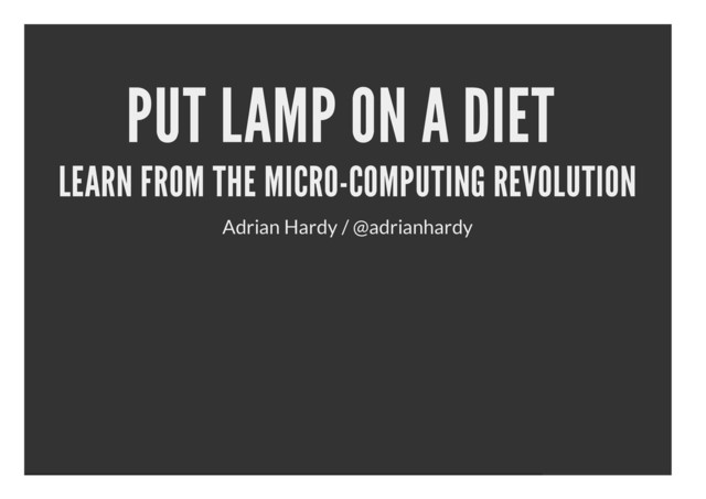 As web programmers, we’ve been spoilt with the luxury of powerful servers as the cost of memory and processing power plummets. The advent of the micro-computer (e.g. the ubiquitous Raspberry PI) has meant that we’re now back to a constrained environment. To paraphrase a famous misquote; “256MB RAM ought to be enough for anybody”. This talk is about getting the overhead of your web stack down. For database and web services and the PHP binaries themselves, we’ll discuss the process of finding lightweight replacements for PHP’s usual entourage. Once the stack is trimmed down, we then need to refocus on our choice of frameworks and even approaches to writing memory and CPU efficient applications. Being sensitive to resource consumption shouldn’t be a novelty. While no-one wants to advocate premature optimisation, if you know what you can squeeze out of PHP’s stack in a memory constrained environment, you should be able to take those principles when approaching a problem more conventional hardware.
