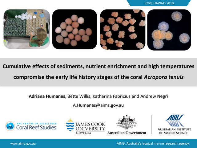 Adriana Humanes, Bette Willis, Katharina Fabricius and Andrew Negri [email protected] Cumulative effects of sediments, nutrient enrichment and high temperatures compromise the early life history stages of the coral Acropora tenuis