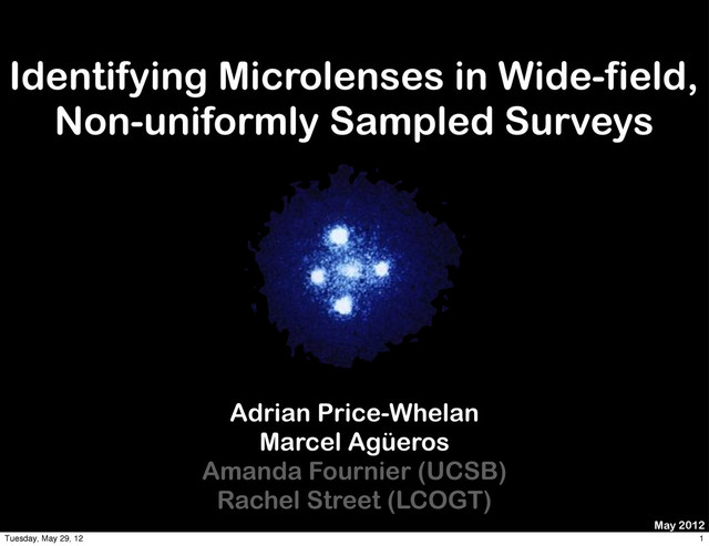 out microlensing events Run Amanda’s code for a single cluster, compare to observations Predict microlensing signal in PTF, then run our code on the entire archive Real-time identifier? LSST? May 2012 28 Tuesday, May 29, 12