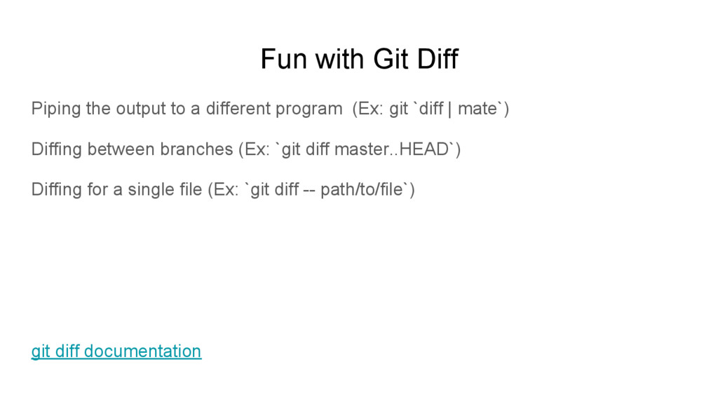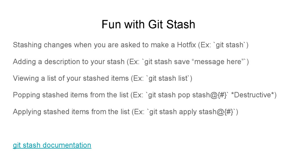 to make a Hotfix (Ex: `git stash`) Adding a description to your stash (Ex: `git stash save “message here”`) Viewing a list of your stashed items (Ex: `git stash list`) Popping stashed items from the list (Ex: `git stash pop stash@{#}` *Destructive*) Applying stashed items from the list (Ex: `git stash apply stash@{#}`) git stash documentation