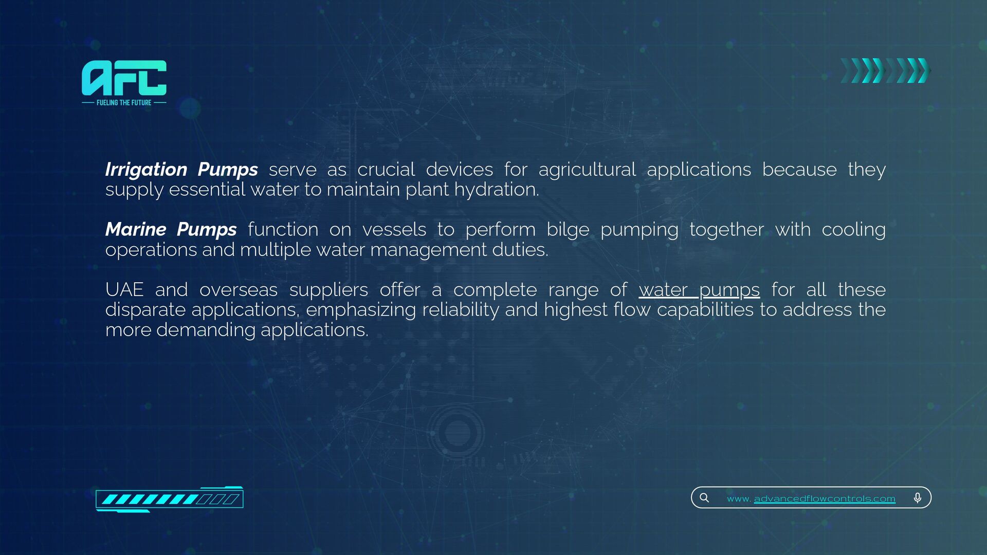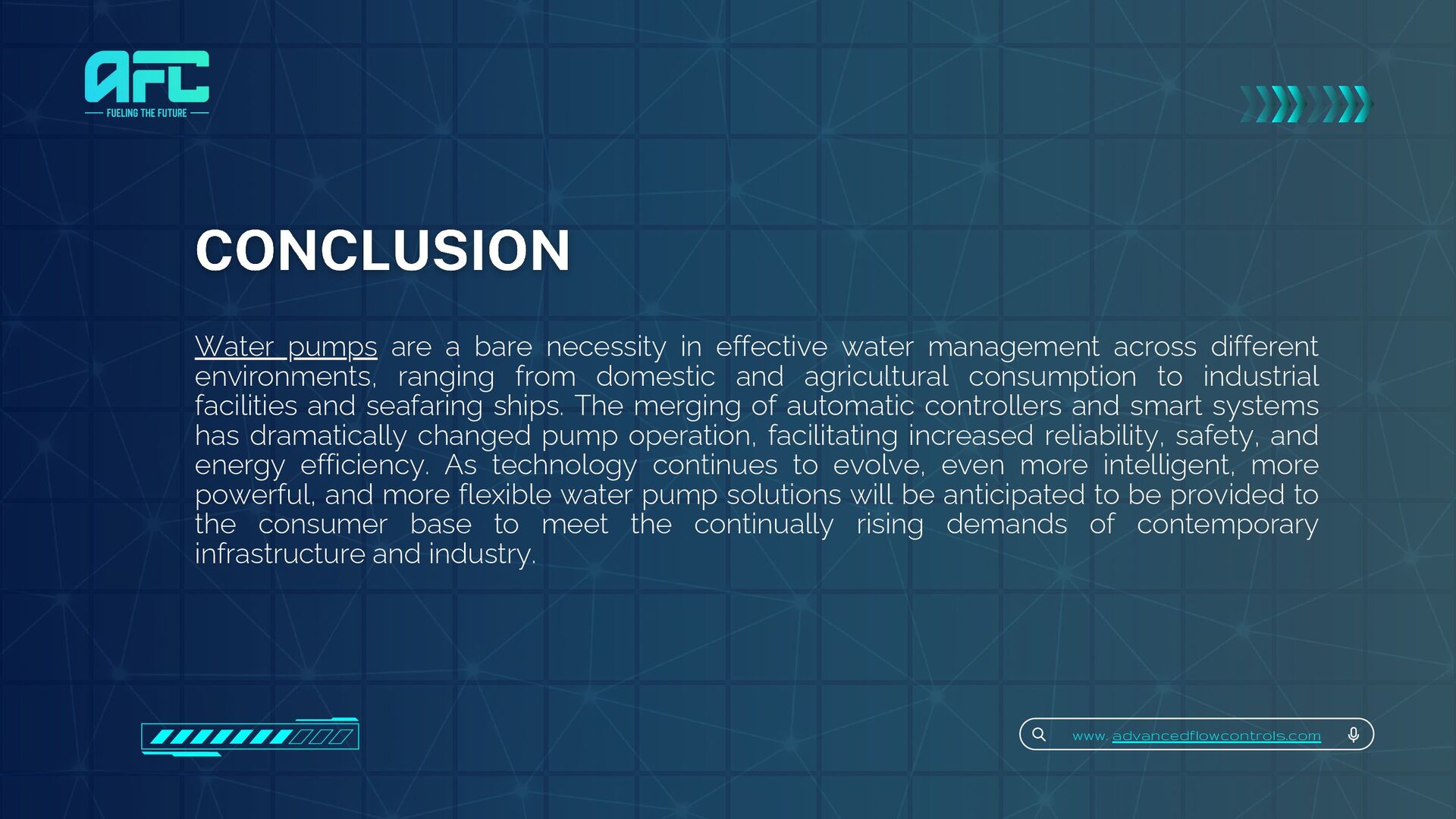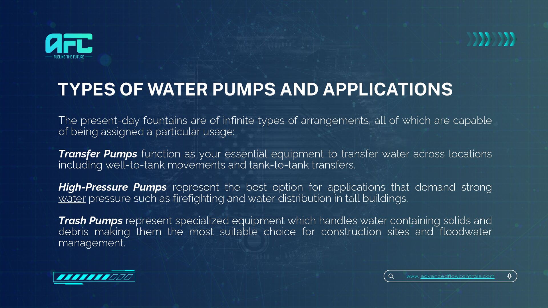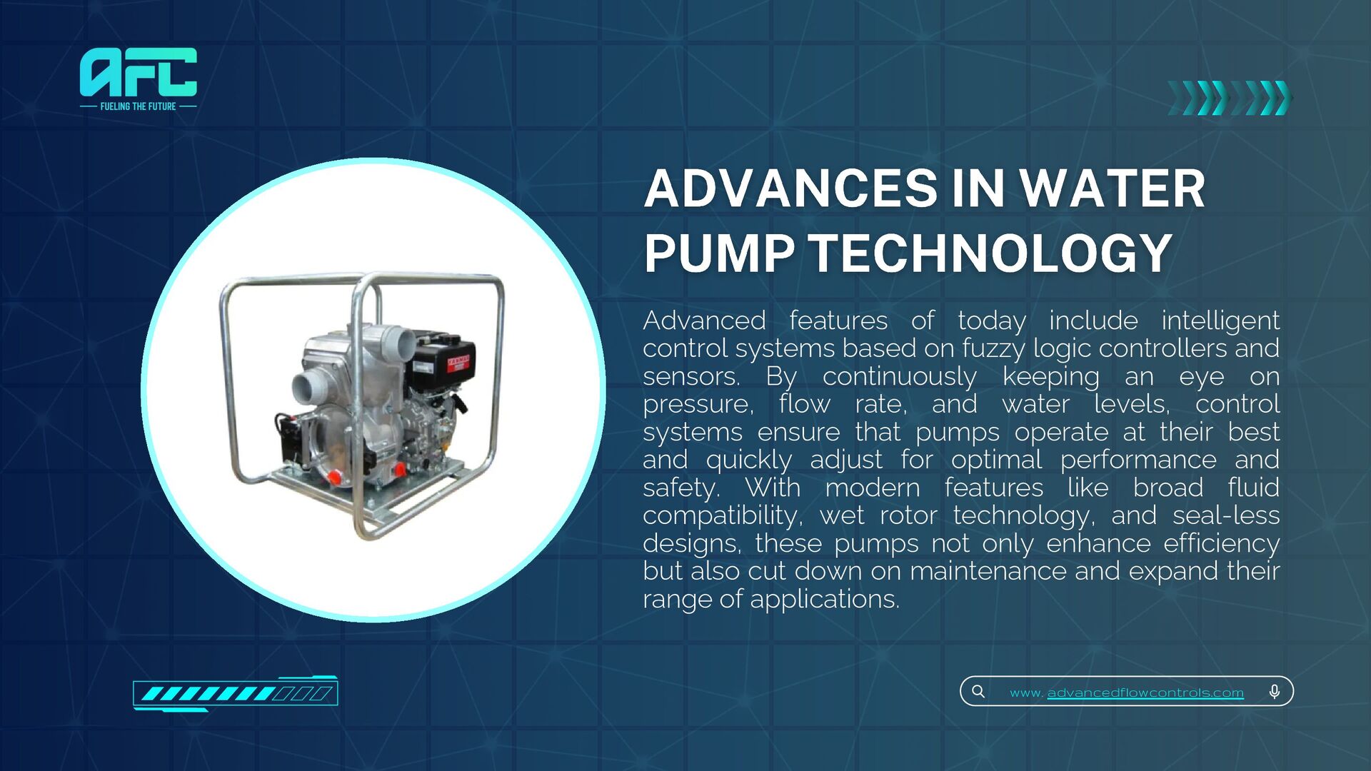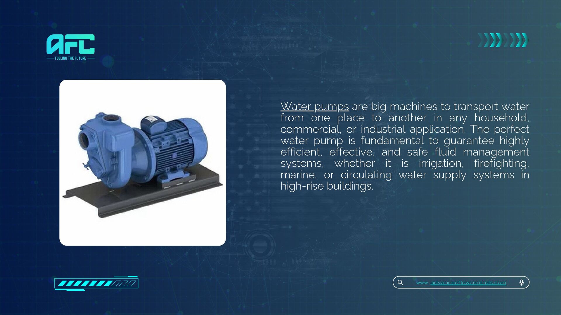 across different environments, ranging from domestic and agricultural consumption to industrial facilities and seafaring ships. The merging of automatic controllers and smart systems has dramatically changed pump operation, facilitating increased reliability, safety, and energy efficiency. As technology continues to evolve, even more intelligent, more powerful, and more flexible water pump solutions will be anticipated to be provided to the consumer base to meet the continually rising demands of contemporary infrastructure and industry. www. advancedflowcontrols.com