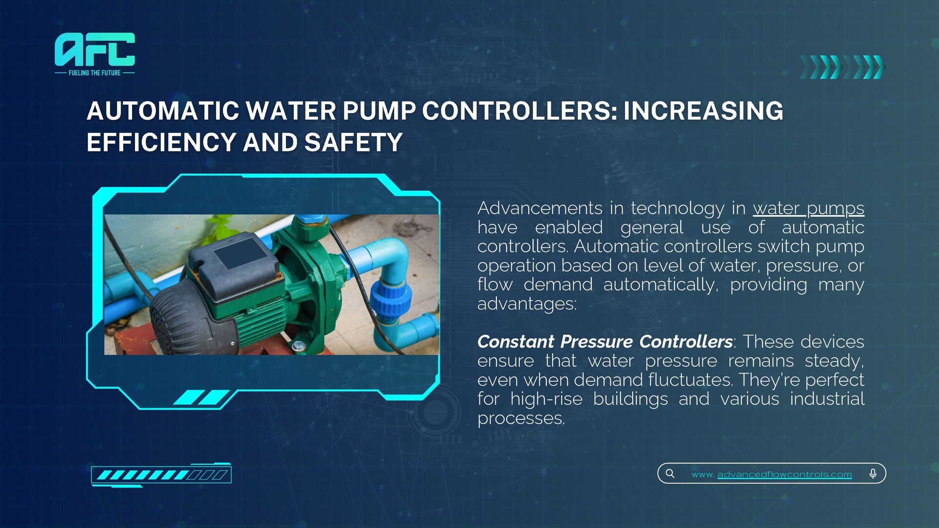 of automatic controllers. Automatic controllers switch pump operation based on level of water, pressure, or flow demand automatically, providing many advantages: Constant Pressure Controllers: These devices ensure that water pressure remains steady, even when demand fluctuates. They’re perfect for high-rise buildings and various industrial processes. www. advancedflowcontrols.com