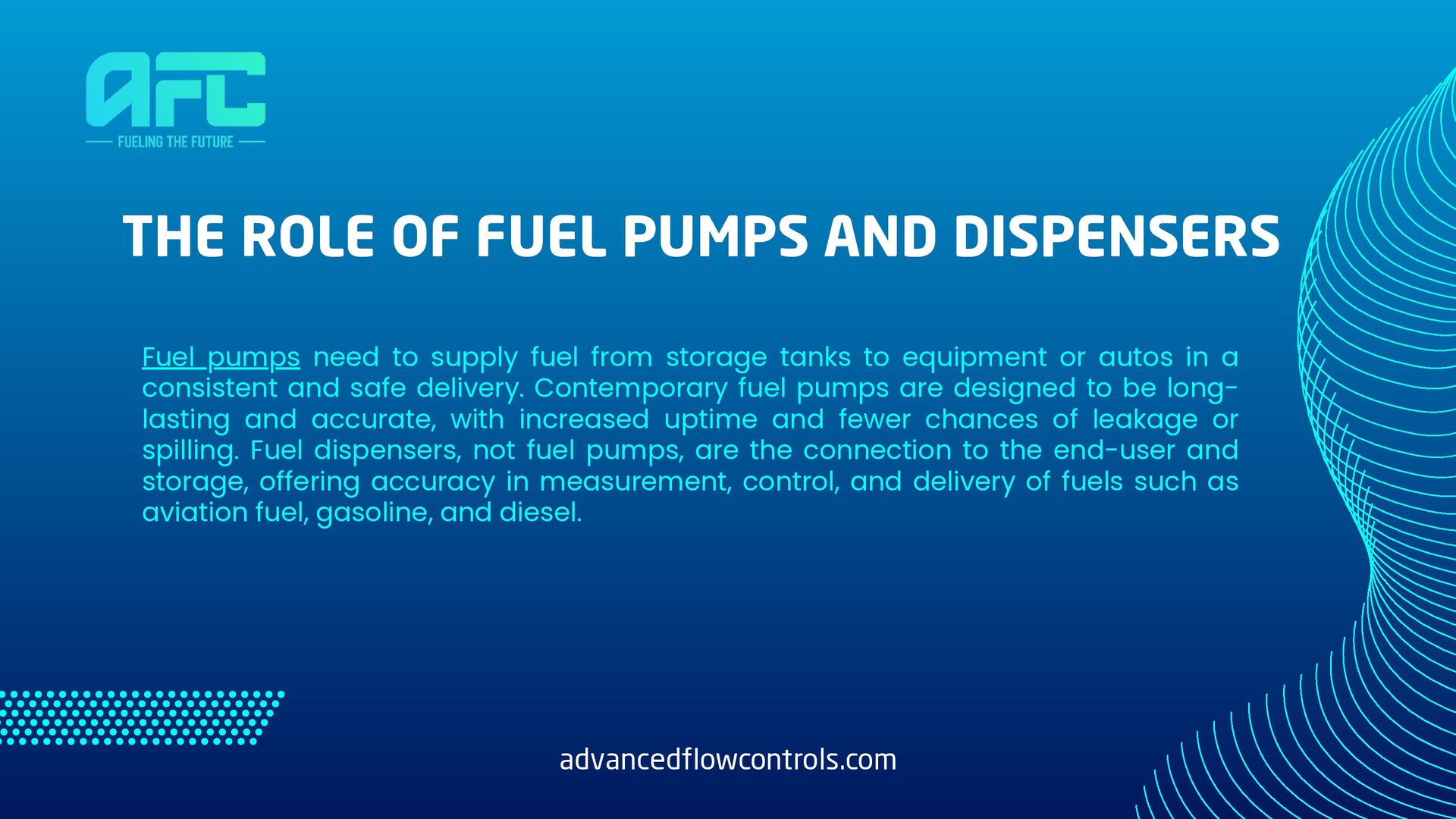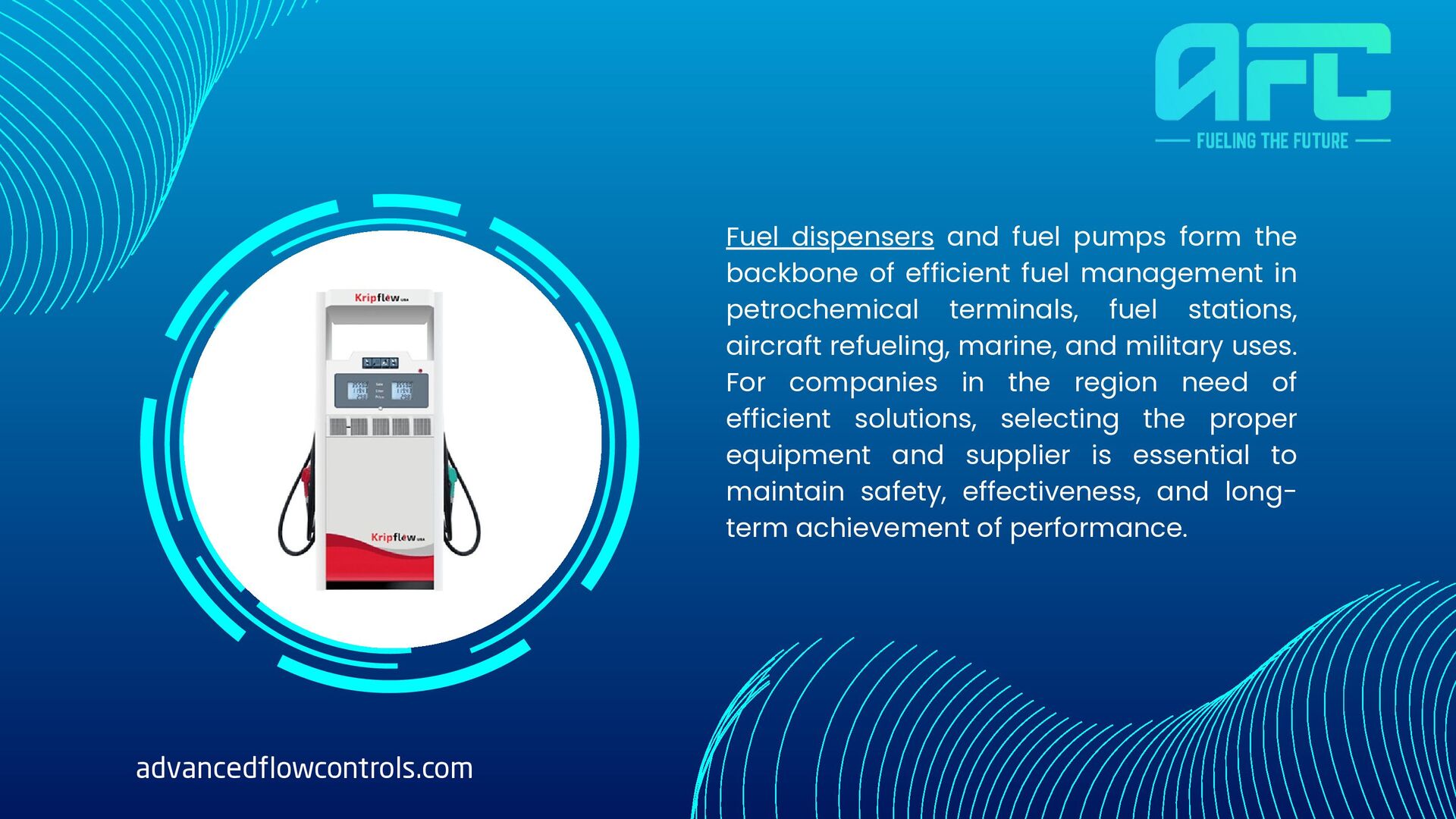 to supply fuel from storage tanks to equipment or autos in a consistent and safe delivery. Contemporary fuel pumps are designed to be long- lasting and accurate, with increased uptime and fewer chances of leakage or spilling. Fuel dispensers, not fuel pumps, are the connection to the end-user and storage, offering accuracy in measurement, control, and delivery of fuels such as aviation fuel, gasoline, and diesel. advancedflowcontrols.com