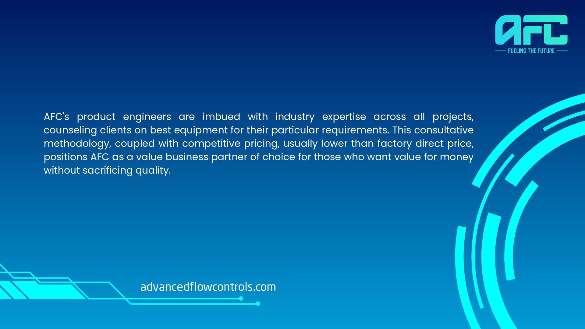 projects, counseling clients on best equipment for their particular requirements. This consultative methodology, coupled with competitive pricing, usually lower than factory direct price, positions AFC as a value business partner of choice for those who want value for money without sacrificing quality. advancedflowcontrols.com