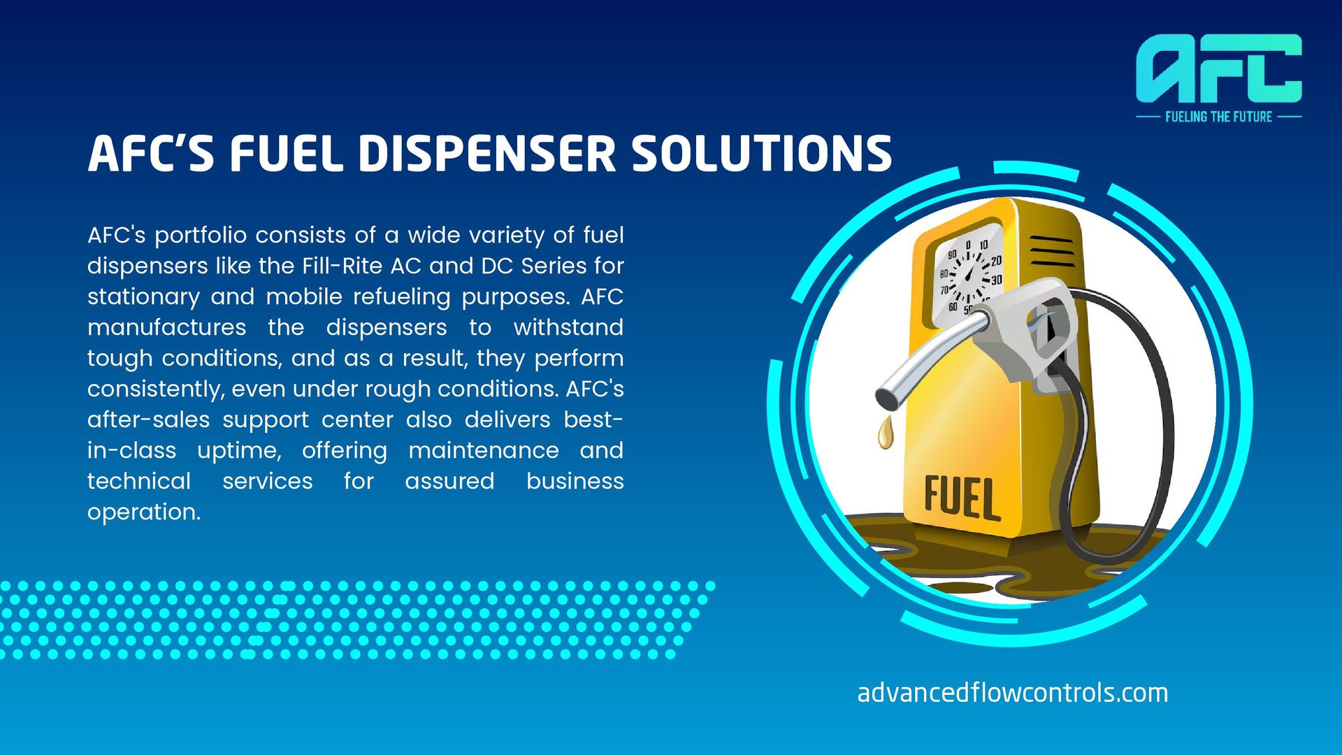 variety of fuel dispensers like the Fill-Rite AC and DC Series for stationary and mobile refueling purposes. AFC manufactures the dispensers to withstand tough conditions, and as a result, they perform consistently, even under rough conditions. AFC's after-sales support center also delivers best- in-class uptime, offering maintenance and technical services for assured business operation. advancedflowcontrols.com