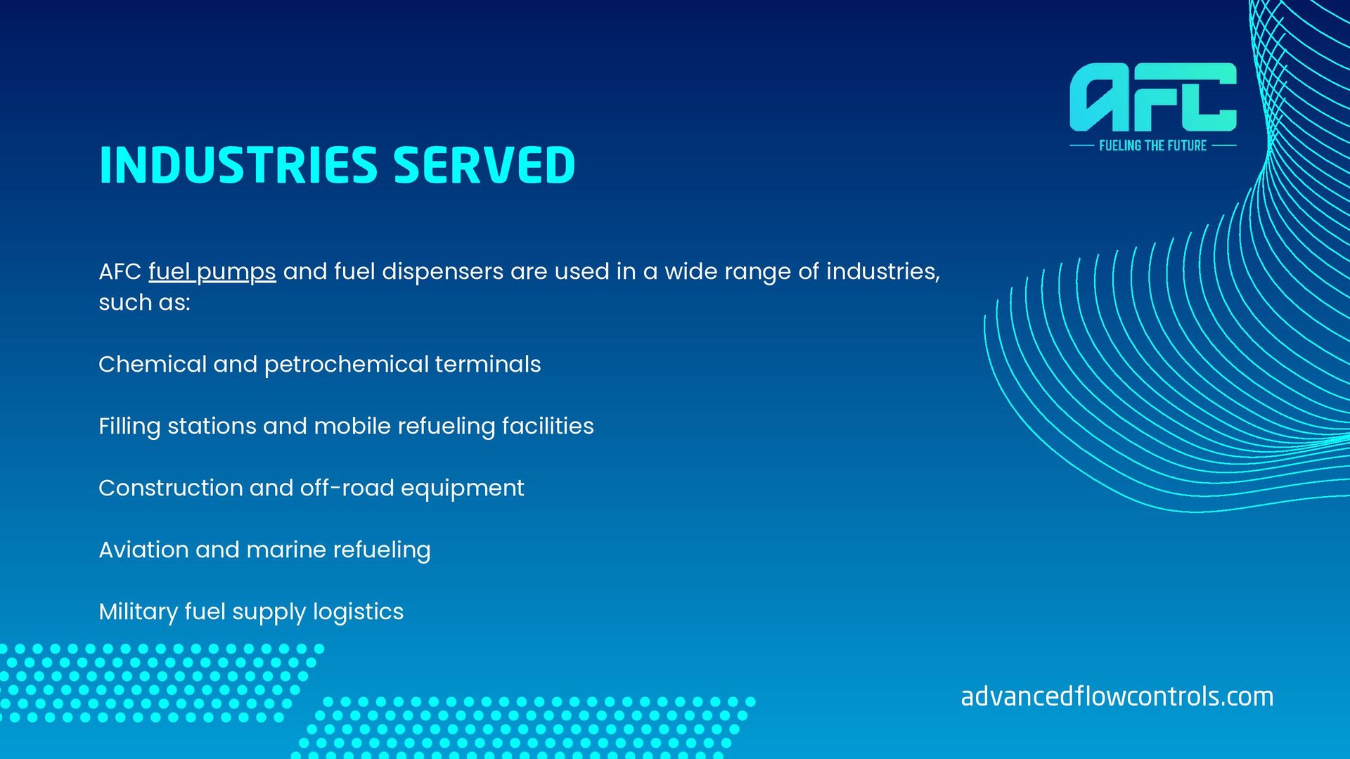 wide range of industries, such as: Chemical and petrochemical terminals Filling stations and mobile refueling facilities Construction and off-road equipment Aviation and marine refueling Military fuel supply logistics INDUSTRIES SERVED advancedflowcontrols.com