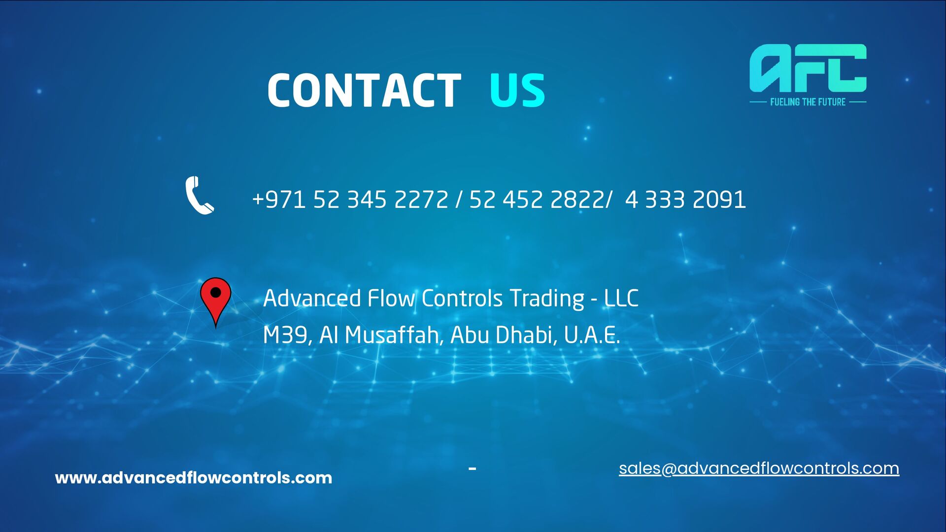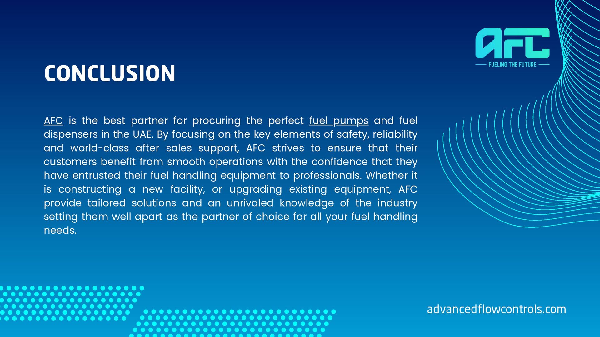pumps and fuel dispensers in the UAE. By focusing on the key elements of safety, reliability and world-class after sales support, AFC strives to ensure that their customers benefit from smooth operations with the confidence that they have entrusted their fuel handling equipment to professionals. Whether it is constructing a new facility, or upgrading existing equipment, AFC provide tailored solutions and an unrivaled knowledge of the industry setting them well apart as the partner of choice for all your fuel handling needs. CONCLUSION advancedflowcontrols.com