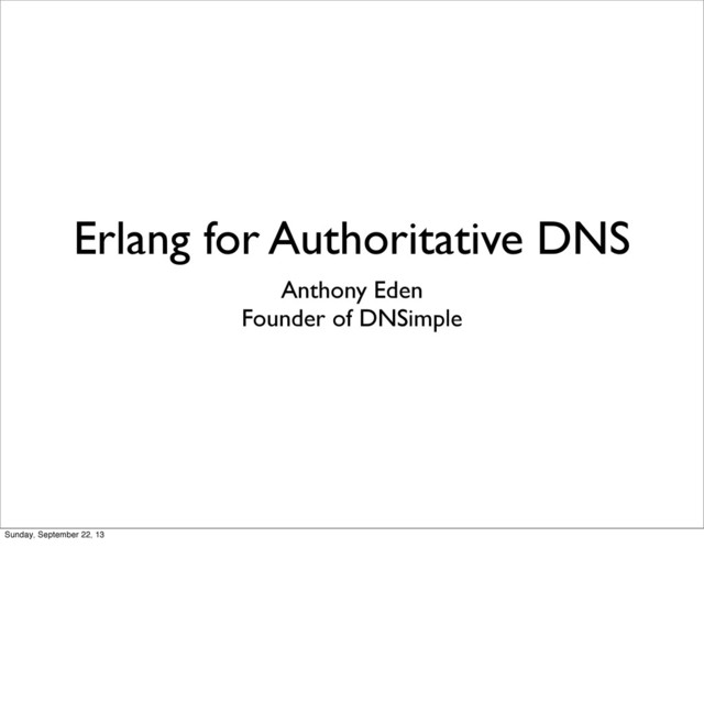 You should never write an authoritative DNS server, but if you do, Erlang is a pretty good choice of language for implementing one. In this talk I will explain why we selected Erlang to develop our new authoritative DNS server for DNSimple. I will show you features of the language that were beneficial to the development of the system and I will present examples of code demonstrating how those features are used.