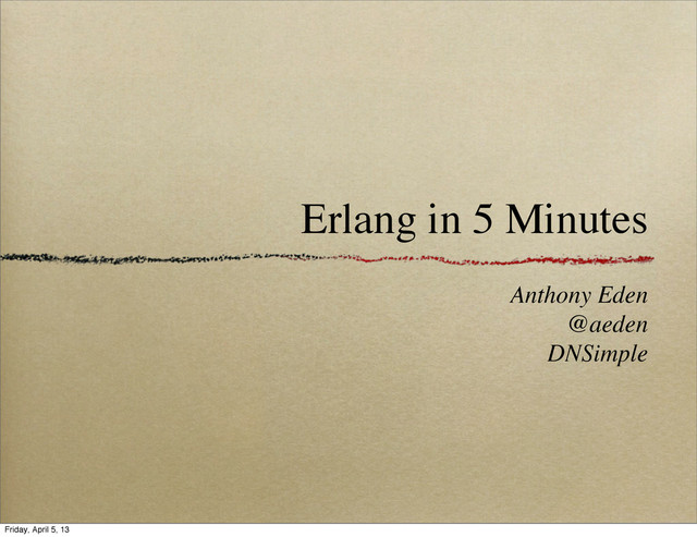 babble(NumberOfTimes) -> [spawn(fun() -> count(N) end) || N <- lists:seq(1, NumberOfTimes)]. 1> c(example3). {ok,example3} 2> example3:babble(100). [<0.38.0>,<0.39.0>,<0.40.0>,<0.41.0>,<0.42.0>,<0.43.0>, <0.44.0>,<0.45.0>,<0.46.0>,<0.47.0>,<0.48.0>,<0.49.0>, <0.62.0>,<0.63.0>,<0.64.0>,<0.65.0>,<0.66.0>|...] The number is 4 The number is 3 The number is 2 The number is 1 The number is 56 The number is 61 The number is 55 Friday, April 5, 13